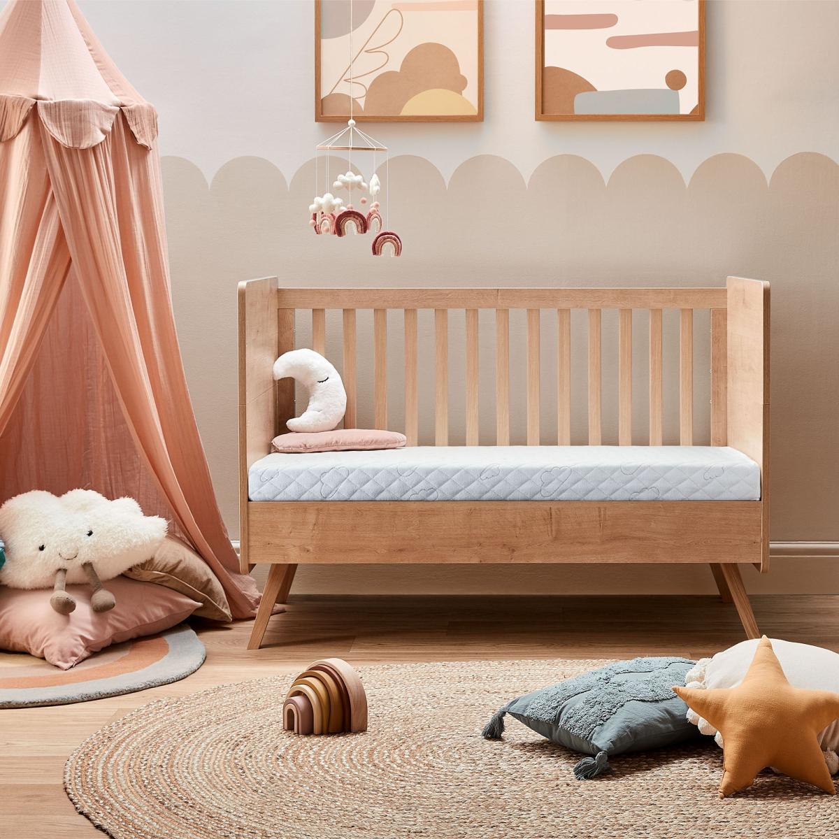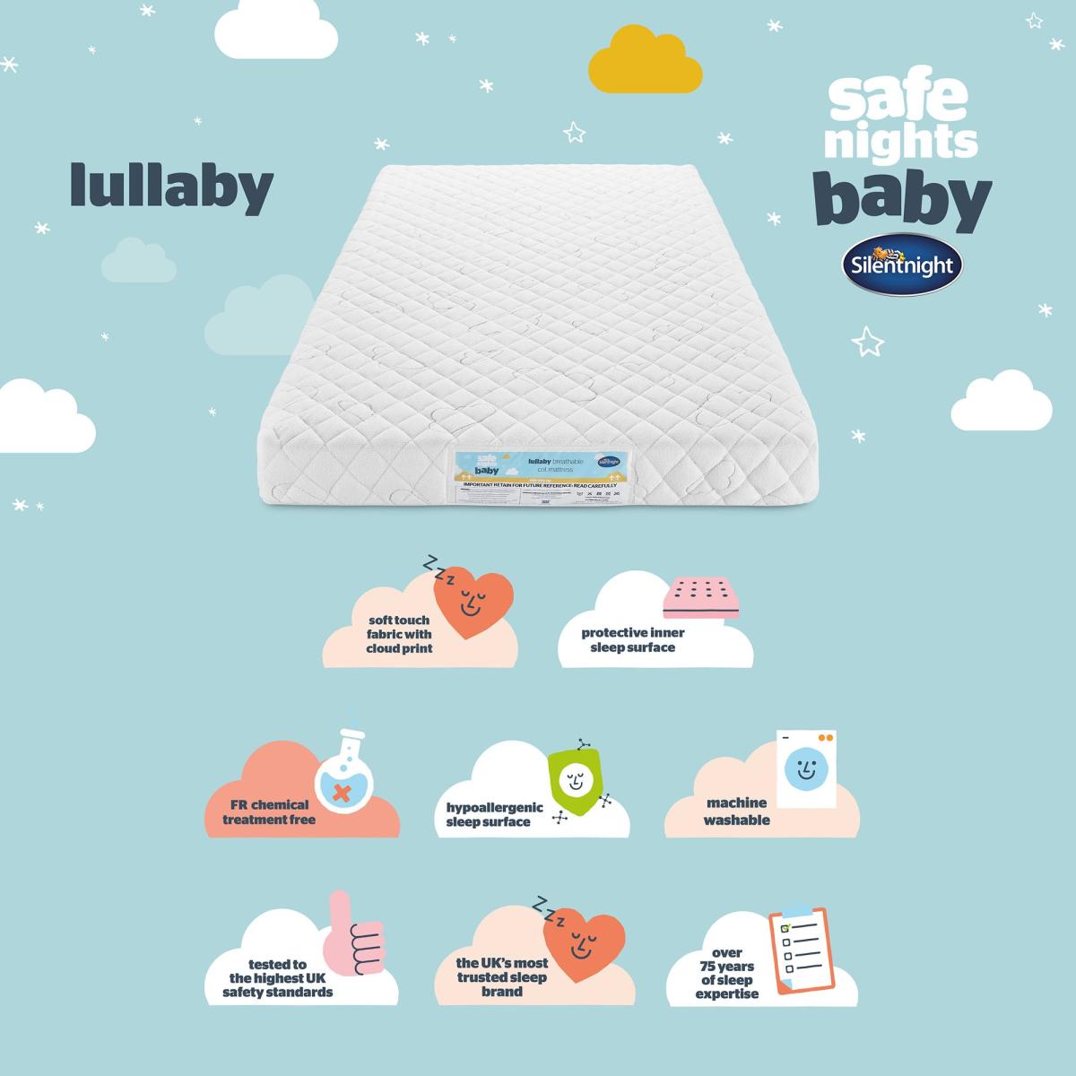 Silentnight's Lullaby Breathable Mattress provides a safe and comfortable sleeping environment for your little one. Our foam and chemical treatment-free mattress is designed with your baby's health in mind, featuring a hypoallergenic sleep surface and an extra-comfortable, breathable polyester core for a supportive and restful night's sleep. The beautiful and cosy soft-touch fabric with a cloud print design will add a touch of whimsy to your nursery. The washable cover makes it easy to clean and the cleverly designed core means the mattress can still be slept on whilst the outer cover is being washed. Our handmade construction in the UK with a 5-year guarantee provides peace of mind and longevity. Trust the UK's most trusted sleep brand, Silentnight, with over 75 years of sleep expertise to keep your baby sleeping soundly.