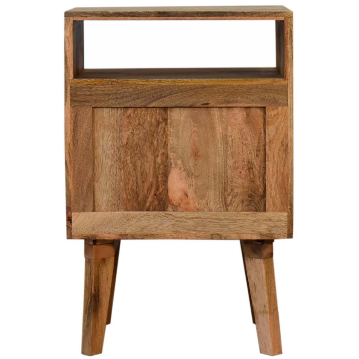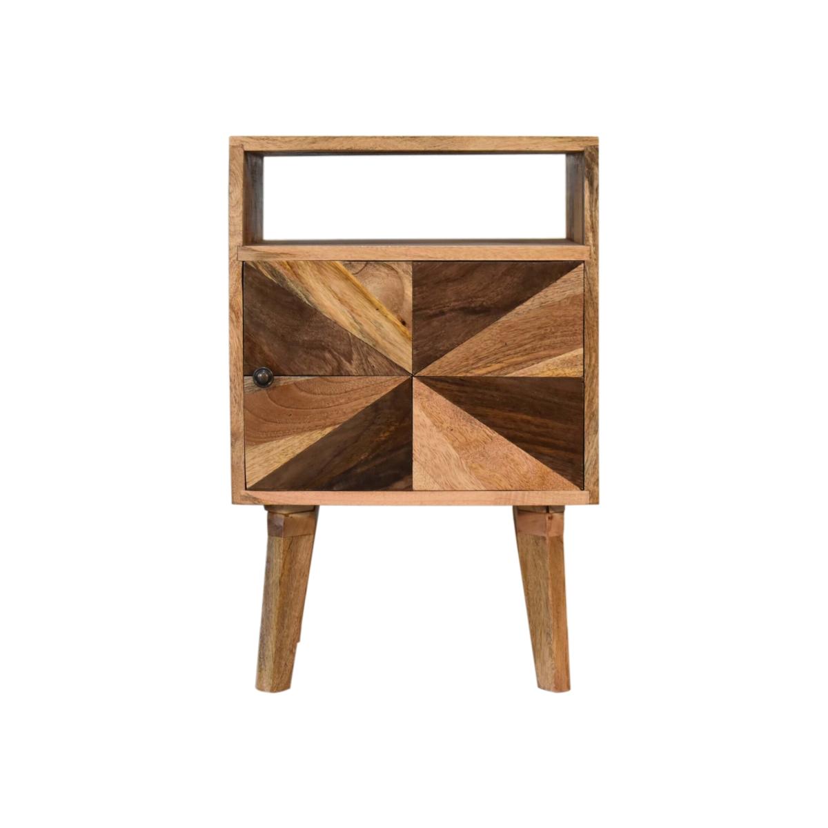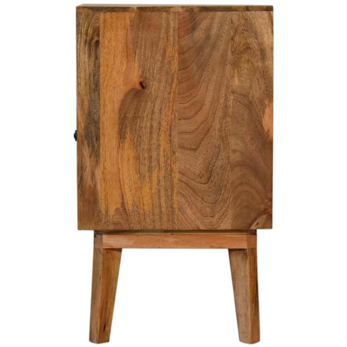 A beautiful addition to your bedroom, this Safi Bedside Table features a contemporary, stylish design. Finished with a unique mixed wood door front this piece will look smart in almost any decorating scheme. It is constructed from 100% solid mango wood and also features an open slot, a shiny brass knob and nordic style legs.