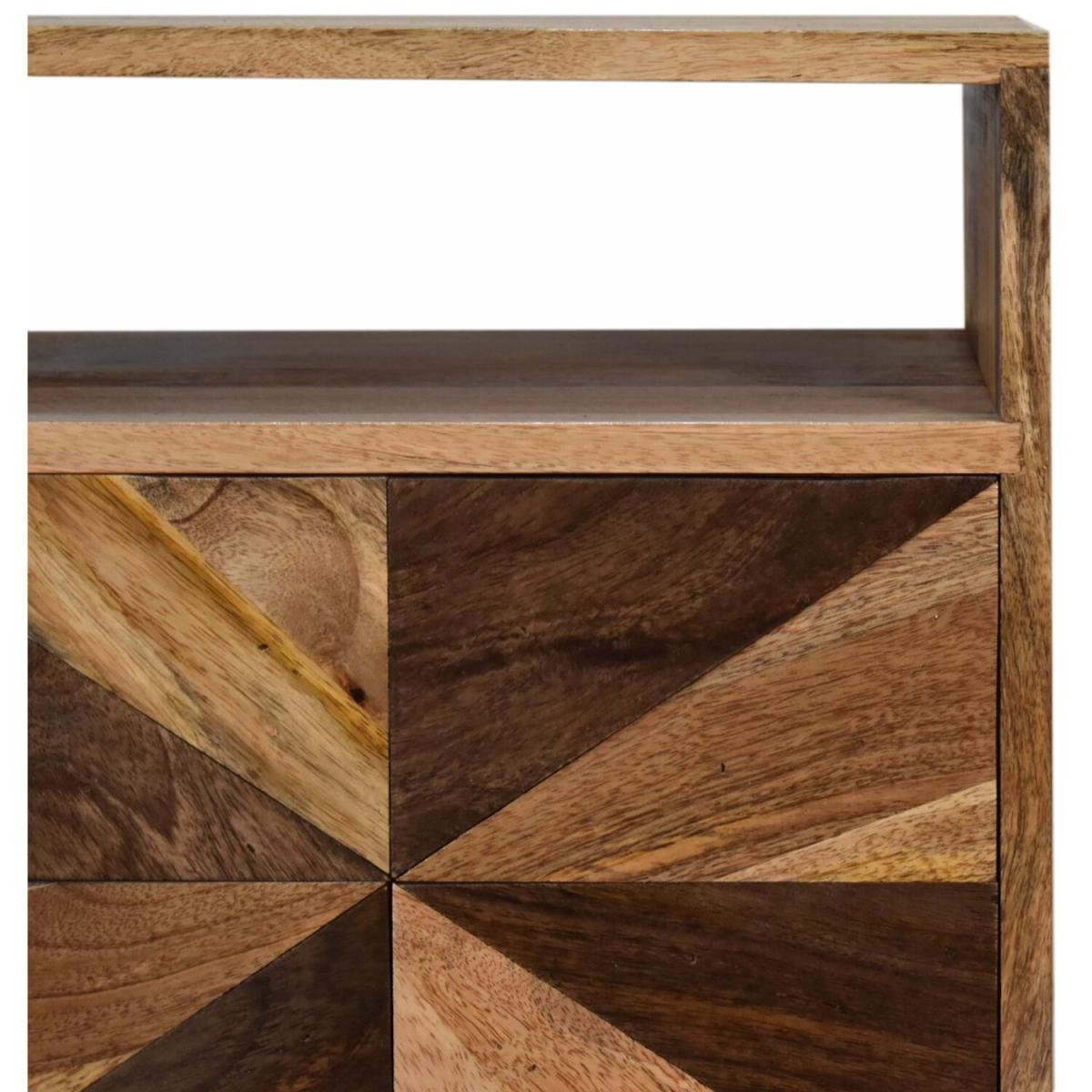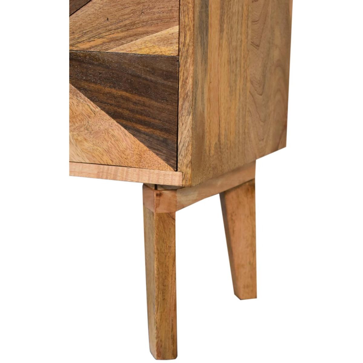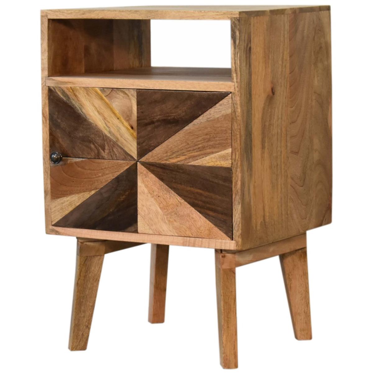 A beautiful addition to your bedroom, this Safi Bedside Table features a contemporary, stylish design. Finished with a unique mixed wood door front this piece will look smart in almost any decorating scheme. It is constructed from 100% solid mango wood and also features an open slot, a shiny brass knob and nordic style legs.