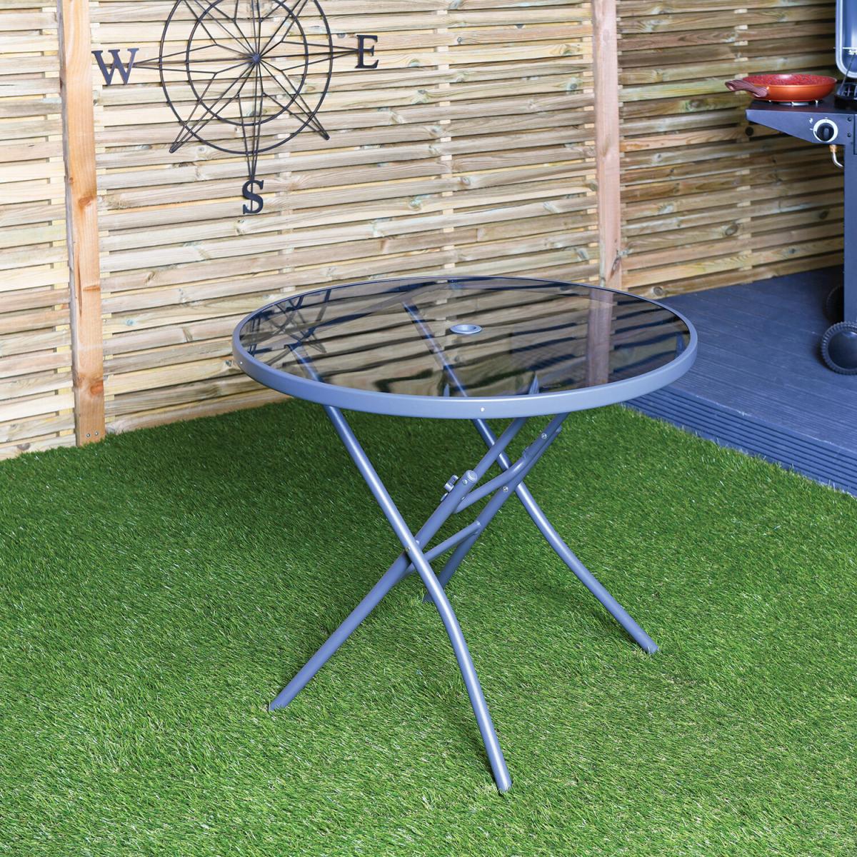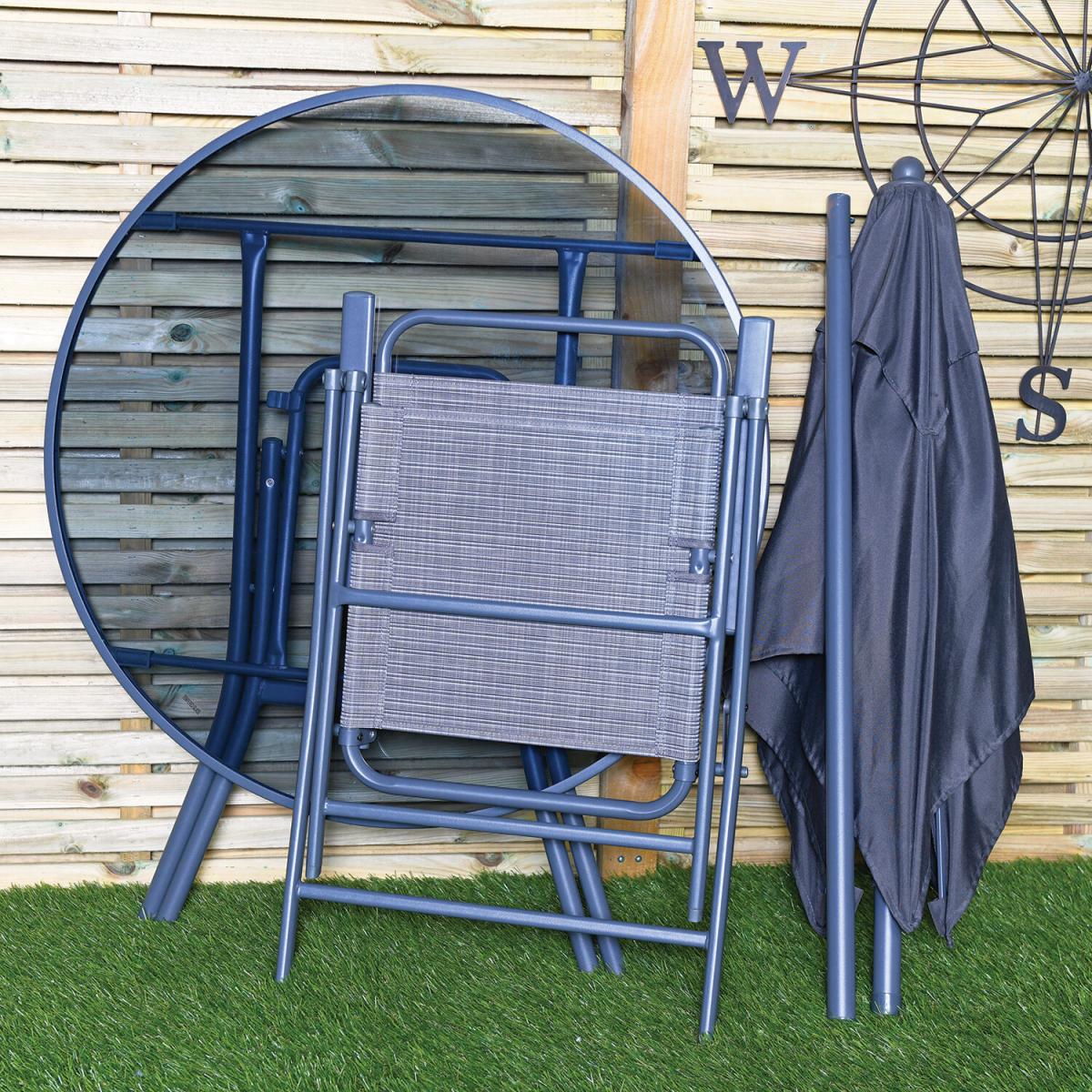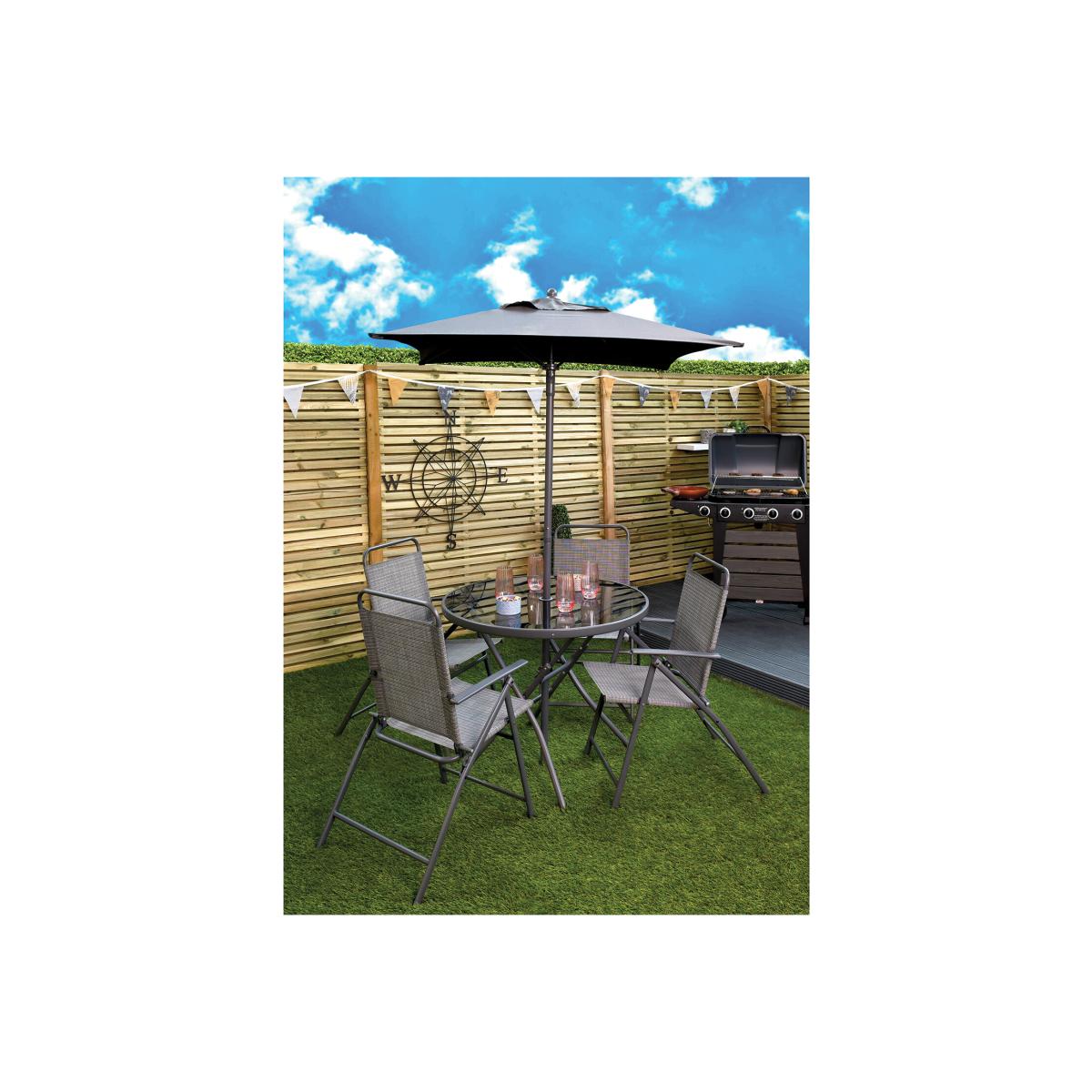 Whether al fresco dining, sharing a drink or hosting garden parties, this Safina Six Piece Dining Set is perfect for all your sunny, relaxing, outdoor special occasions. This garden furniture set's stylish and modern design includes four comfortable and inviting chairs made with a weather-resistant textilene fabric featuring a fabulous striped design so that your family and friends can truly relax and enjoy themselves. The sleek black table is topped with tempered glass, and a parasol is included to provide a cooling spot away from the harsh summer sun.