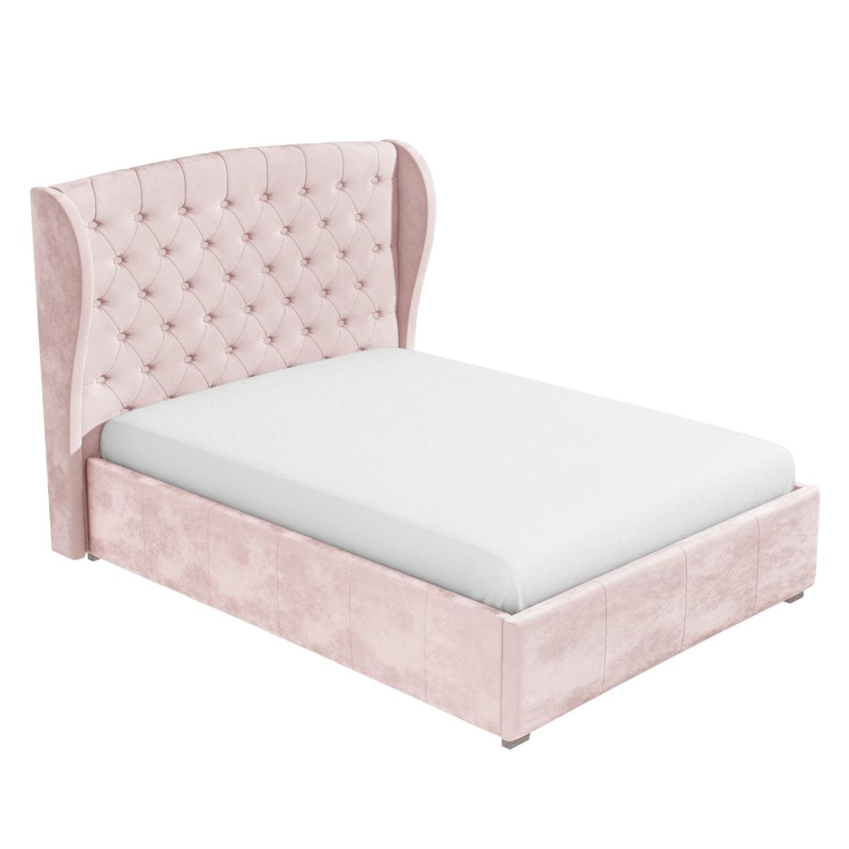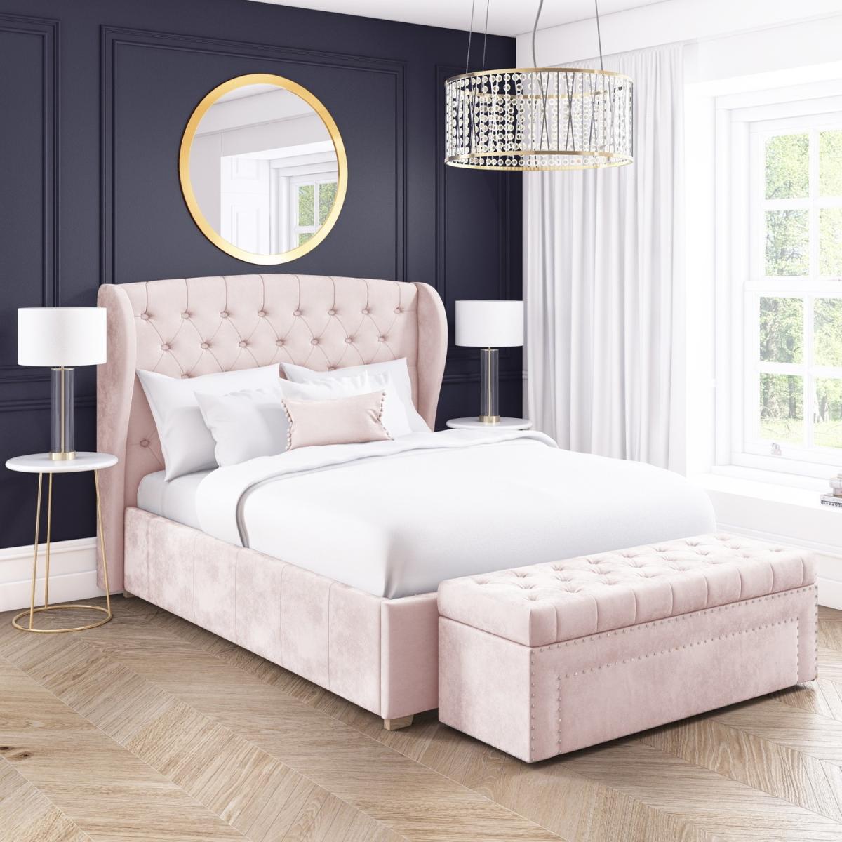 Features we love Easy access front opening storage space with gas lift mechanism. Plenty of storage space the entire area beneath the mattress can be used. Grand winged headboard creates an instant focal point in the bedroom Light baby pink velvet finish makes it easy to coordinate with other bedroom furnishings and décor styles. The tall deep button quilted headboard is great for comfortably propping yourself up All about me. Functionality with uncompromised design this Safina bed is sure to make a stunning impression in the bedroom. Whether you're lucky enough to have a spacious boudoir or put up with a pokey one everyone can benefit from the wealth of storage space this ottoman bed brings to the bedroom. Get clutter free and discreetly store away absolutely anything from spare towels and bedding to an unsightly suitcase. Accessing your stored items is effortless as this front opening storage space has a gas lift mechanism for all the heavy lifting. When it comes to style this storage bed has it going on sporting an alluring winged headboard with deep button quilting and a soft to the touch baby pink velvet finish. Not only does it give the bed a luxurious look it also adds comfort it's great for propping yourself up in bed and relaxing in front of the TV or getting cosy with a good book. This bed is beautiful inside and out with its quality build. It's been made with a durable wooden frame padded and then upholstered with baby pink velvet. It has a wooden slatted sprung frame for great mattress support and central bar legs for added support and durability. Need to know. Size. Standard UK Double (4ft6/135x190cm) Dimensions. W159 x D208.5 x H130 cm Storage Dimensions. W138.5 x D193 x H30 cm Headboard. W159 x H130 cm Material. Metal and; wood frame Finish. Velvet Colour. Baby pink. More info. Easy to open gas lift front opening ottoman storage. Tall statement wing headboard with stud quiltingSoft touch velvet finish in baby pink Wooden slatted bed base with central leg support. Fits a standard UK double mattress (4ft6/135x190cm)Mattress not included.