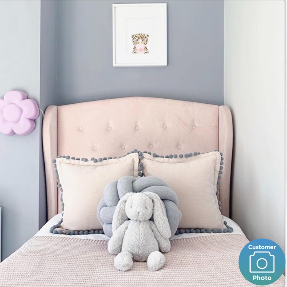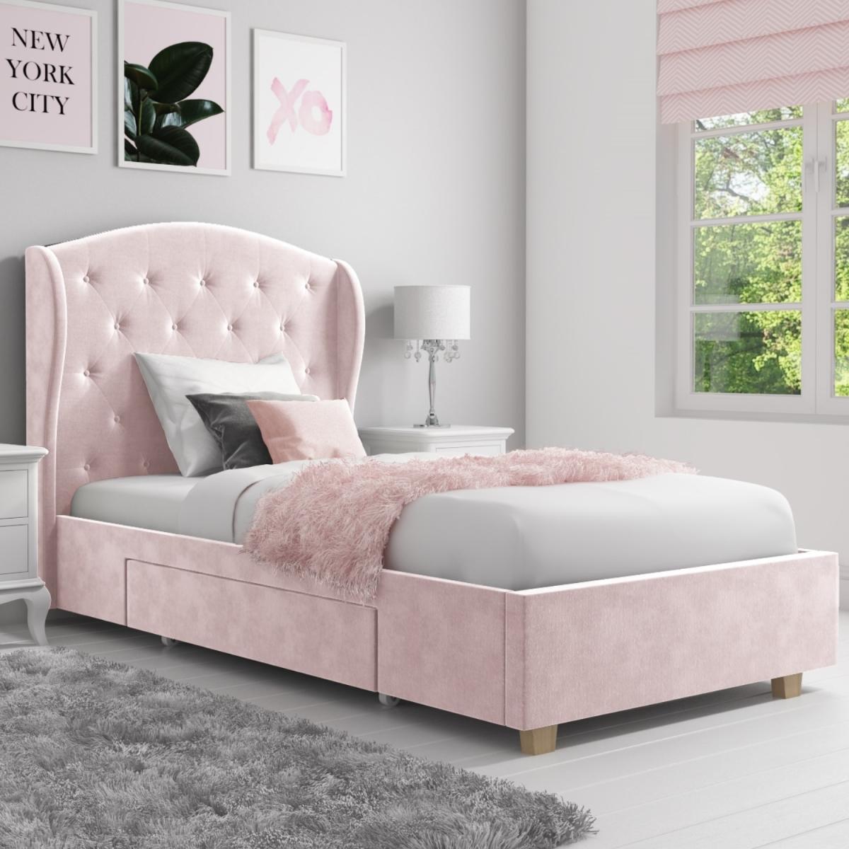 This Safina single bed is sure to make an elegant addition to any bedroom. It's a lovely bed to grow up with thanks to its timeless design, and when it comes to style, it has it all; from its gorgeous tall, winged headboard with quilted button detailing, to its overall baby pink velvet finish. It includes an under bed drawer to help keep the bedroom clutter-free and it's perfect for storing anything from clothing and accessories to those treasured personal belongings. Not only does the headboard bring a touch of luxury, but its tall design is also perfect for comfortably propping yourself up in bed so you can relax with a book or unwind in front of the TV. The bed features a wooden sprung slatted base for comfortable mattress support. It fits a UK single mattress; it isn't included so you're free to choose one that's perfect for you. Not only that, it's a high quality build too, with a durable wood and metal frame supported by chunky legs. This product is delivered to your home flat-packed, for your convenience. In addition, the under-bed drawer can be assembled on either side of the bed to suit your space!