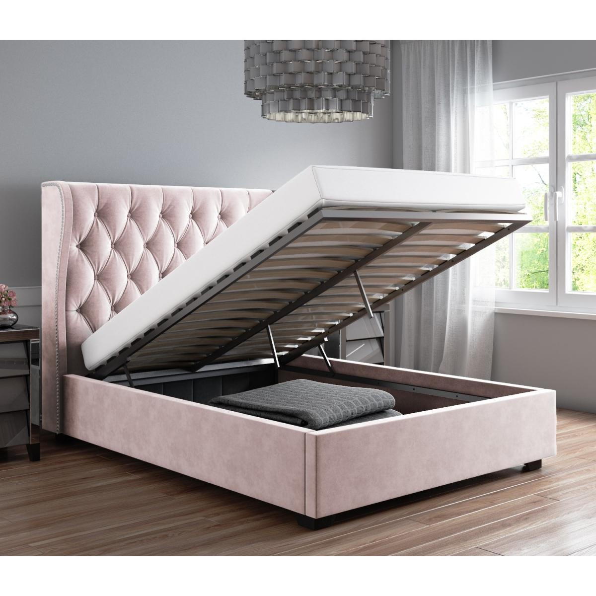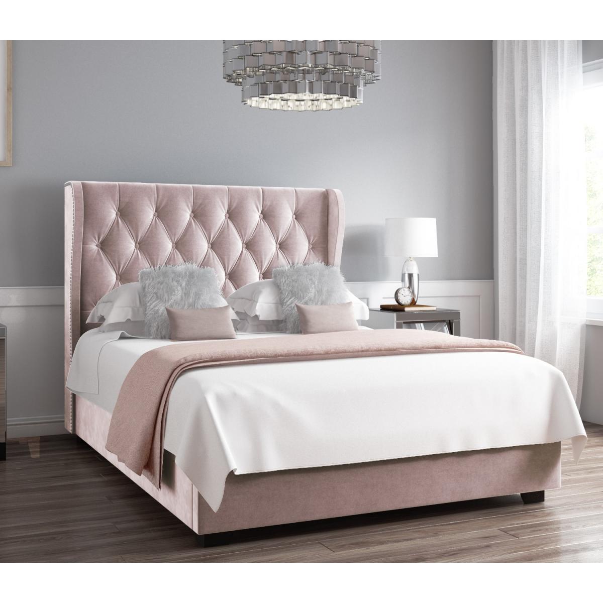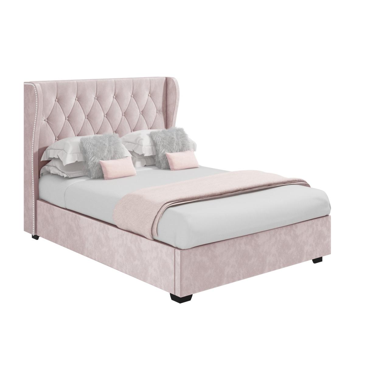 Functionality with uncompromised design, this Safina bed is sure to make a stunning impression in the bedroom. Whether you're lucky enough to have a spacious boudoir or put up with a pokey one, everyone can benefit from the wealth of storage space this ottoman bed brings to the bedroom. Get clutter free and discreetly store away absolutely anything from spare towels and bedding to an unsightly suitcase. Accessing your stored items is effortless as this front opening storage space has a gas lift mechanism for all the heavy lifting. When it comes to style this storage bed has it going on. Not only does it give the bed a luxurious look it also adds comfort, it's great for propping yourself up in bed and relaxing in front of the TV or getting cosy with a good book. The tall headboard features double stud detailing down the sides for an added touch of glamour. This bed is beautiful inside and out, with its quality build. It's been made with a durable wooden frame, padded and then upholstered with pink velvet. It has a wooden slat, sprung frame for great mattress support and central bar legs for added support and durability. Unlike some other ottomans, this Safina bed features a solid base that allows you to store more without damaging your flooring or carpet. It's more hardwearing than fabric based beds too, so you can enjoy added peace of mind that it will last you for years to come.