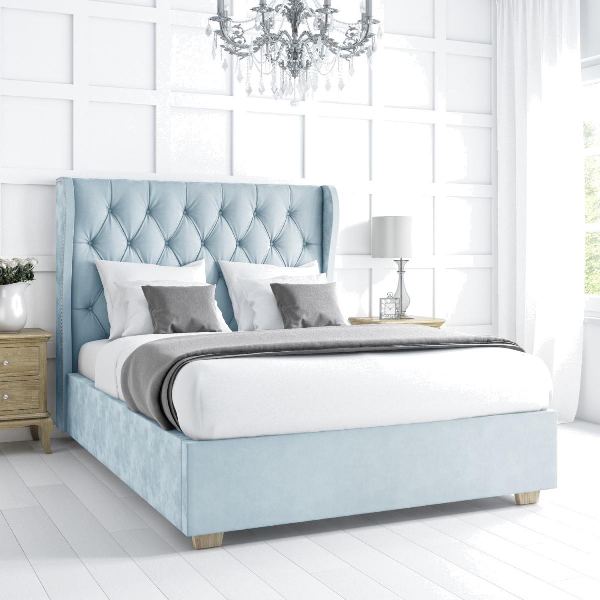 Features we love Easy access front opening storage space with gas lift mechanism. Plenty of storage space the entire area beneath the mattress can be used. Its solid base helps to protect your flooring also helping to protect your items from dust. Studded winged headboard creates an instant focal point in the bedroom. Duck egg blue finish makes it easy to coordinate with other bedroom furnishings and décor styles. The tall deep button quilted headboard is great for comfortably propping yourself up All about me. Functionality with uncompromised design this Safina bed is sure to make a stunning impression in the bedroom. Whether you're lucky enough to have a spacious boudoir or put up with a pokey one everyone can benefit from the wealth of storage space this ottoman bed brings to the bedroom. Get clutter free and discreetly store away absolutely anything from spare towels and bedding to an unsightly suitcase. Accessing your stored items is effortless as this front opening storage space has a gas lift mechanism for all the heavy lifting. When it comes to style this storage bed has it going on sporting an alluring winged headboard with deep button quilting. Not only does it give the bed a luxurious look it also adds comfort it's great for propping yourself up in bed and relaxing in front of the TV or getting cosy with a good book. The tall headboard features double stud detailing down the sides for an added touch of glamour. This bed is beautiful inside and out with its quality build. It's been made with a durable wooden frame padded and then upholstered with duck egg blue velvet. It has a wooden slat sprung frame for great mattress support and central bar legs for added support and durability. Unlike some other ottomans this Safina bed features a solid base that allows you to store more without damaging your flooring or carpet. It's more hardwearing than fabric based beds too so you can enjoy added peace of mind that it will last you for years to come. Need to know. Size. Standard UK Double (4ft6/135x190cm) Dimensions. H132 x W150 x D206 cm Headboard. H127 x W150 cm Base. Solid Material. Metal and; wood frame Finish. Duck egg blue velvet. More info. Easy to open gas lift front opening ottoman storage. Tall statement wing headboard with stud quilting. Wooden slatted bed base with central leg support. Durable woven material ottoman storage base. Fits a standard UK double size mattress Mattress not included.