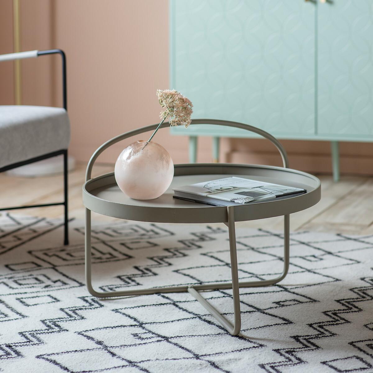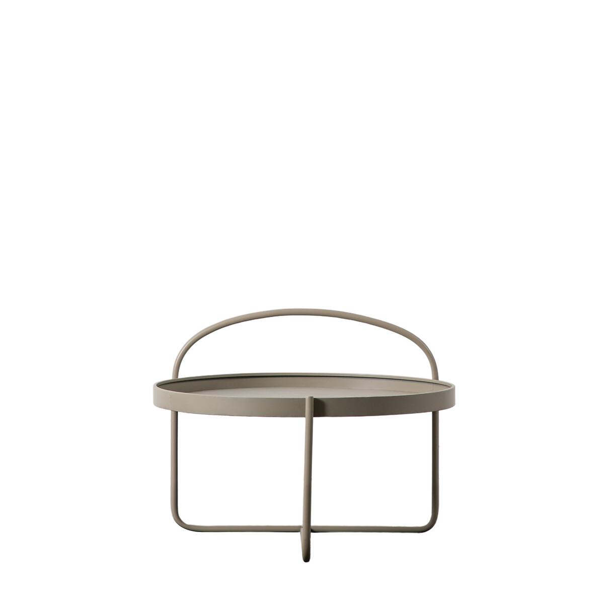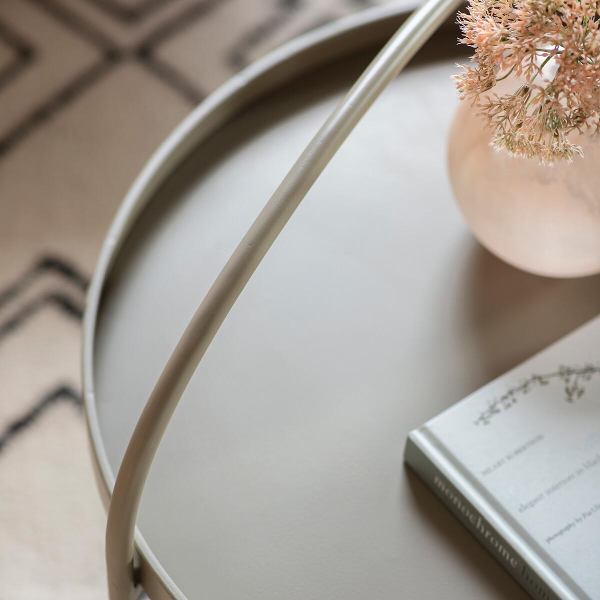 I’m a fan of this round tray table for its pared-back silhouette and muted metal finish - it feels right at home in Scandi-inspired, contemporary or lightly industrial schemes. Its low profile and built-in handle make it both practical and portable, whether you’re coralling reading material in a compact city flat or propping up drinks during a relaxed weekend gathering. Styling-wise, keep the look simple: a small stack of art books, a sculptural vase or a single candle on one side leaves breathing room around the handle, while a low‐contrast tray melds effortlessly with natural-fibre rugs or linen sofas. For a layered effect, pair it with a slightly taller side table in timber or marble so each piece maintains its place without competing for attention.