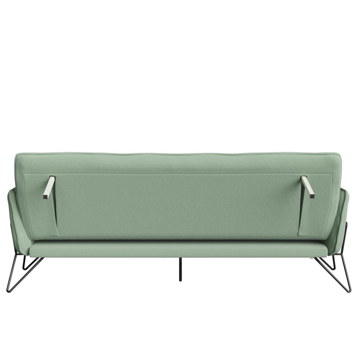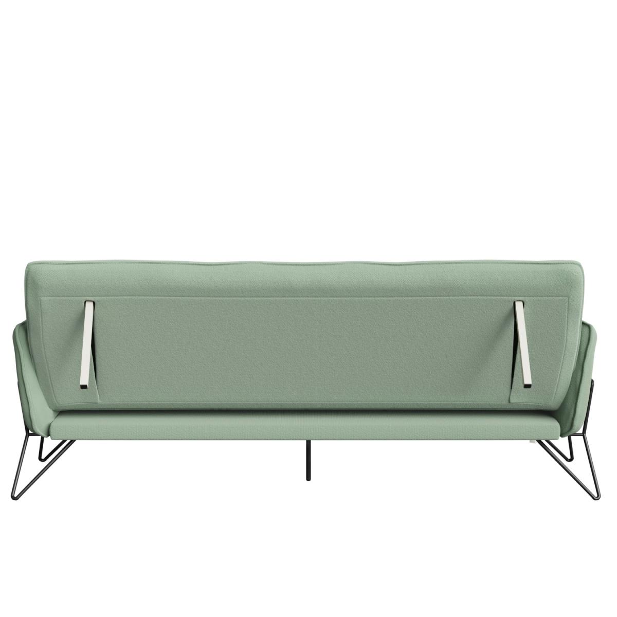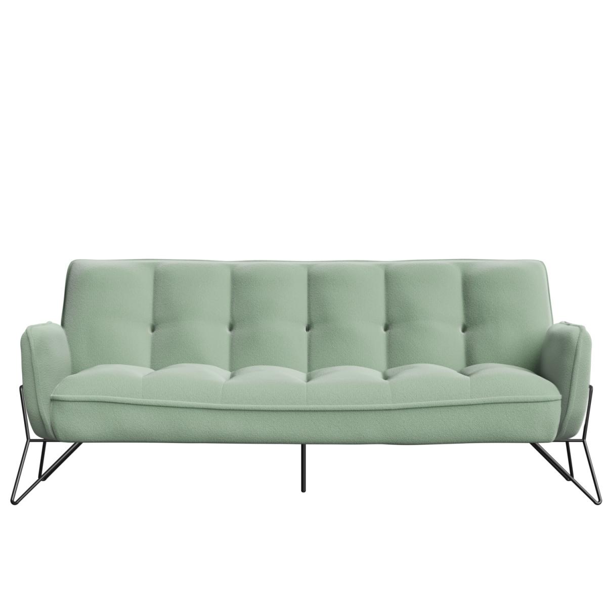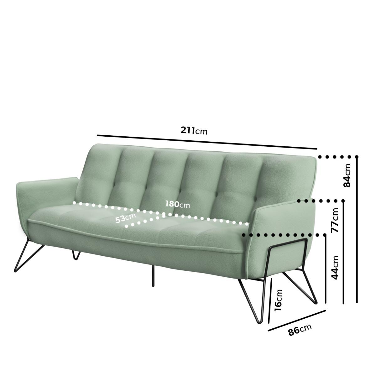 Dimensions H84 x W211 x D84 cm Features. Upholstered in soft woven fabric Modern design with added button detailing on seat and back. Black metal hairpin legs and side detailing. Easy assembly- just fix in the legs. Clic clac sofa bed mechanism. Foam-filled seat and back cushions for added comfort. Three seater perfect for guests..