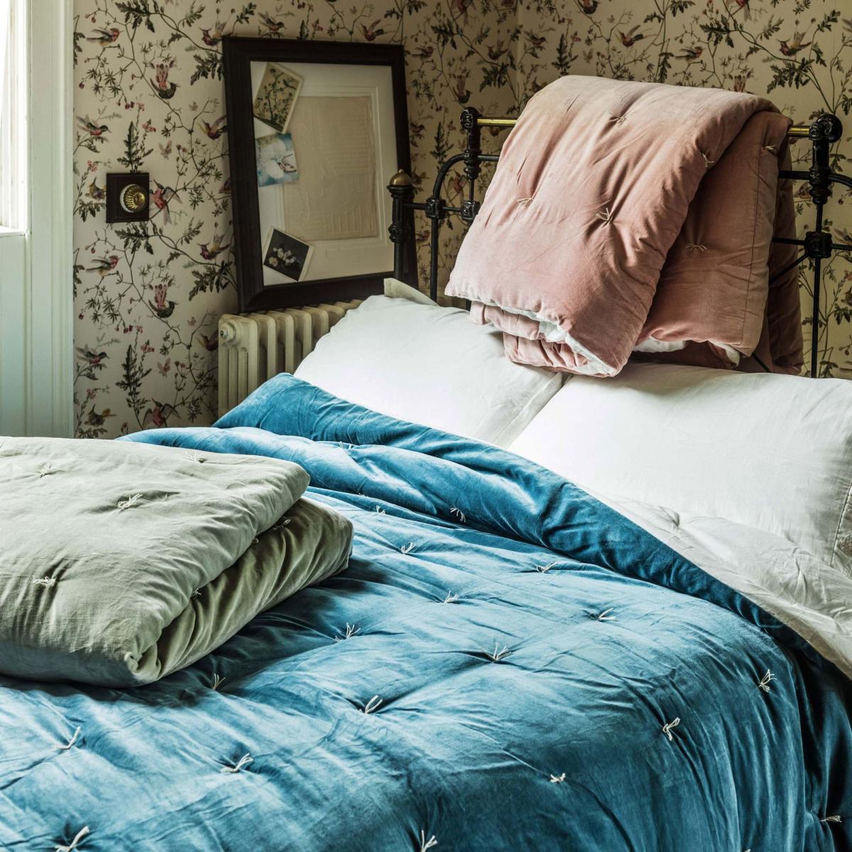 A super king size quilt handmade from luxurious cotton velvet with hand-knotted tassel detailing and an ivory cotton voile reverse.
