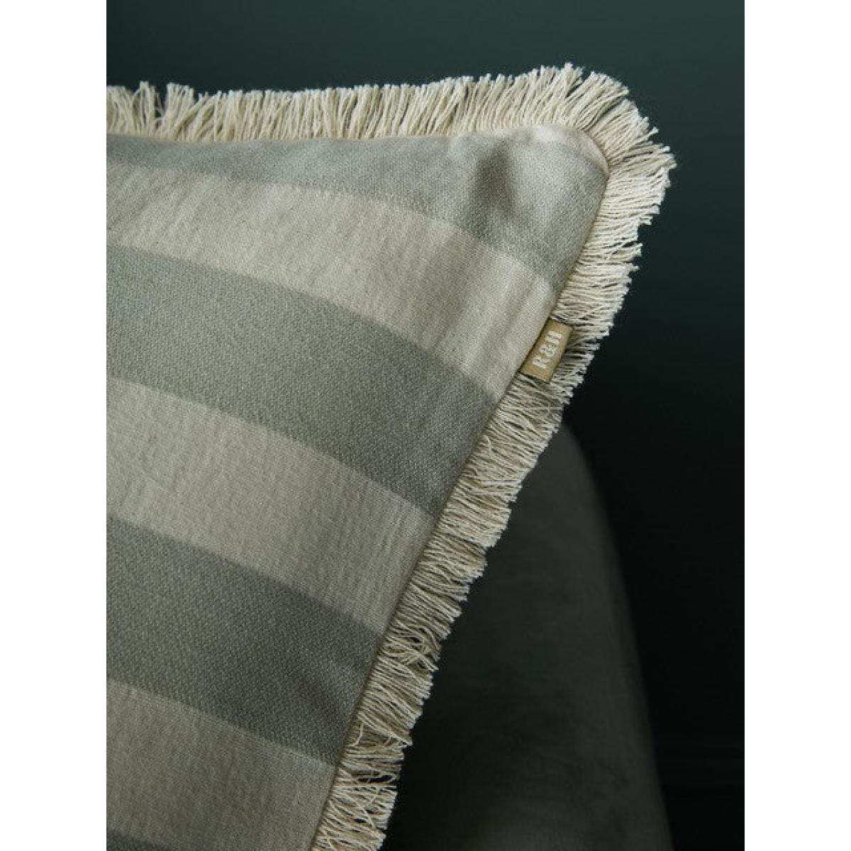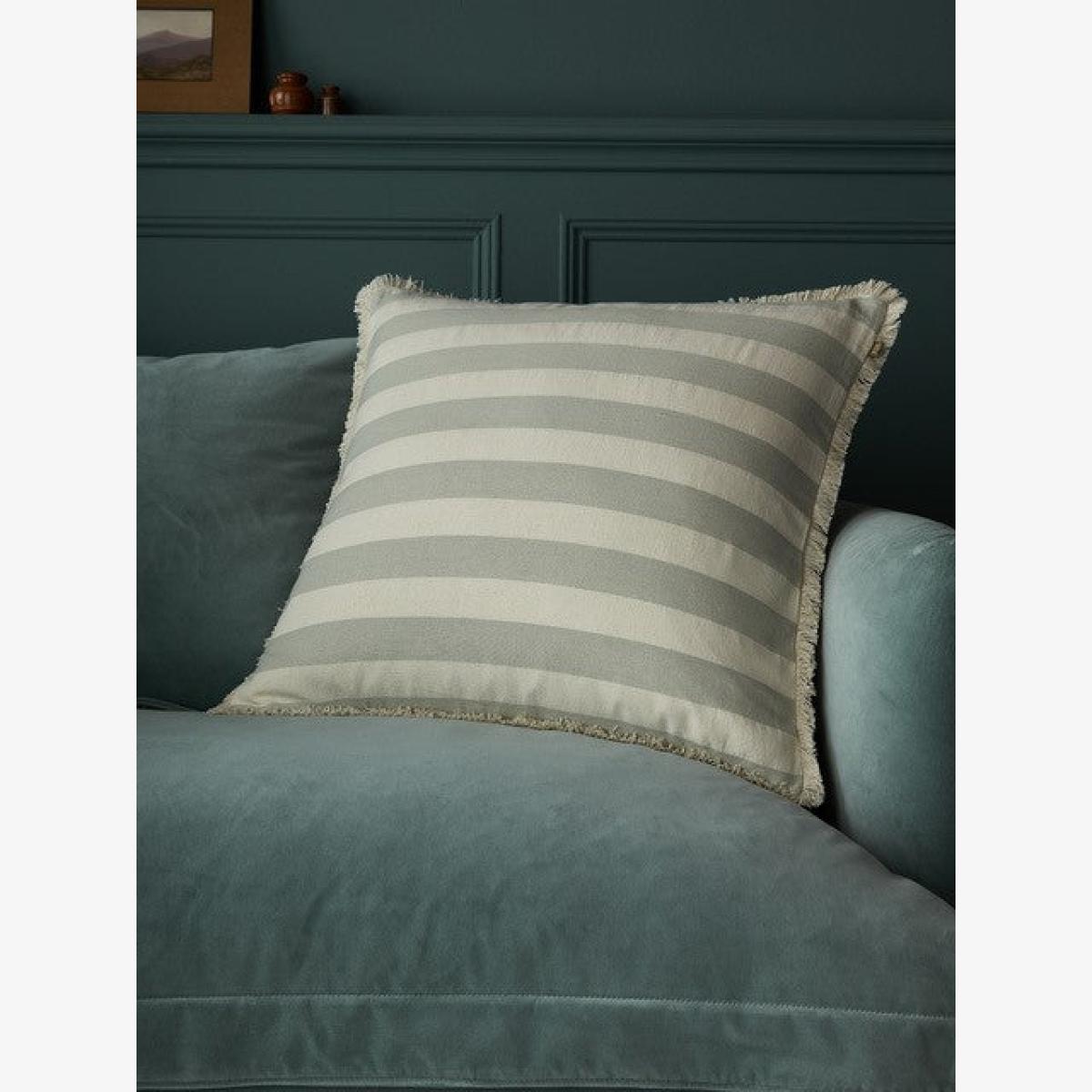 A bold stripe cushion with a wide stripe pattern and soft fringe edge. This cushion is generously sized, giving it that perfect amount of squish. Made from recycled cotton, the fabric is soft and of lovely quality. As happy on a sofa as on a bed. Also comes in a rectangle shape. A bold stripe cushion with a wide stripe pattern and fringe edge.
