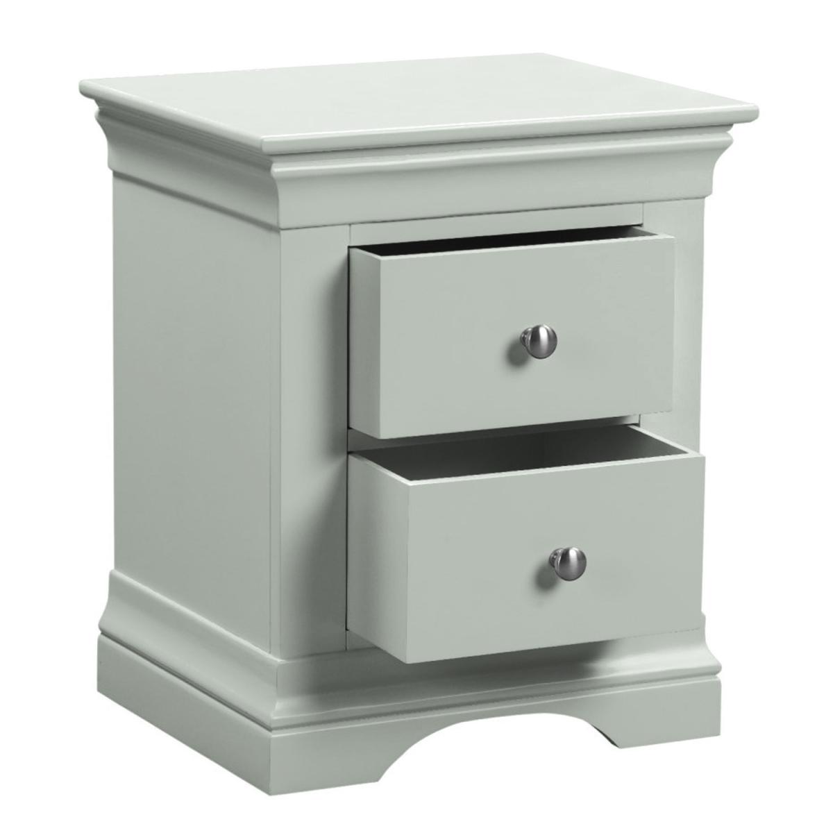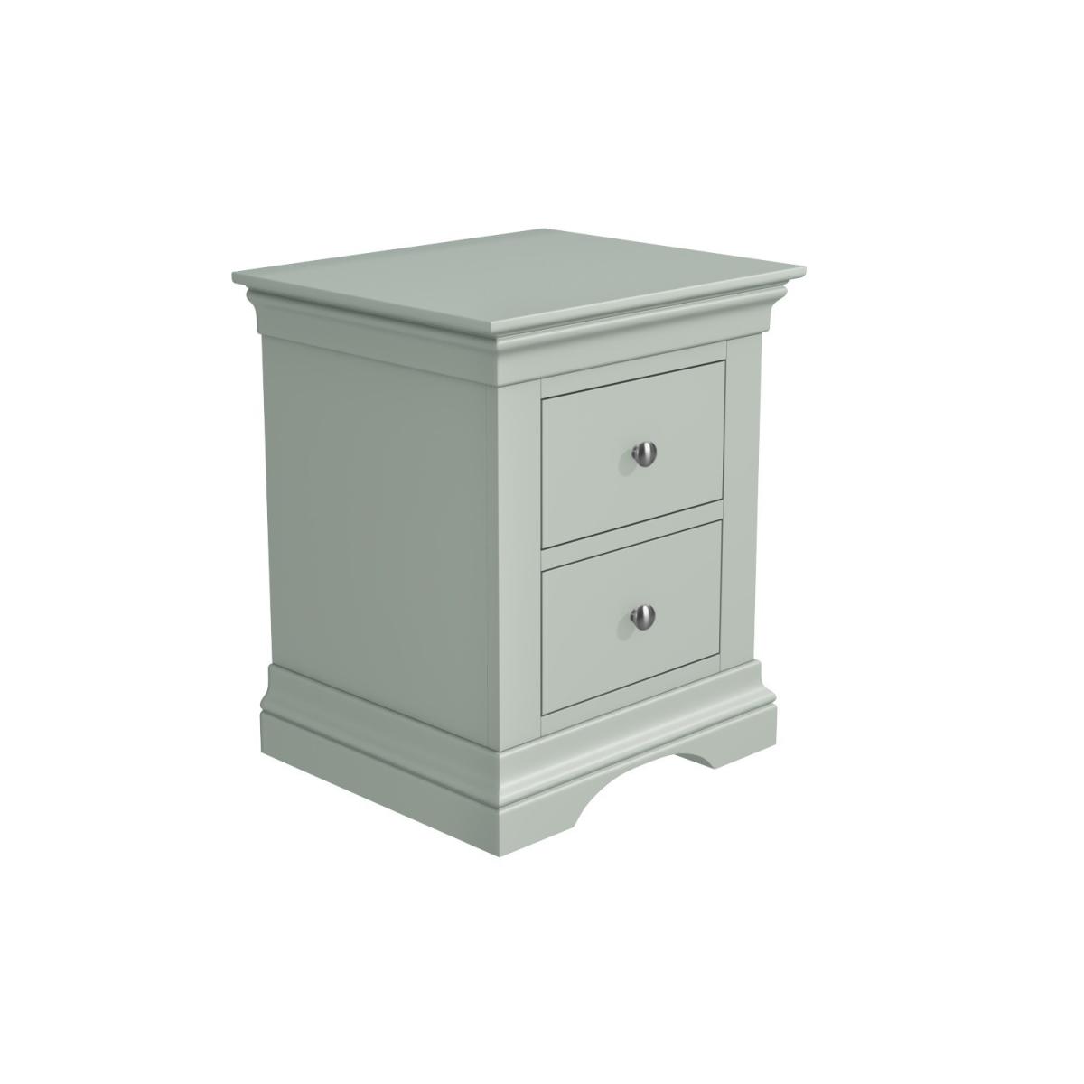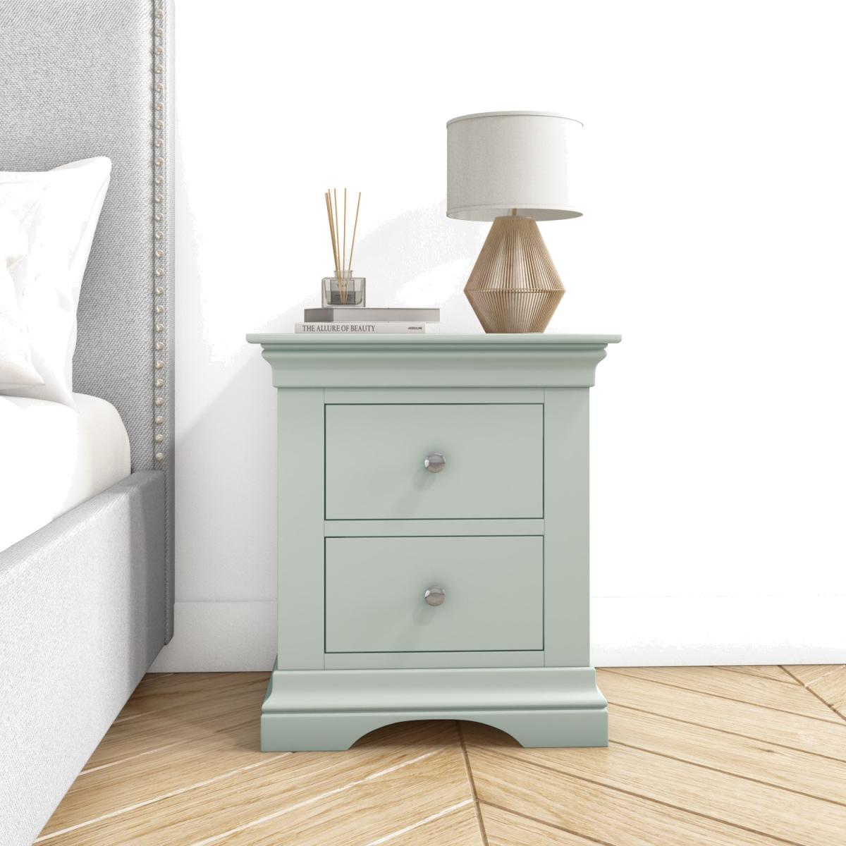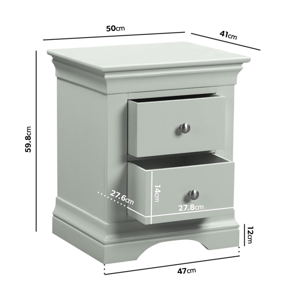 Features we love Elegant French design with a contemporary feel. Finished with sage green paint suitable for any decor. Two drawers for storing your night-time essentials. Featuring high quality rounded brushed silver handles. Delivered fully assembled. Need to know. Overall Dimensions. W50 x D41 x H59.8 cm Each internal drawer dimensions. W27.8 x D27.6 x H14 cm Colour. Sage green Finish. Painted Material. Pine and MDF Weight. 15.5kg Assembly required. No..