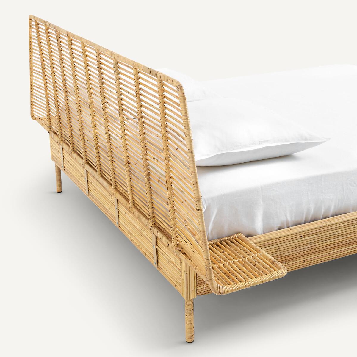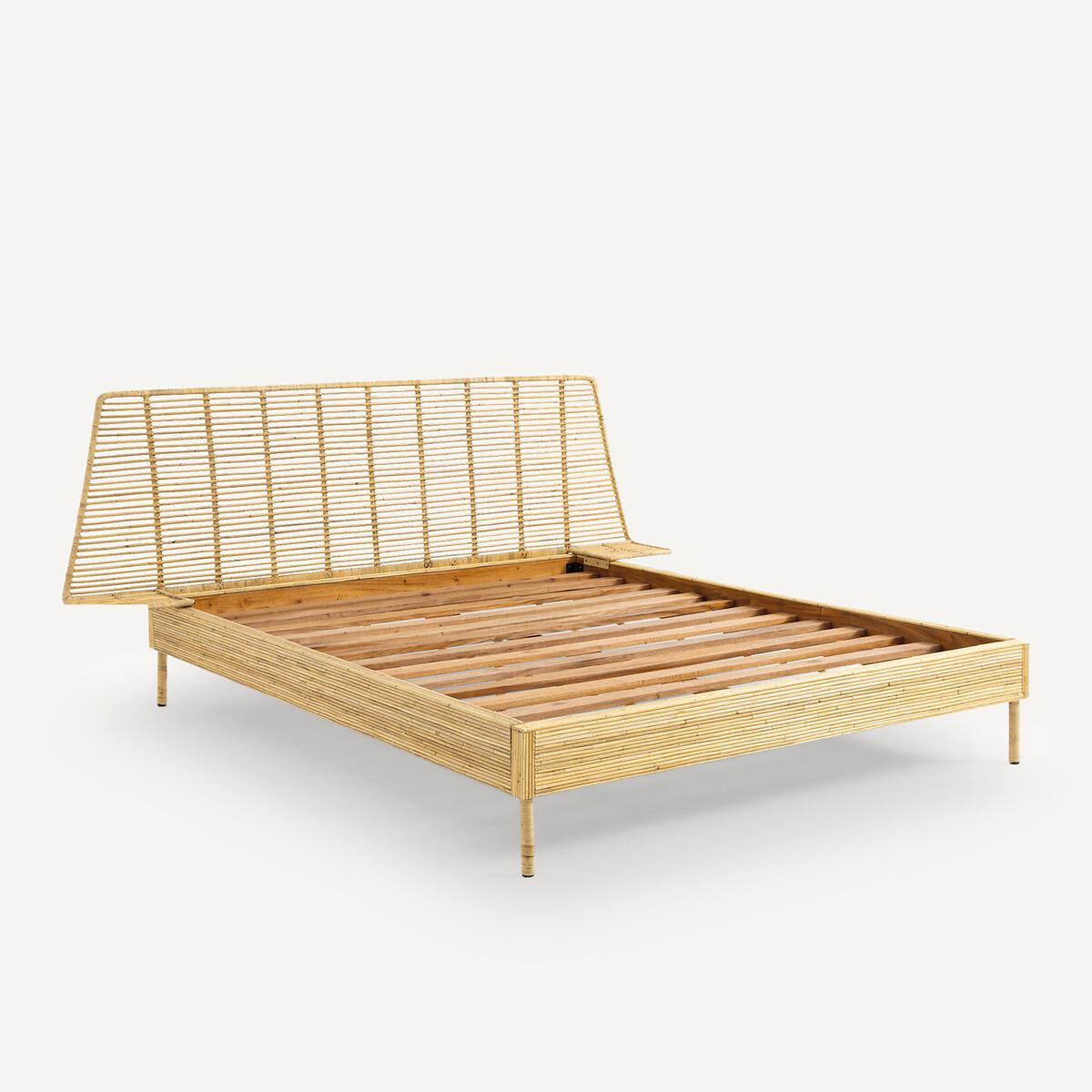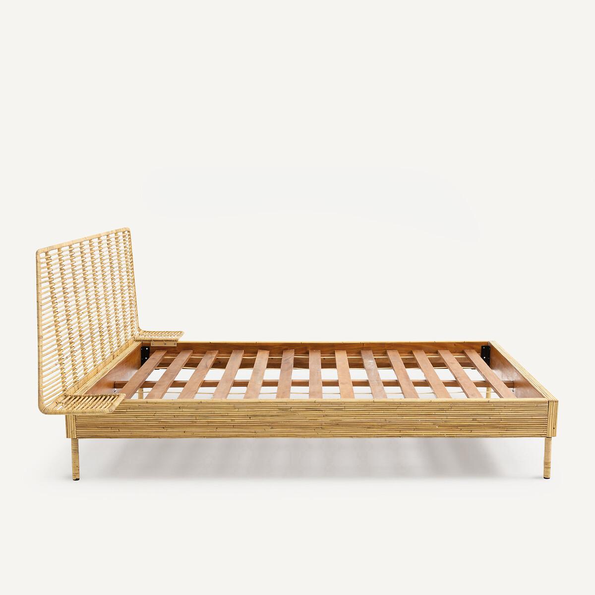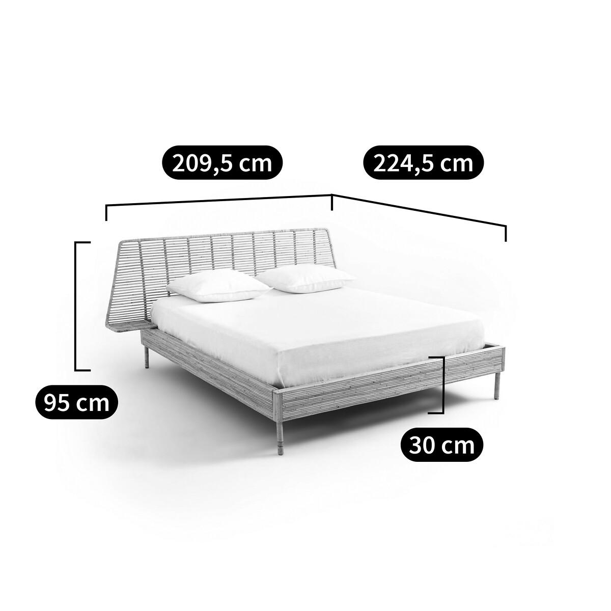 The Saghil Rattan Cane Bed. A simple and compact design which integrates the bed, headboard and bedside tables into a single structure, combining the tradition of artisanal weaving and contemporaneity.. Artisanal craftsmanship. Each piece is unique. Product Details • Mahogany structure covered with rattan cane • Headboard and nightstands in metal and rattan cane • Rattan-wrapped metal legs • Sold with mahogany slatted base. Dimensions • Sleeping area King (160 x 200cm) • Width 224.5 x Length 209.5cm • Height 95cm • Mattress height 30cmDelivery:. Assembly required. Available for home delivery. Dimensions and weight of parcel • 165 x 32 x 10cm - 18kg • 204 x 21 x 32.5cm - 36kg • 227 x 83 x 34cm - 22kg