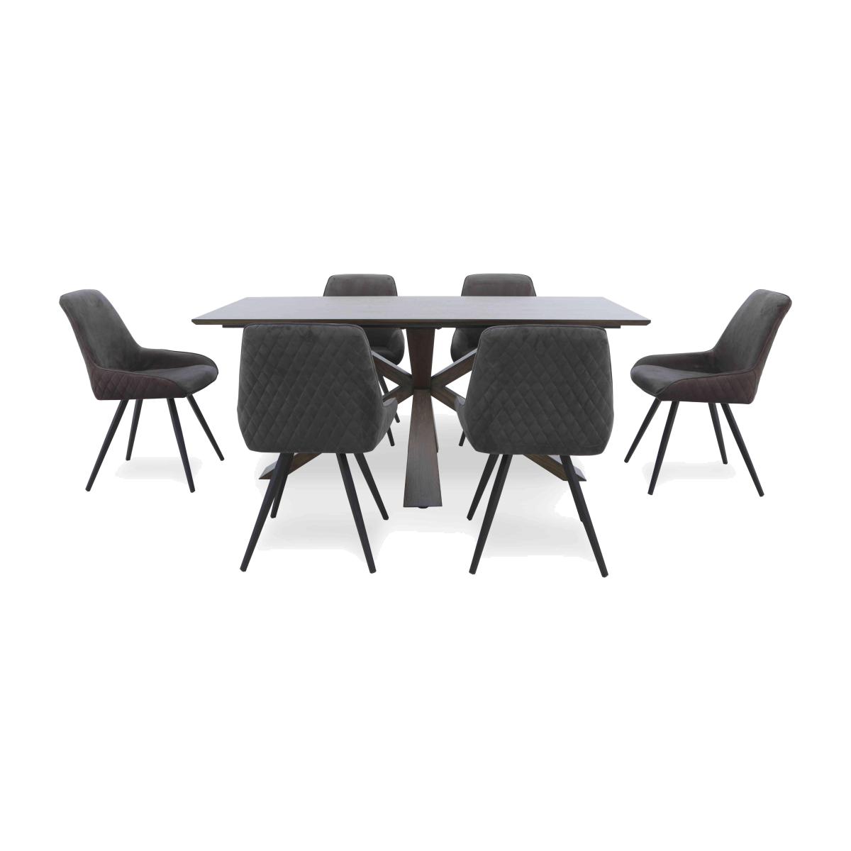 You’ll be drawn to the extending dining tables and dining sets in our Saigon range because of how fabulous they look – all that lacquered dark oak veneer and those bold star-shaped table bases – and you’ll linger because of the incredible-value prices. An elegant and contemporary take on industrial design, Saigon offers incredible value without compromising on quality. The collection comprises multiple dining table options with star-shaped bases in either wood or metal, a wide choice of dining sets featuring the range’s beautiful velvet dining chairs and bench, and a sideboard, coffee table and lamp table to round out the look in any room. The Saigon range is exclusively available at Furniture Village. Upgrade your dining room in sleek industrial style with this dining set. The dining table seats six and has a dark oak veneer lacquered finish. With six velvet dining chairs. Why you'll love it This fashionable dining set includes 6 velvet dining chairs. Elegant and well-crafted industrial style that’s incredible value. Fashionable dark oak veneer top with a sleek lacquered finish. Eye-catching wooden star-shaped base. 6 dining chairs beautifully upholstered in velvet in a choice of colours. High backs and splayed black metal legs. This dining set is also available with an extending dining table and with a metal base. Exclusively available at Furniture Village. This dining table and chairs set is part of our Saigon range. What you need to know Dining chairs have foam seat cushioning. Table seats 6. Oak veneer top. Solid wood frame and base. Every piece of oak veneer has unique and natural marks, knots and colour variation. Avoid placing in direct sunlight or close to a heat source. We recommend using coasters and placemats at all times. Browse our Saigon range for a huge choice of dining tables, dining sets, chairs and more.