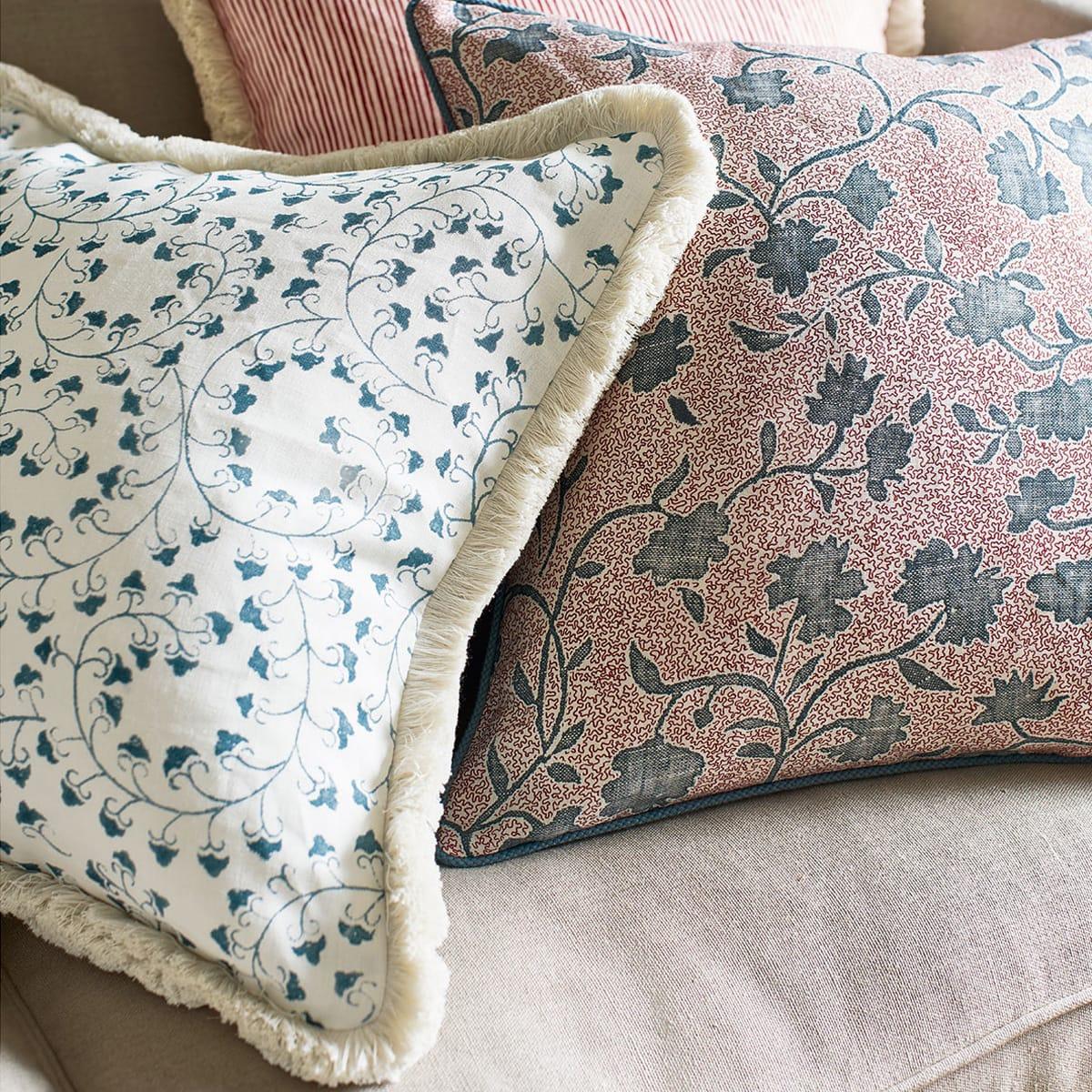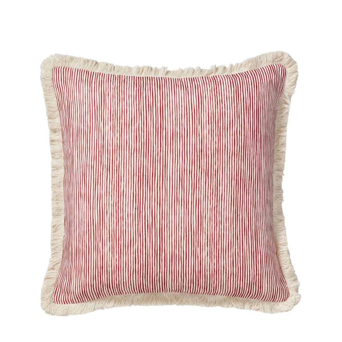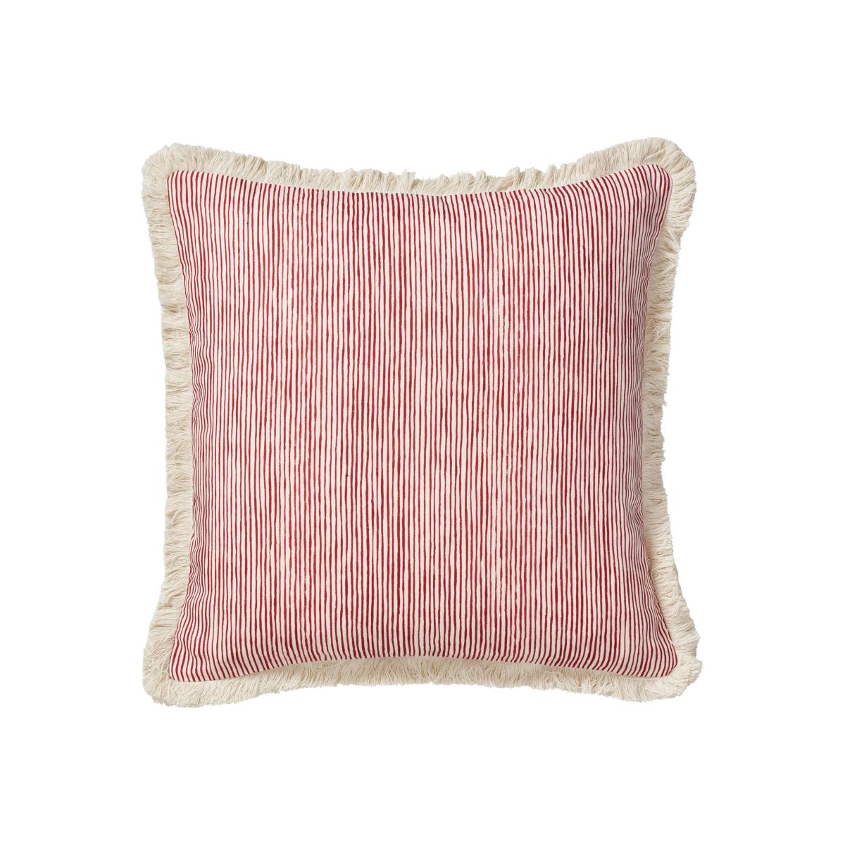 The Saigun Cushion Cover in Venetian Red features cotton ruche fringing for added texture and interest. Part of Co-Founder Lucinda Waterhouse's Satara Collection, the design is inspired by Indian floral patterns, marrying flower prints with stripes and swirls to achieve a modern feel. Saigun Cushion Cover - Venetian Red