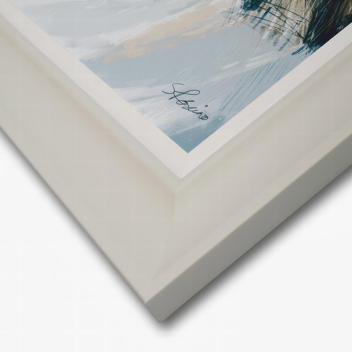This serene piece captures the quiet beauty of a secluded shoreline bathed in soothing blue hues, featuring a white sailboat sailing off into the distance. The gentle waves and soft, misty horizon create a sense of peace and solitude, inviting you to escape into the tranquil scene.