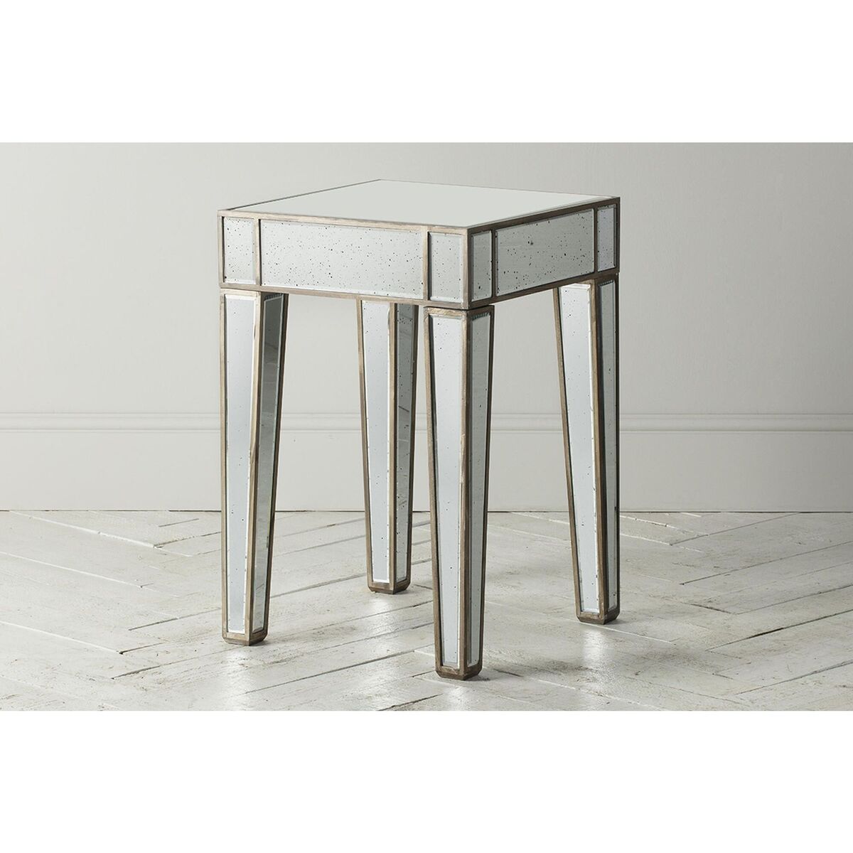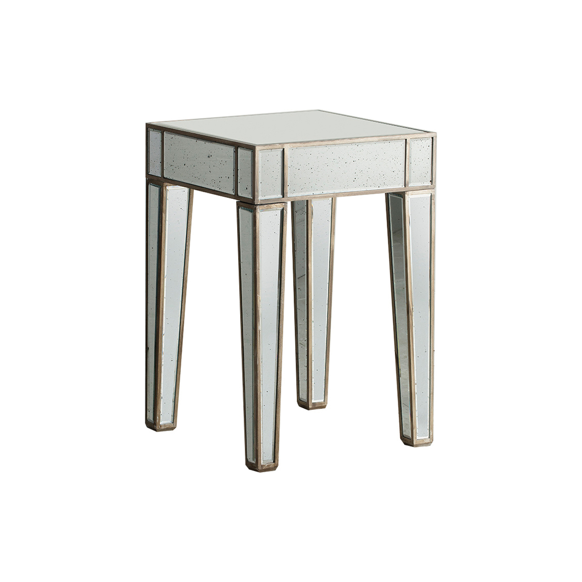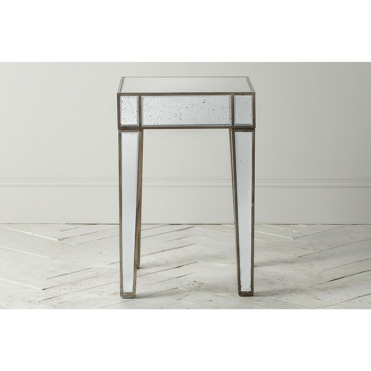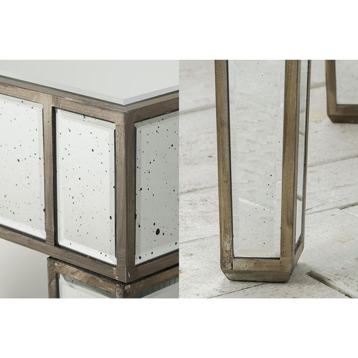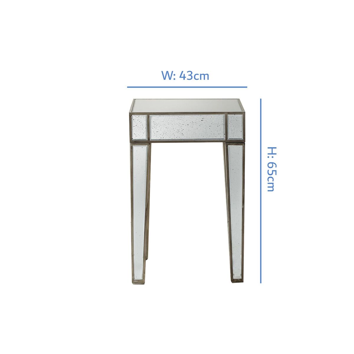 A patina finish mirrored design with slim, tapered legs and a narrow body, the Saina boasts a clean-lined aesthetic and simply looks dapper when placed against a painted wall. A piece that shines on its very own right, the Saina is perfect to boost any room and brighten it up - keep the balance by adding only a few items so as not to overwhelm, like a white vase with a couple of green stems or a beautiful portrait of your family. More Information: Materials:Glass, MDFDimensions:H:65cm x W:43cm x D:43cm; 12.3kgs