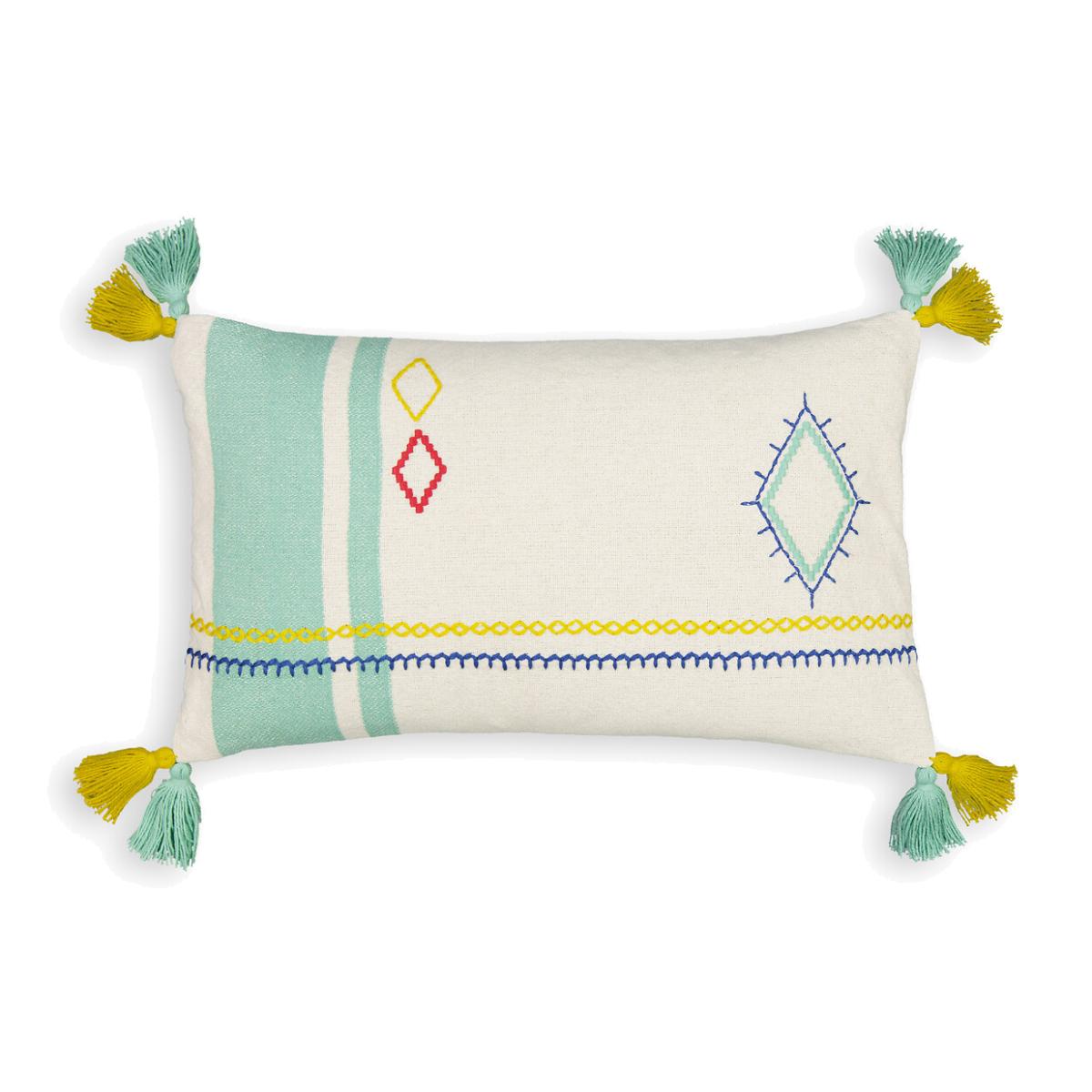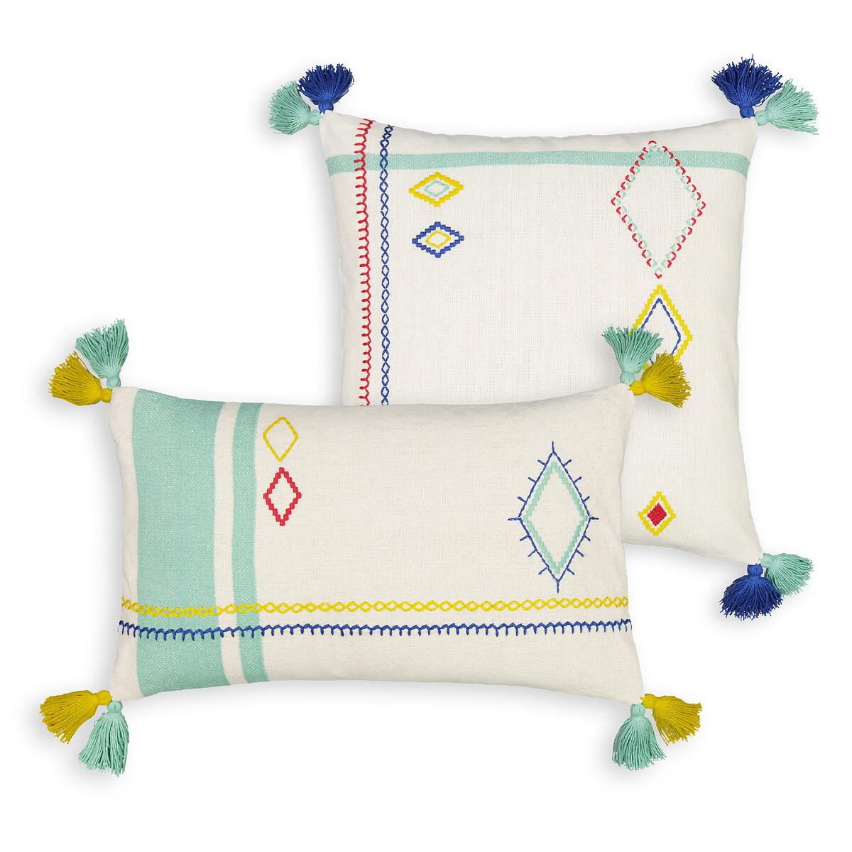 Set of embroidered patterns in tonal colours. Inspired by Berber craftsmanship. The Sajia cushion cover is ideal for quirky decors. Created by La Redoute Interiors. Product Details • 100% cotton • Front in woven stripes with placed embroidery • Plain on back • Tassels in each corner • Zip fastening. Size • 50 x 30cm