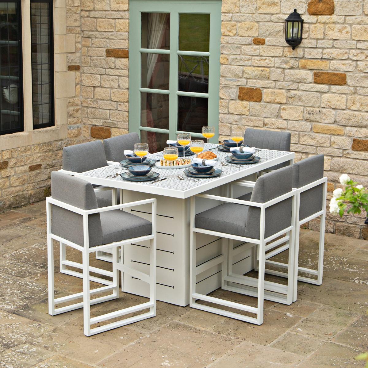 Introducing our Salcombe Outdoor Living range of Garden Furniture. Transform your outdoor space with our incredible selection of highly fashionable, designer pieces, certain to take your breath away. Combining clean lines with on-trend colour fabrics, each piece is made to the highest quality, ensuring your garden is ready for hosting whatever the weather. From impressive dining and sofa sets to sunloungers, Salcombe Outdoor Living is set to make a stylish addition to those looking to really make a statement with premium garden furniture. Dimensions listed is for the Table only. Individual item dimensions, and set composition, as follows:. 1 x Bar Table - W: 170cm x D: 100cm x H: 100cm. 6 x Bar Stools - W: 53cm x D: 60cm x H: 110cm.