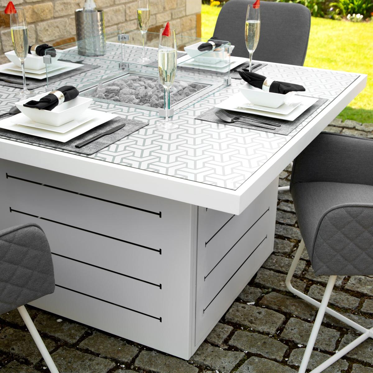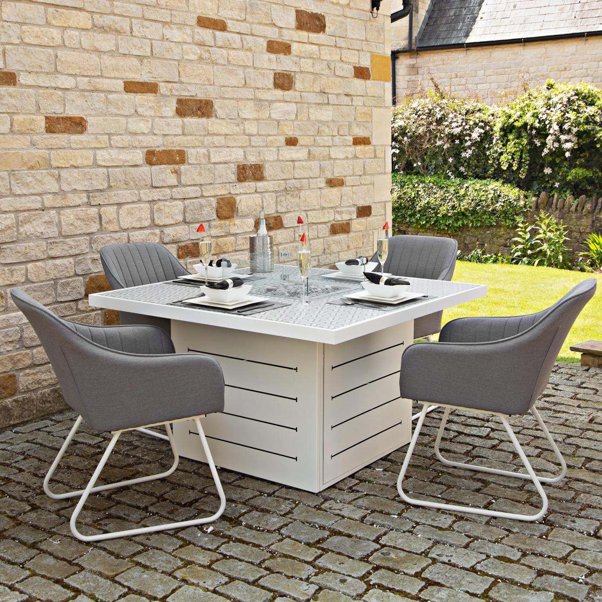 Introducing our Salcombe Outdoor Living range of Garden Furniture. Transform your outdoor space with our incredible selection of highly fashionable, designer pieces, certain to take your breath away. Combining clean lines with on-trend colour fabrics, each piece is made to the highest quality, ensuring your garden is ready for hosting whatever the weather. From impressive dining and sofa sets to sunloungers, Salcombe Outdoor Living is set to make a stylish addition to those looking to really make a statement with premium garden furniture. Dimensions listed is for the Table only. Individual item dimensions, and set composition, as follows:. 1 x Dining Table with Firepit -. W:130cm x D: 130cm x H: 71cm. X Dining Chair - W: 68cm x D: 59. 5cm x H: 90. 5cm.