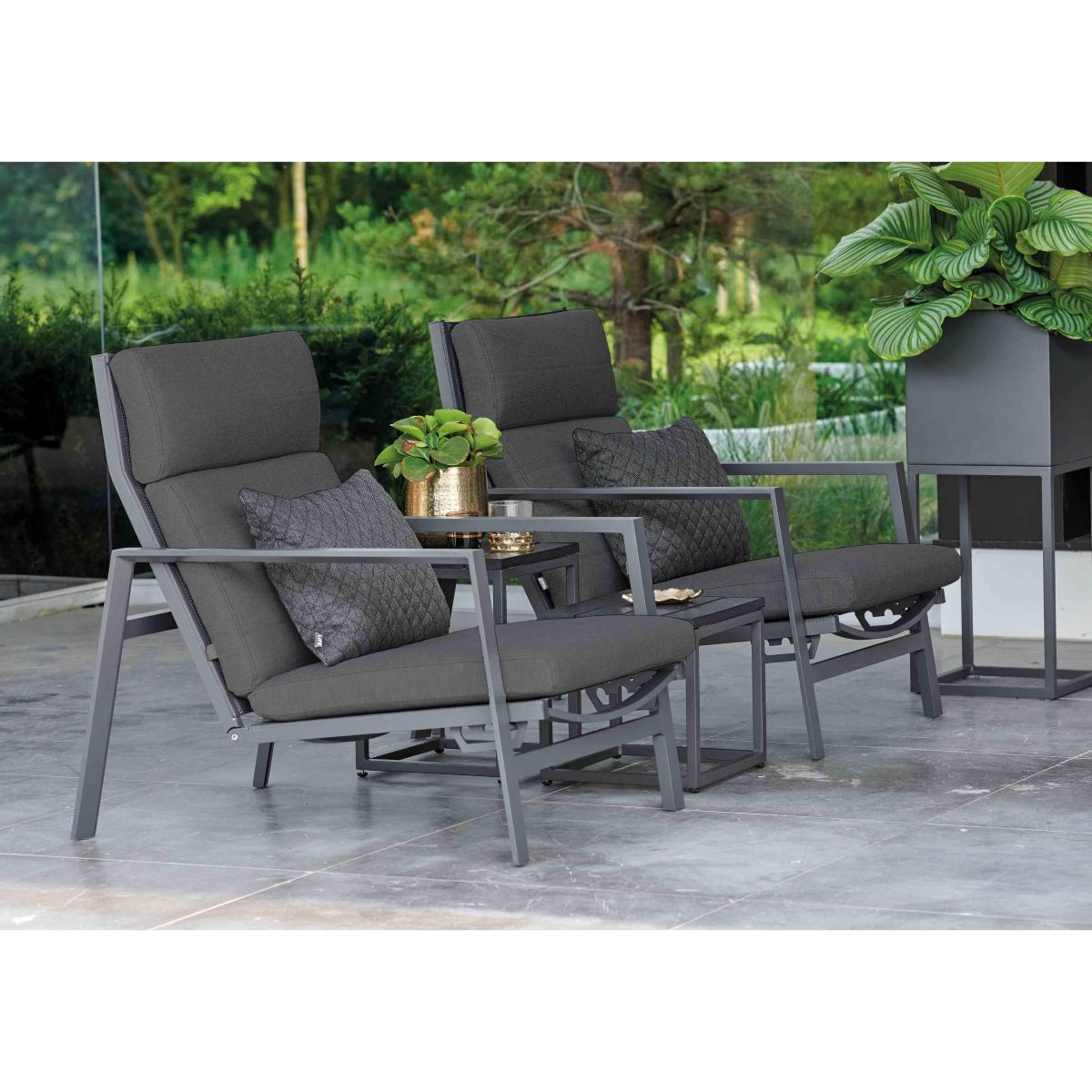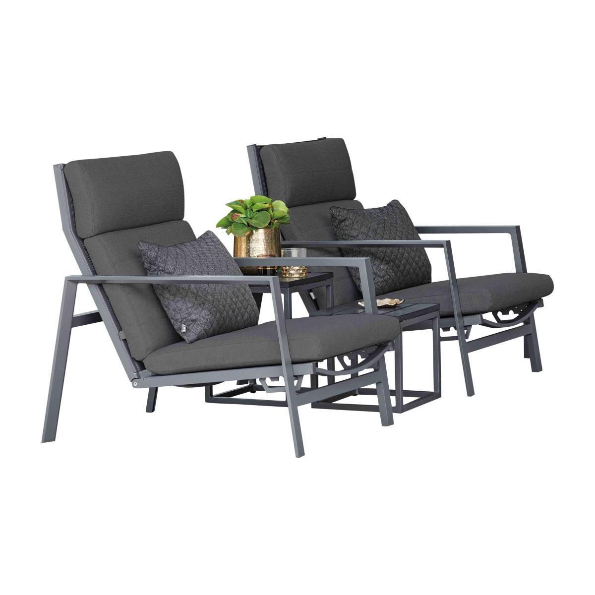 Small garden? You can still relax in style with this contemporary garden set. Chairs recline and with both high and low side tables, it’s easy to keep a cool beverage to hand whatever your angle of relaxation. Why you'll love it. Compact garden furniture is perfect for small patios and city gardens. Contemporary urban style. Set includes 2 reclining garden chairs and 2 side tables of different heights. Slender aluminium chair and table frames in on-trend grey. Light grey all-weather upholstery. Chair cushioning has built-in headrests for extra comfort. Micro-porous cushion fillings allow water to drain away which means no mildew build up. Built to last with a 2-year frame guarantee. A Furniture Village-online exclusive. What you need to know. Frames are made of aluminium. Chair frames and tables can be left outside year round. We recommend the cushions are stored in a dry area during wet weather and when not in use. Aluminium frames should be cleaned with warm soapy water and a soft cloth. Avoid abrasive cloths or chemical cleaners. If your aluminium furniture is exposed to coastal winds, wipe it regularly and cover in winter and in stormy weather. Self assembly required.