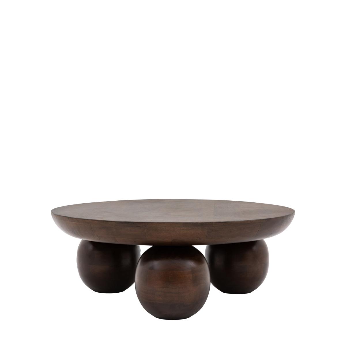 * Dramatic retro look with rich deep finish* Chunky top gently curves away on the underside* Turned ball feet for added elegance* Coordinating items available Offering a dramatic retro look, the Salcombe Round Coffee Table is crafted from mango wood solids with a rich deep finish. Its chunky top gently curves away underneath, complemented by turned ball feet for added elegance. Coordinate with other items for a cohesive retro aesthetic.