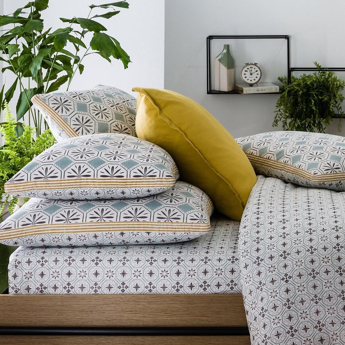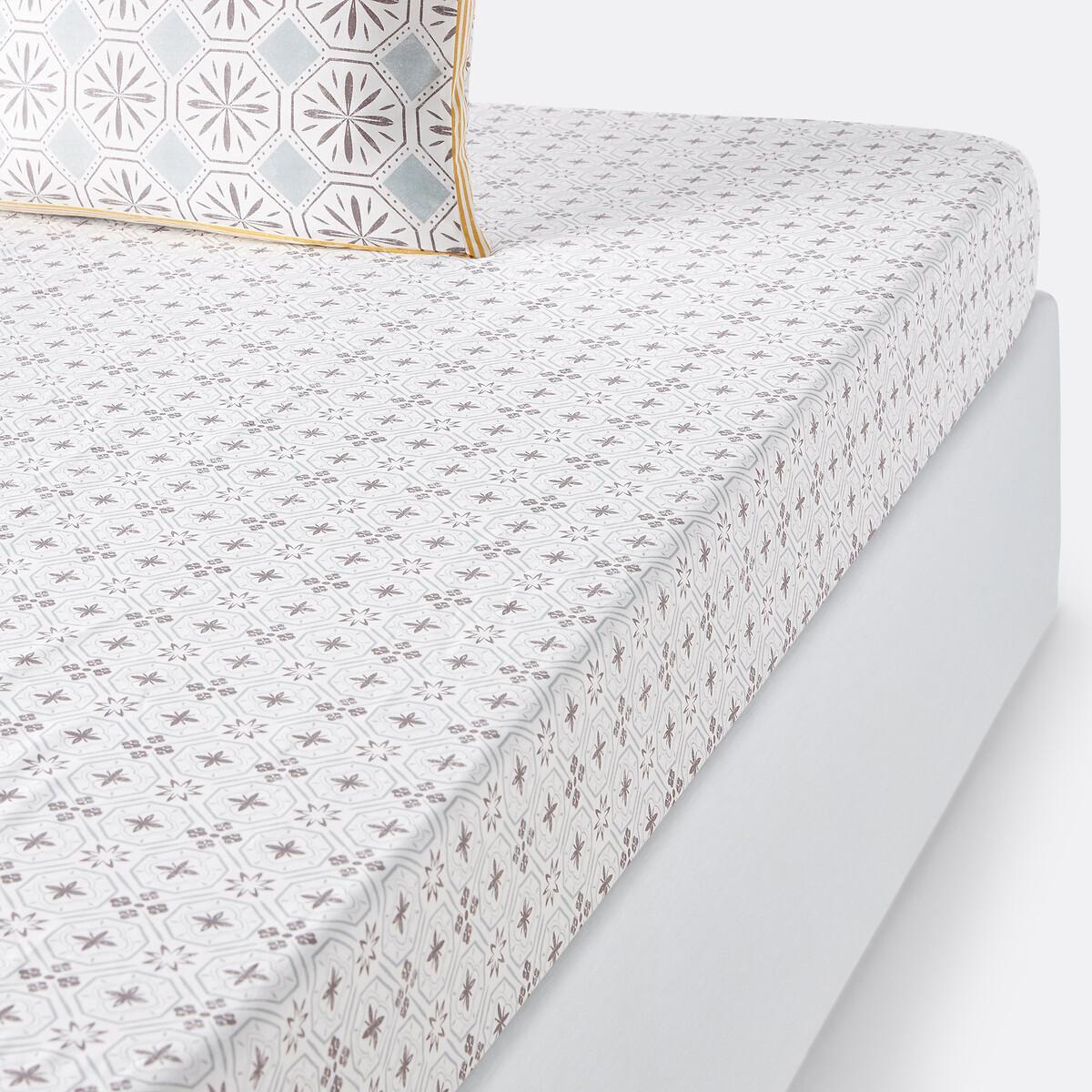 The Salernes fitted sheet. Crafted from soft cotton, the Salernes bedding is printed in a pattern inspired by Zellige tile..Cotton is part of our daily lives. We love it for its suppleness and softness. Easy Care, it is ideal for the beds of young and old alike!Product Details • 100% cotton • 144 thread count • For mattress height 25cm • All-over micro-print. Care Advice • Machine washable at 60°C • By washing your laundry at 40°C instead of 60°C, you limit energy consumption. Dimensions • 90 x 190cm: Single • 140 x 190cm: King • 160 x 200cm: King • 180 x 200cm: King • OEKO-TEX® Standard 100. Standard 100 certification by OEKO-TEX® tests textile products for harmful substances via an independent, international label.