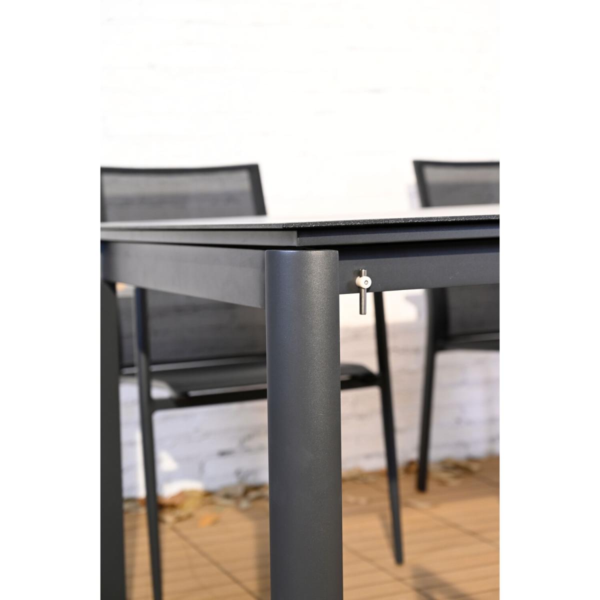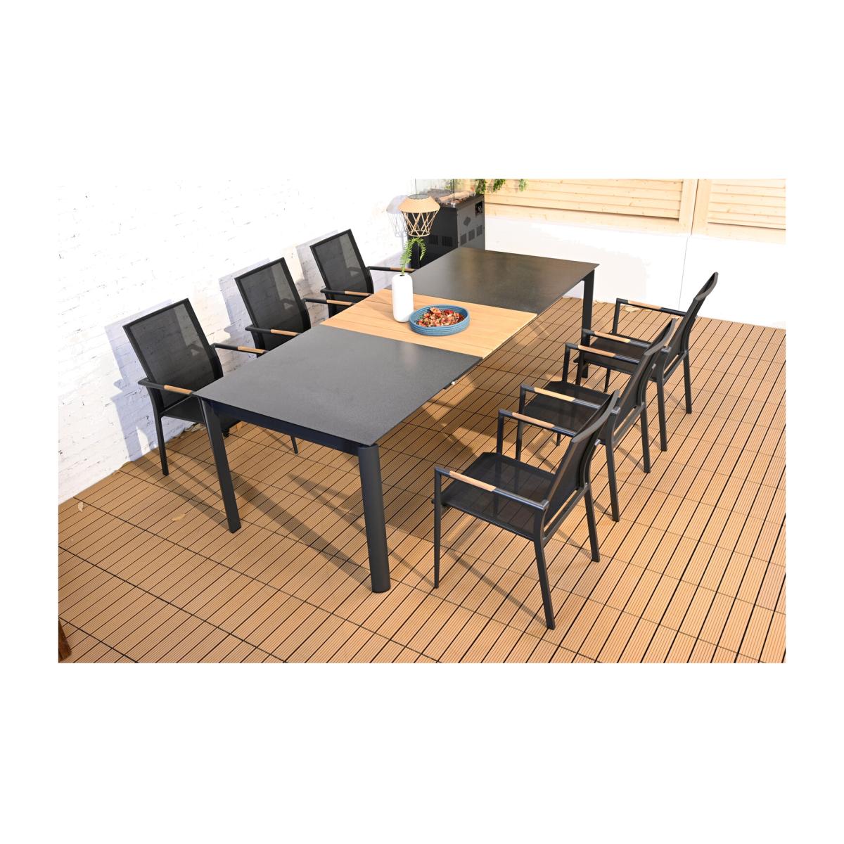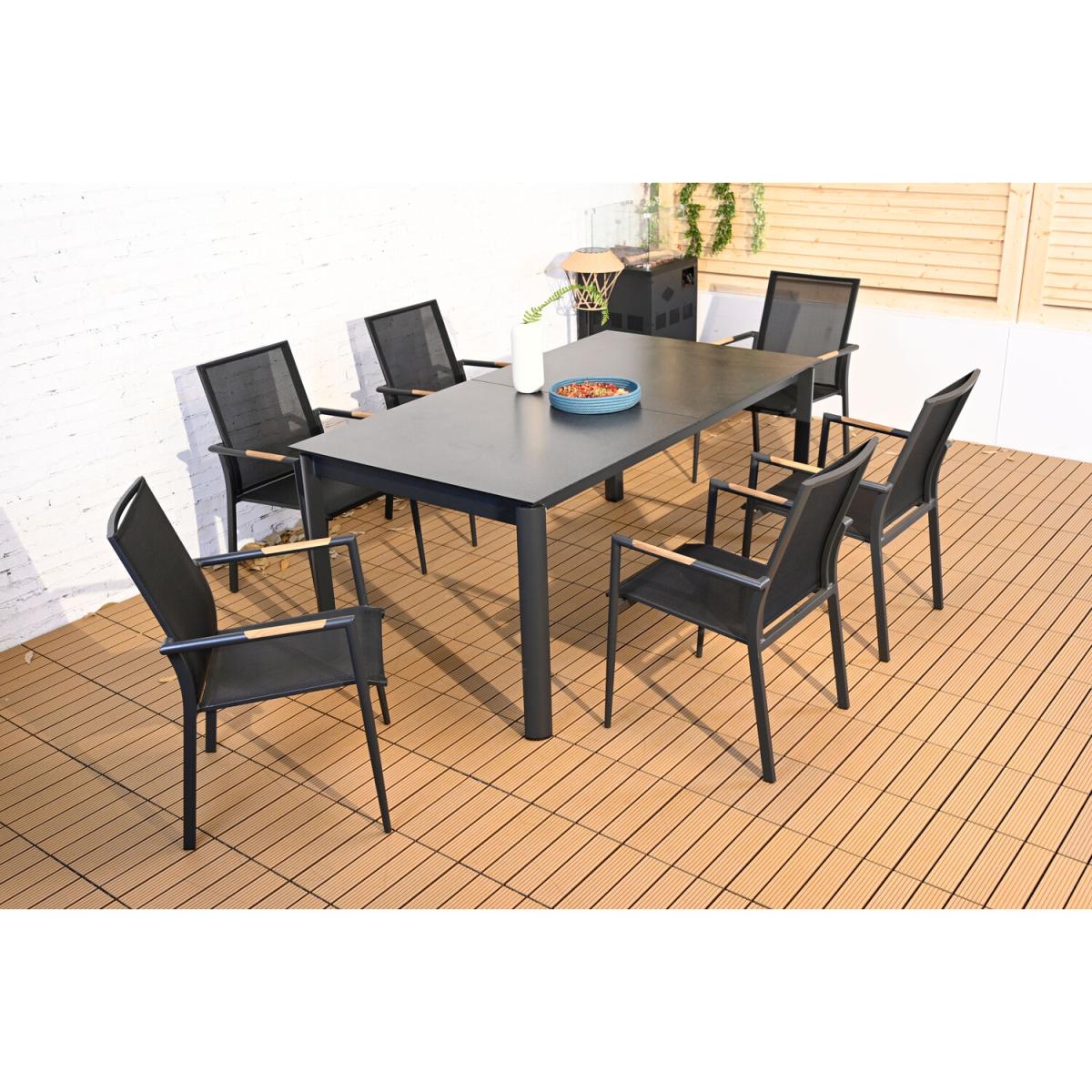 The Salerno 7 Piece Dining Set is a beautiful and modern set that would be a great addition to any garden, patio or decking area. The table can be extended to accommodate garden parties, BBQs, or just for a cosy evening outdoors. The aluminium frame is lightweight and has a sleek black finish that complements any garden decor. The chairs are stackable, which makes them easy to store, and come with teakwood armrests for added comfort while relaxing in the sun. This elegant garden furniture set is sure to make a statement and impress all your guests.