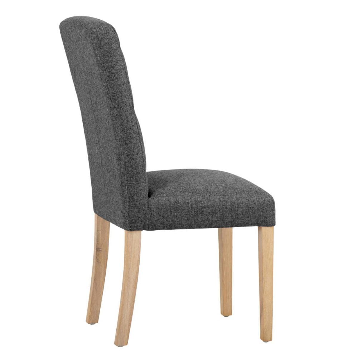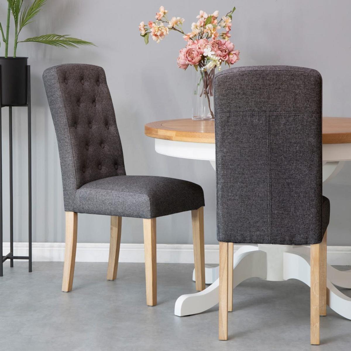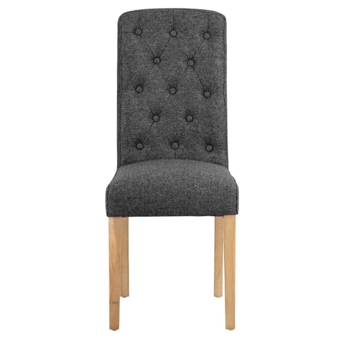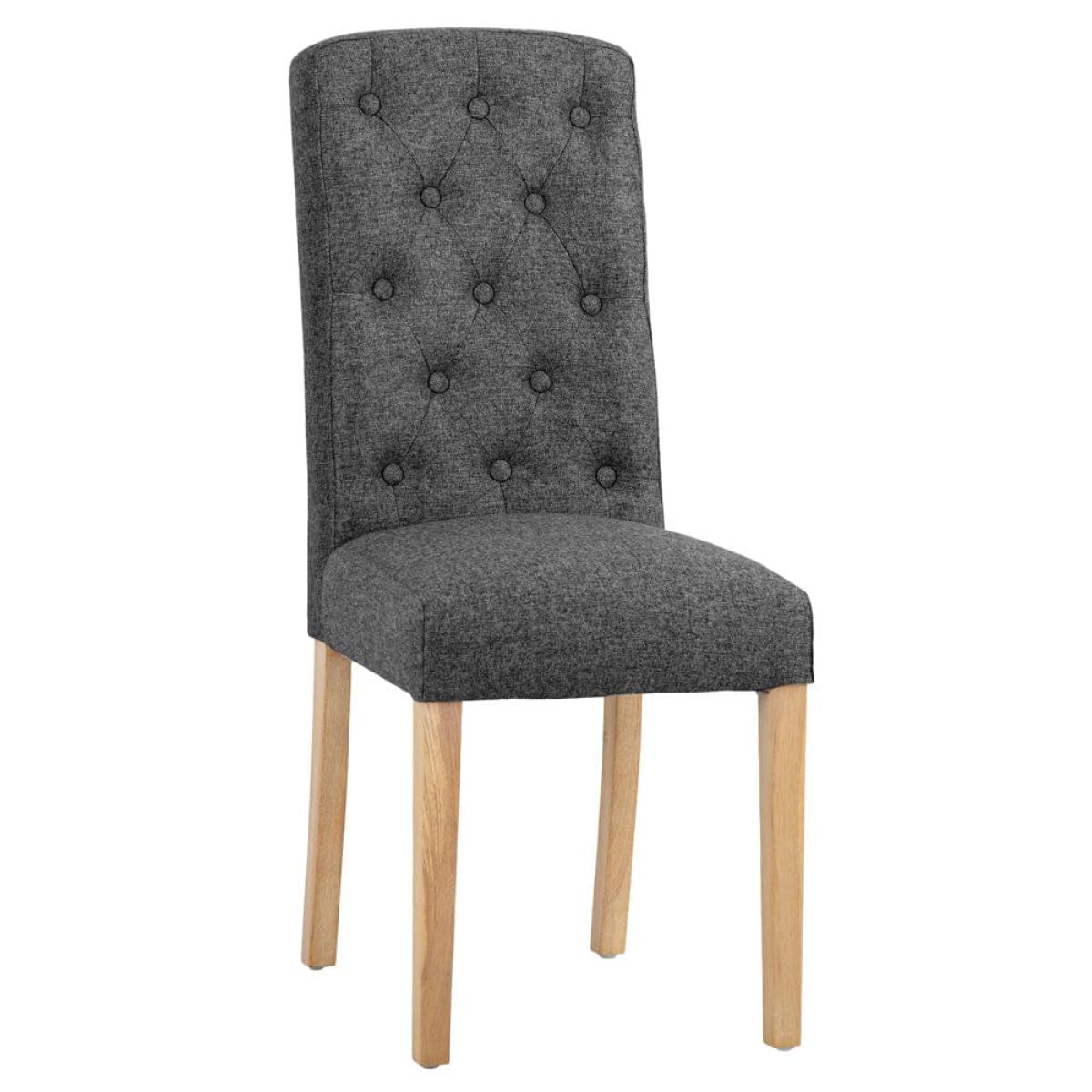 Choose our Salerno dark grey classic button-back dining chair and invite all the elegance of its namesake Italian city into your home. This conversation starter of a chair is upholstered in a high-quality fabric that’s just as suitable for family mealtimes as it is for special celebrations. The charcoal grey hue brings a touch of sophistication to your dining space, while our pale solid oak legs make a striking contrast. This chair is generously padded, and the tall, curved seat back gives you plenty of support. Diamond-shaped studding keeps you extra comfortable and makes this statement piece even more easy on the eye.