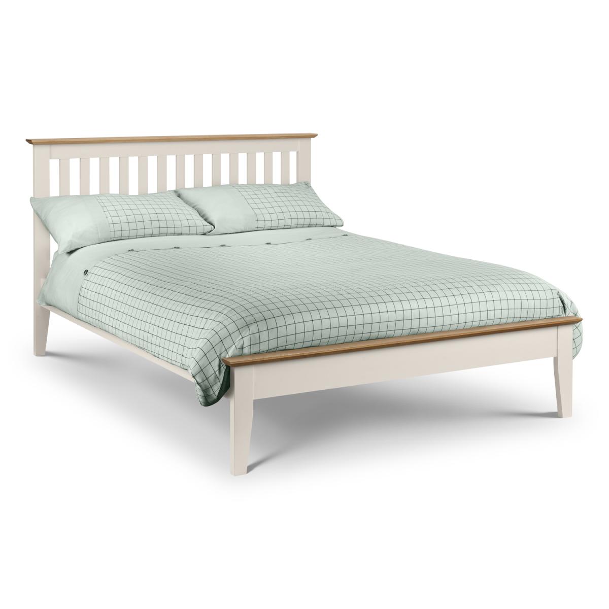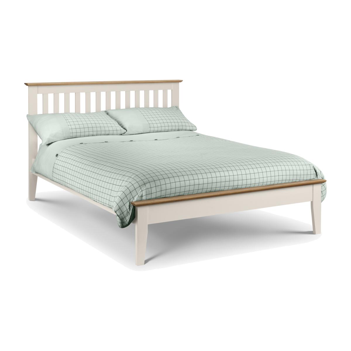 A timeless style with refined detailing, this Salerno Two Tone Bed Frame fits in with a wide range of decor. Made from a durable natural oak with solid white oak cappings, this bed features a sprung slatted base for extra comfort while providing additional mattress life. Available in three different sizes, this bed frame is sure to be a new welcome addition into your bedroom.