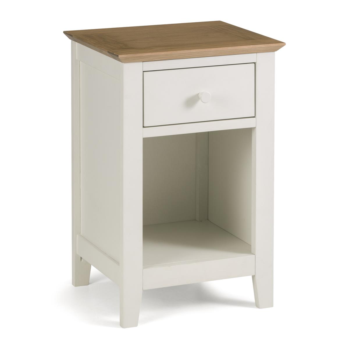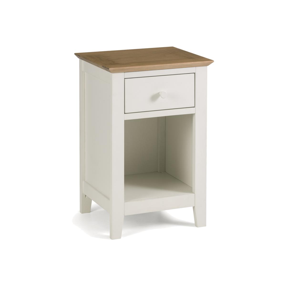 Presented in an elegant Shaker style, this Salerno Two Tone One Drawer Bedside Table incorporates a handy storage drawer. A clean, simple, two tone design, this table offers a timeless appeal and fits well into any bedroom space. Manufactured from a combination of high grade solid oak and oak veneers, this table combines quality materials with a robust construction to fit perfectly into your bedroom.