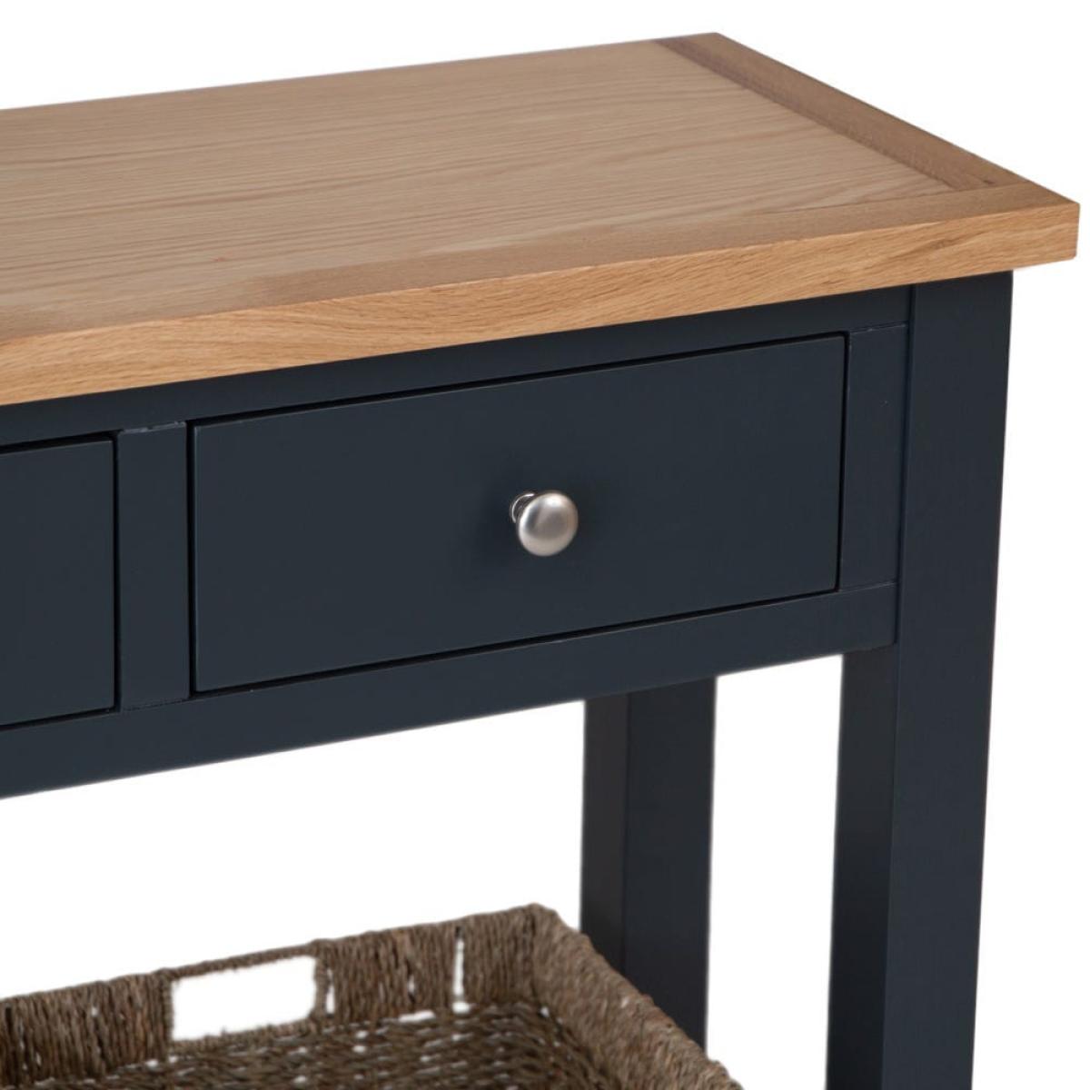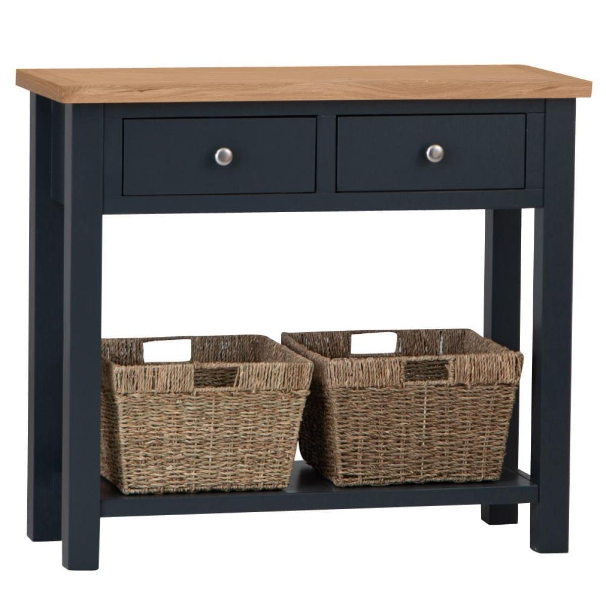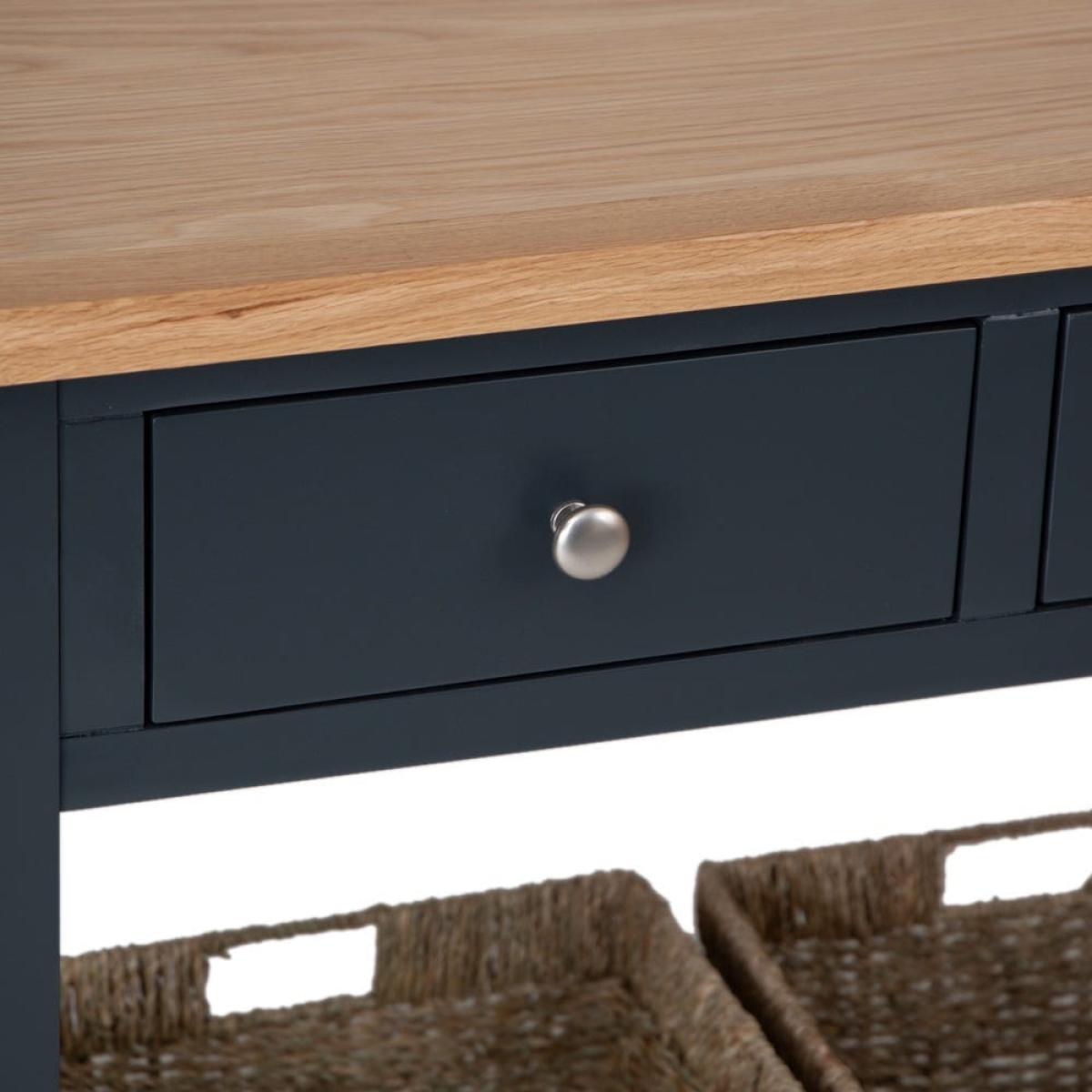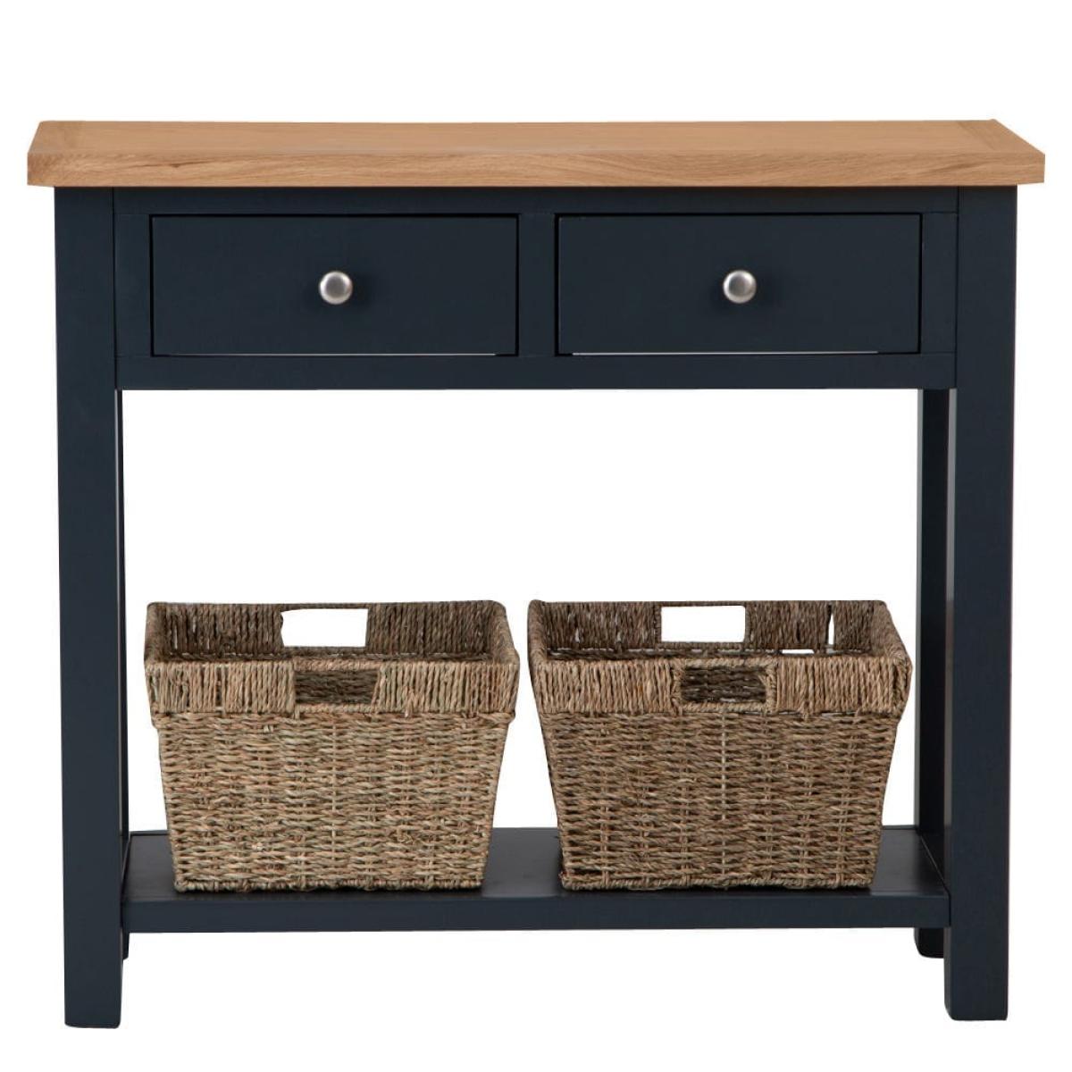 This classic Salisbury blue painted oak console table with wicker baskets delivers storage with a twist: it comes with portable wicker baskets alongside the pair of fixed drawers. Its elegant dark blue finish is enhanced by our golden oak top to create a colourway that fits seamlessly into any space. The chrome drawer handles add a luxurious finish. The two drawers are spacious enough for gloves, hats and keys, and the wicker baskets can easily accommodate trainers and sports gear. Alternatively, show off this elegant unit in your living room bedecked with your favourite vases, framed photos and pot plants.