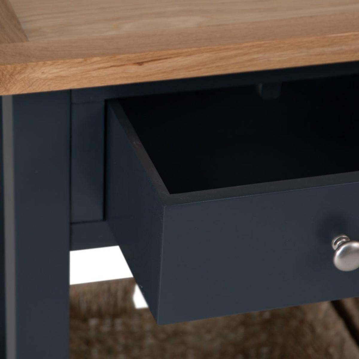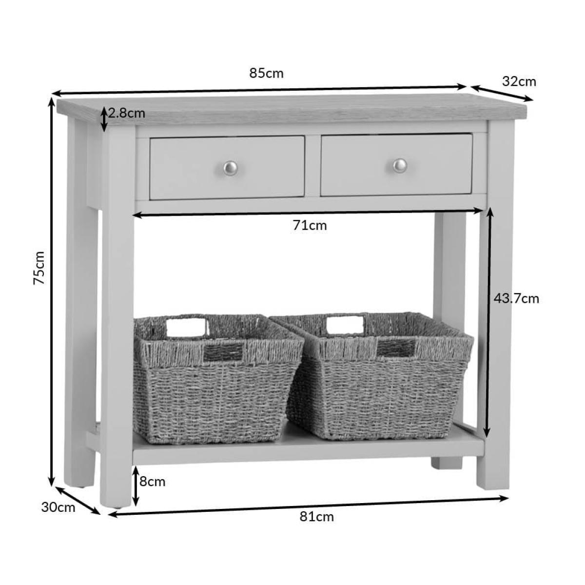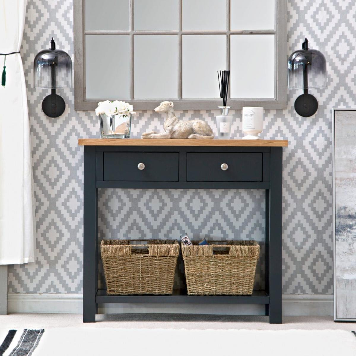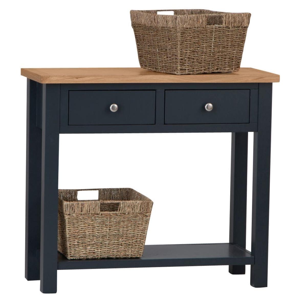 This classic Salisbury blue painted oak console table with wicker baskets delivers storage with a twist: it comes with portable wicker baskets alongside the pair of fixed drawers. Its elegant dark blue finish is enhanced by our golden oak top to create a colourway that fits seamlessly into any space. The chrome drawer handles add a luxurious finish. The two drawers are spacious enough for gloves, hats and keys, and the wicker baskets can easily accommodate trainers and sports gear. Alternatively, show off this elegant unit in your living room bedecked with your favourite vases, framed photos and pot plants.