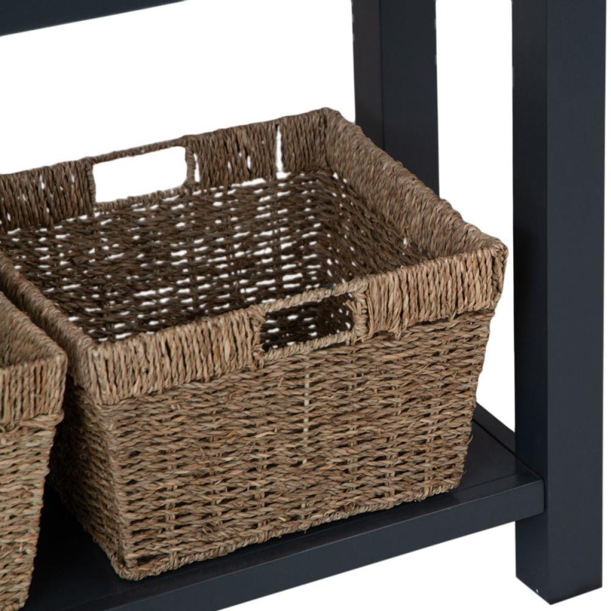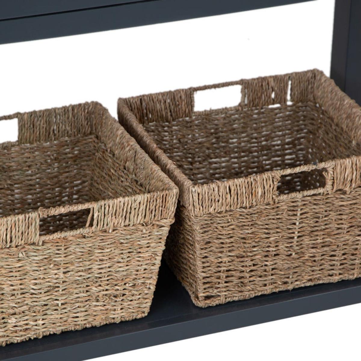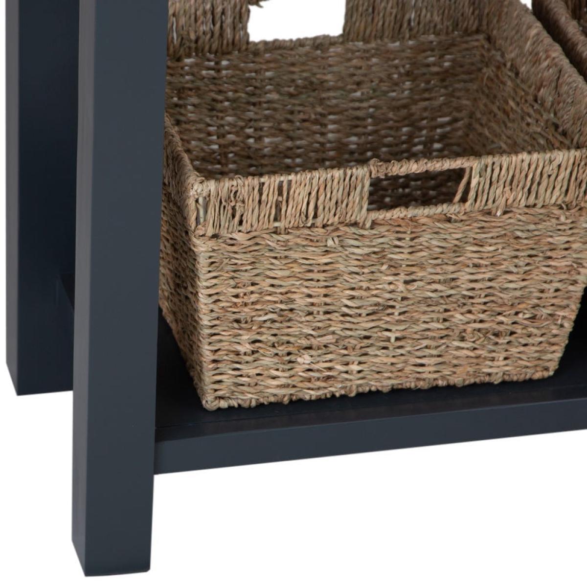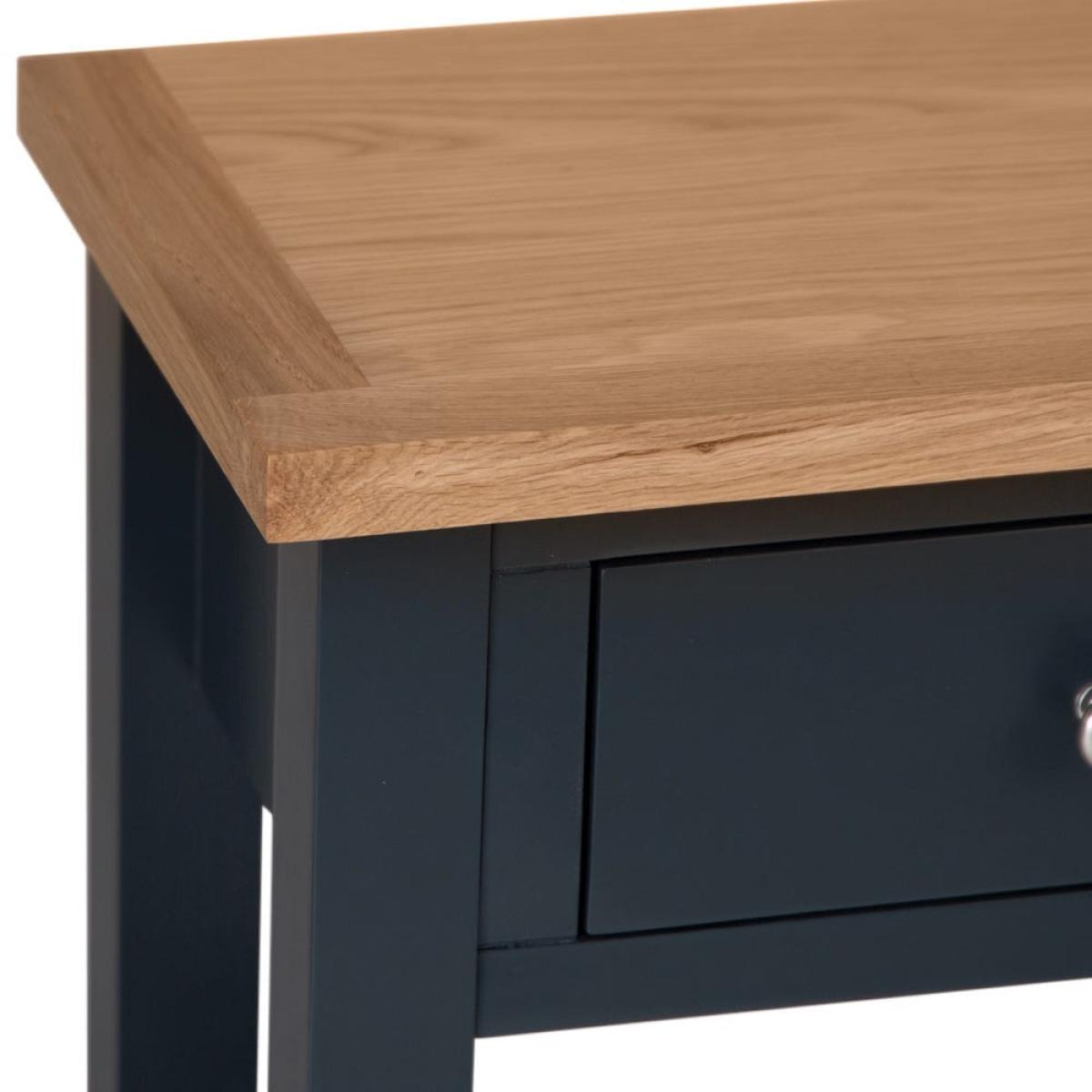 This classic Salisbury blue painted oak console table with wicker baskets delivers storage with a twist: it comes with portable wicker baskets alongside the pair of fixed drawers. Its elegant dark blue finish is enhanced by our golden oak top to create a colourway that fits seamlessly into any space. The chrome drawer handles add a luxurious finish. The two drawers are spacious enough for gloves, hats and keys, and the wicker baskets can easily accommodate trainers and sports gear. Alternatively, show off this elegant unit in your living room bedecked with your favourite vases, framed photos and pot plants.