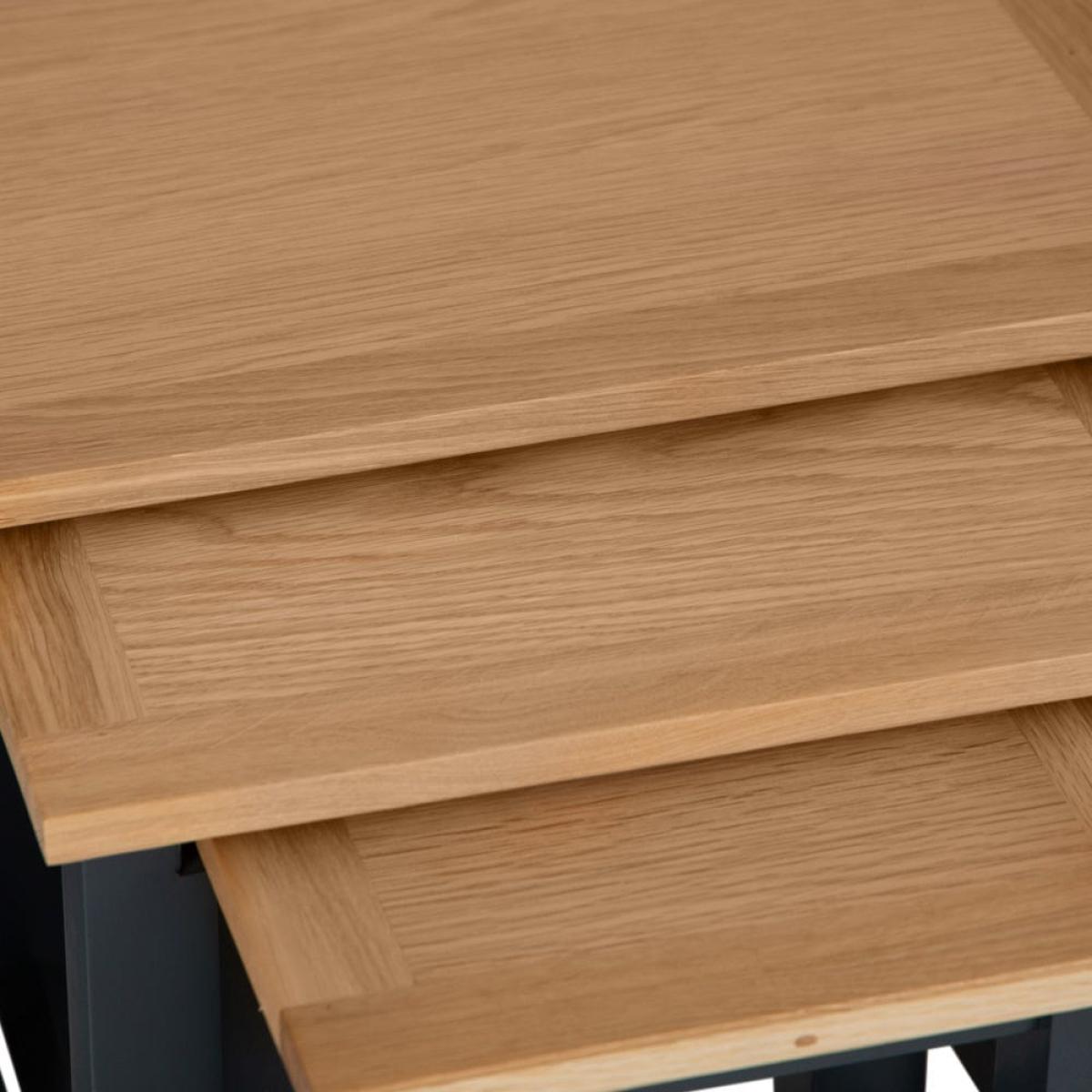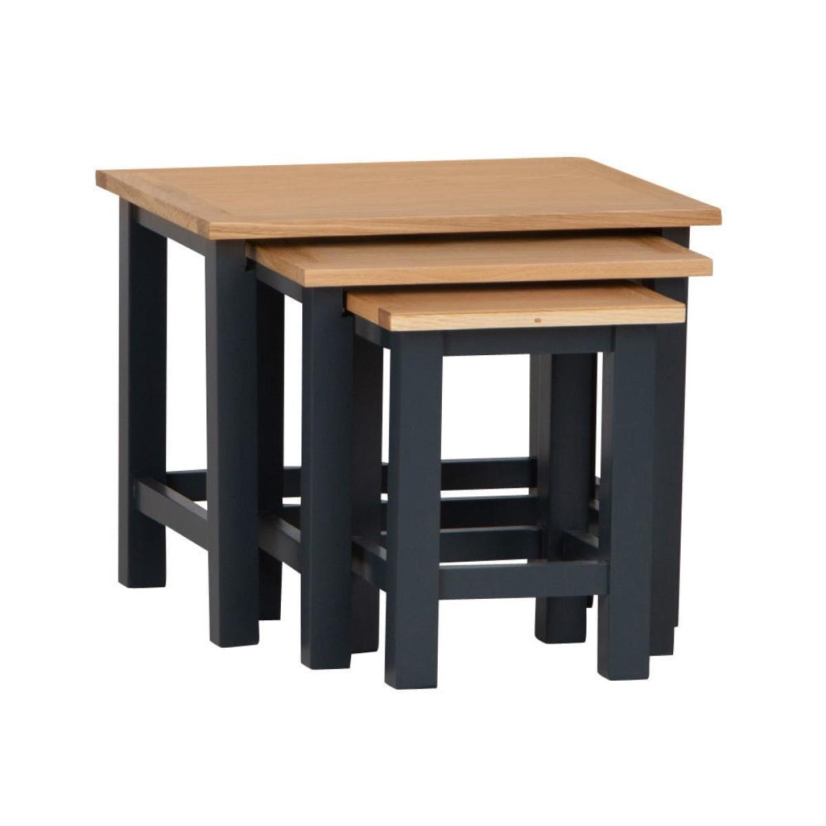 This Salisbury blue painted oak nest of 3 tables is a clever space-saver with stacks of style. Use the tables separately for drinks and snacks when you’re hosting guests or chilling out as a family. They nest neatly back together when you need to reclaim some floor space. Our classic dark blue finish enhances the square legs to create a striking silhouette against both plain and patterned walls. The natural oak top adds a note of rustic charm. You can also use these tables anywhere in your home as permanent display units for framed family snaps, soft lighting or your favourite ornaments.