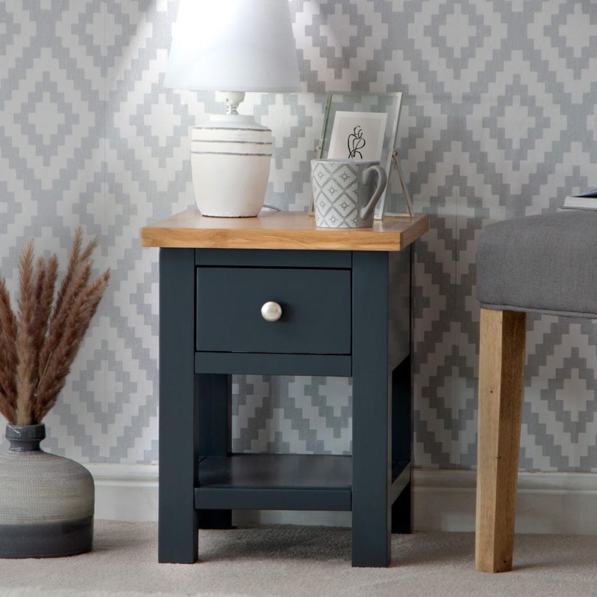 I love this little table for its versatile style and compact form, making it perfect for both contemporary and traditional interiors. Its painted blue finish adds a subtle pop of colour without overpowering the space, while the oak top brings warmth and texture. It works well beside a sofa or armchair, where it can hold a lamp, books or a decorative tray. Practical styling tips include layering with a small plant or a favourite mug to keep it looking lived-in and inviting, or adding a couple of personal touches like framed photos or candles to make it feel more personalised. Its slim design makes it ideal for small spaces, offering function and style without crowding the room.