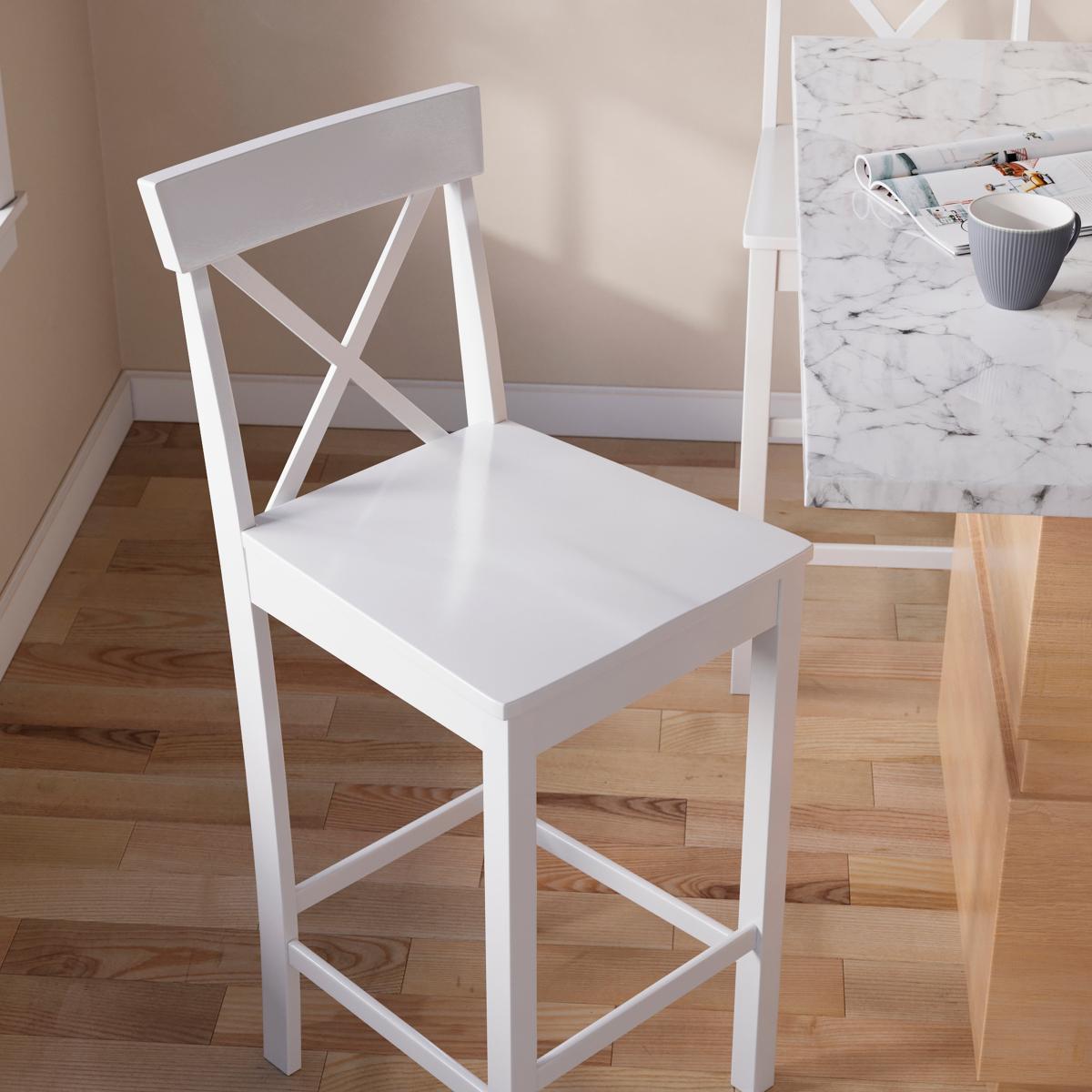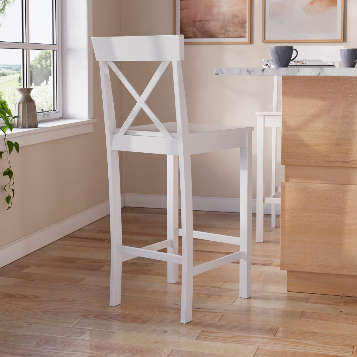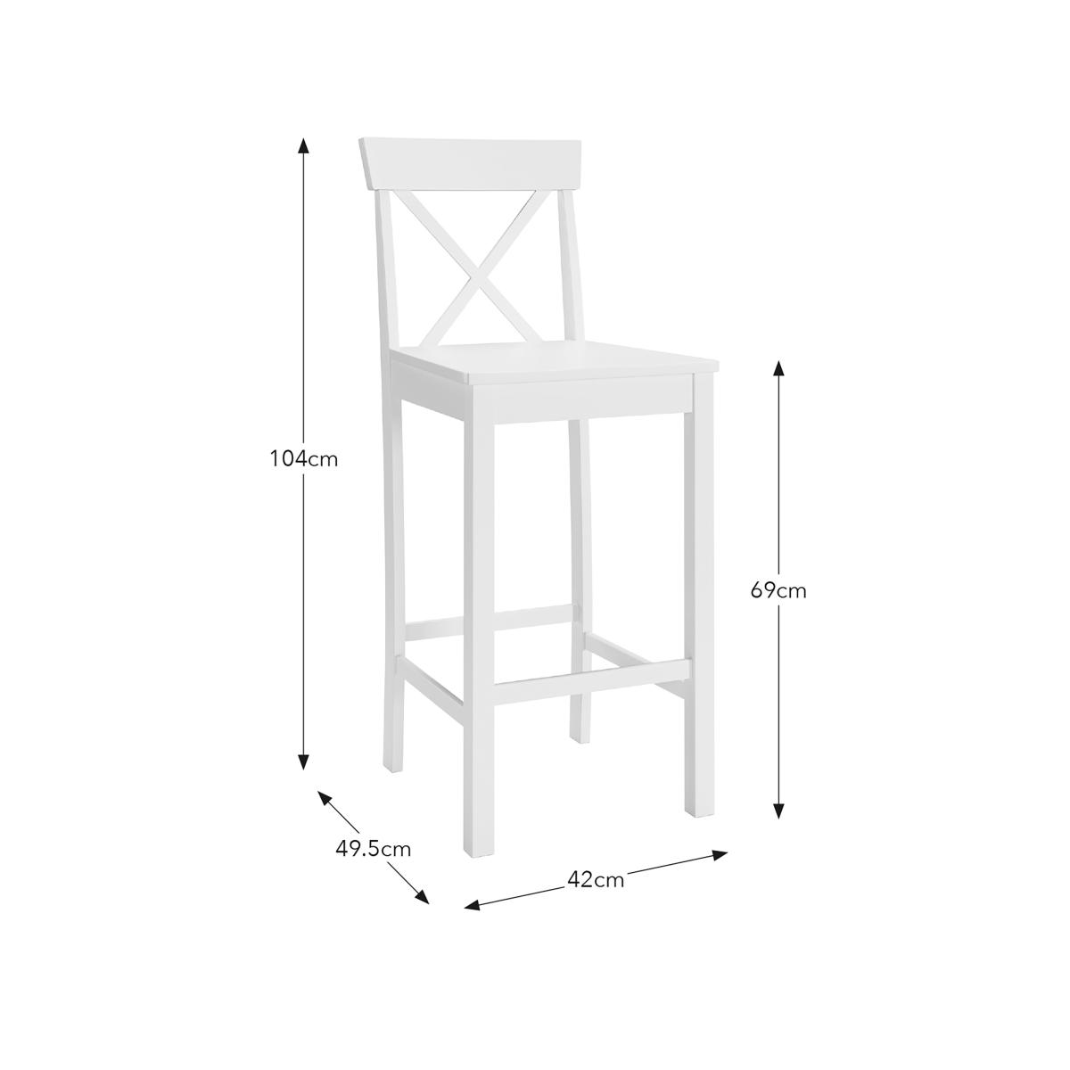 Dunelm Exclusive - Designed and Developed by Dunelm Designed to work for standard UK kitchen height, this self-assembly bar chair is stylishly crafted with a wooden frame and a painted sculptured seat. Made from durable rubberwood, this classic bar chair features a crossed back, perfect to suit any interior. Seat Height 69cm Seat Width 42cm Seat Depth 42cm Please Note: This product and any of its fabrics have been manufactured for domestic use only.