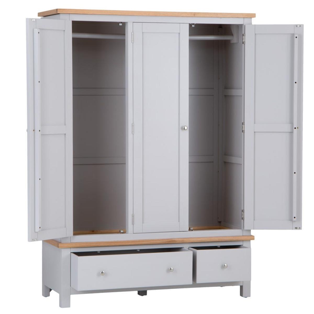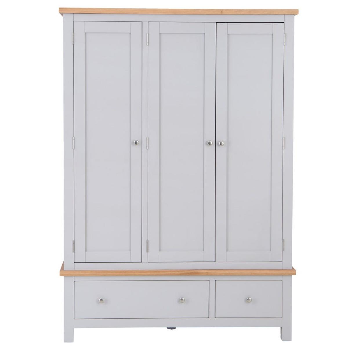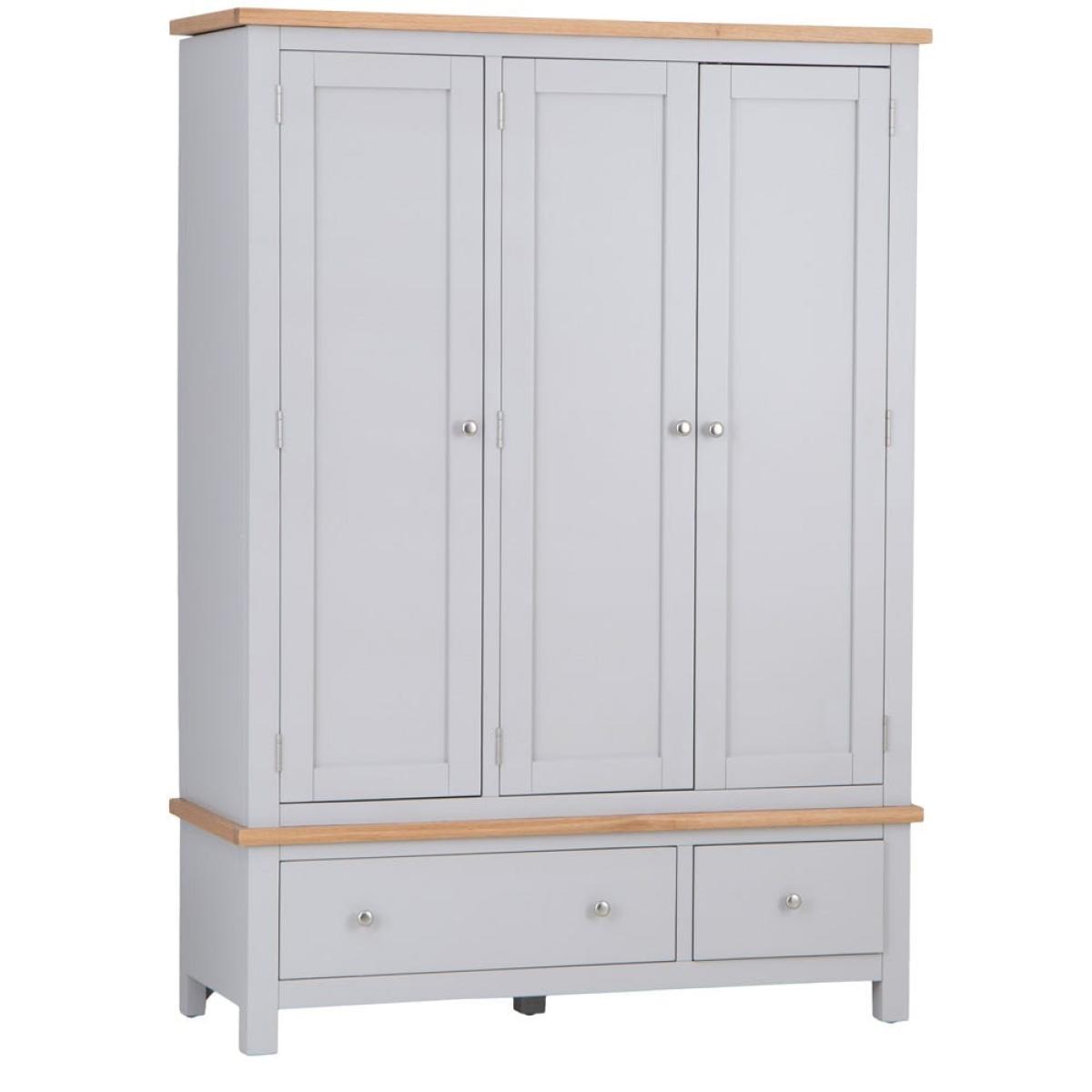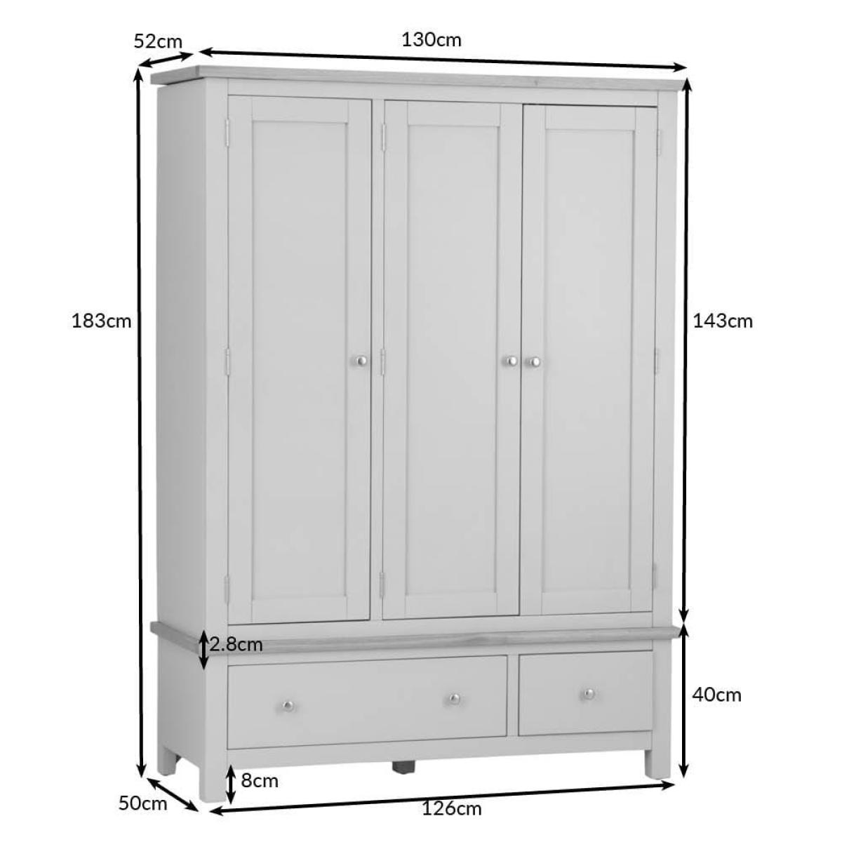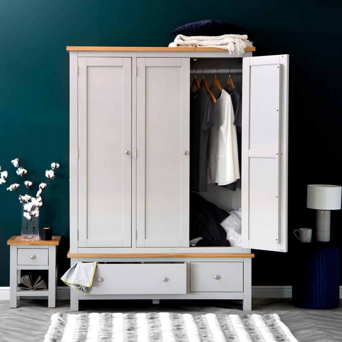 You shall go to the ball with this elegant Salisbury grey painted oak 3-door wardrobe. This statement piece is worthy of any Cinderella, and has more than enough space for Prince Charmings too. It has 130cm of hanging width to keep shirts, suits – and yes, ballgowns – crisp and crease-free. A pair of drawers is ideal for bags, belts and other accessories. The sophisticated pearl-grey hue brings understated luxury to any style of bedroom, and the natural oak top and trim provide a contrasting rustic touch. Our signature chrome handles add discreet shine. Now where did we put our glass slippers …?.