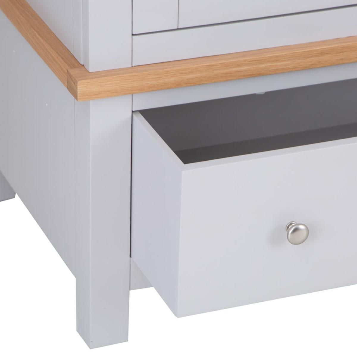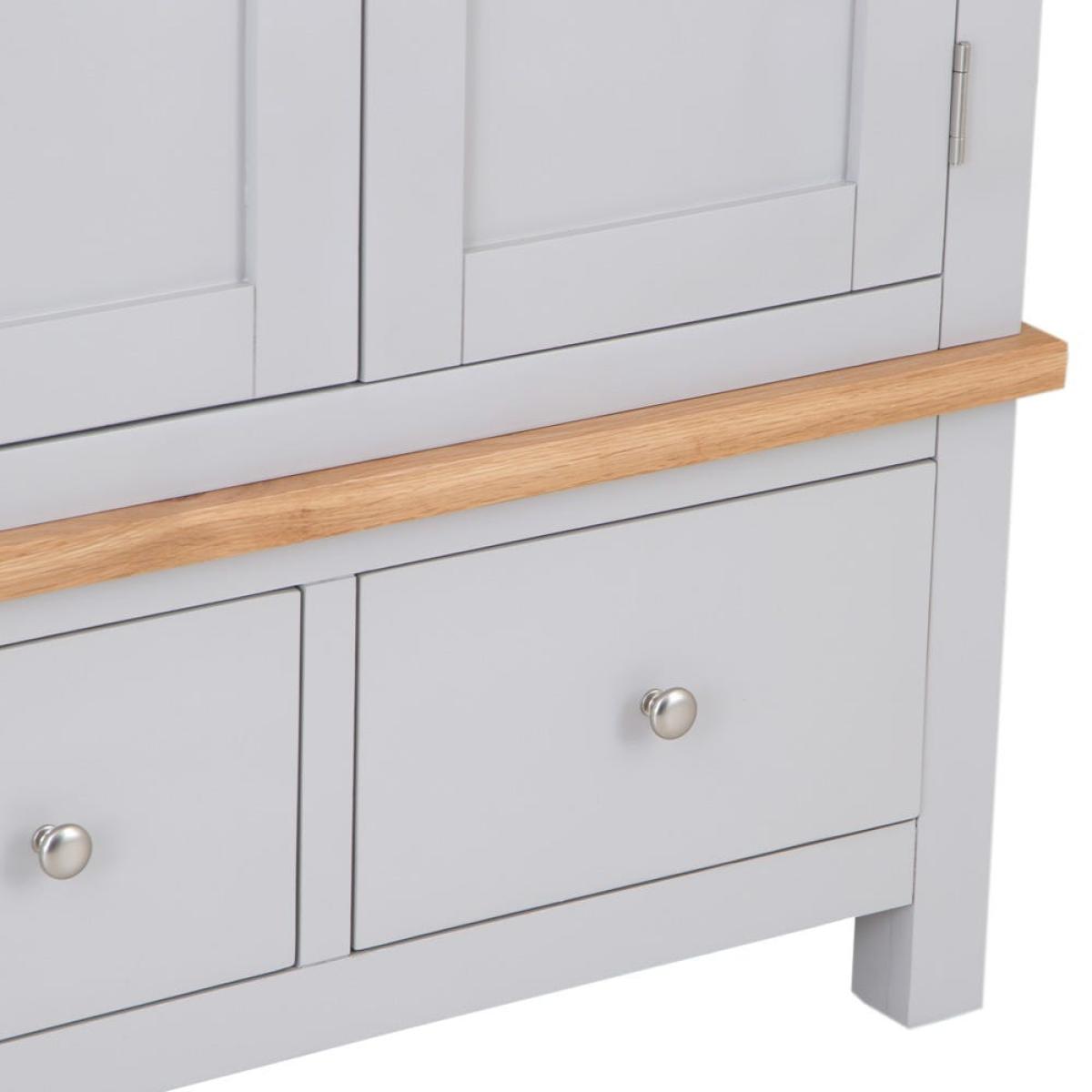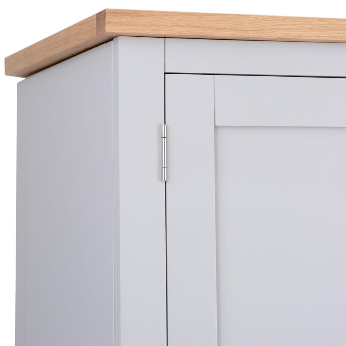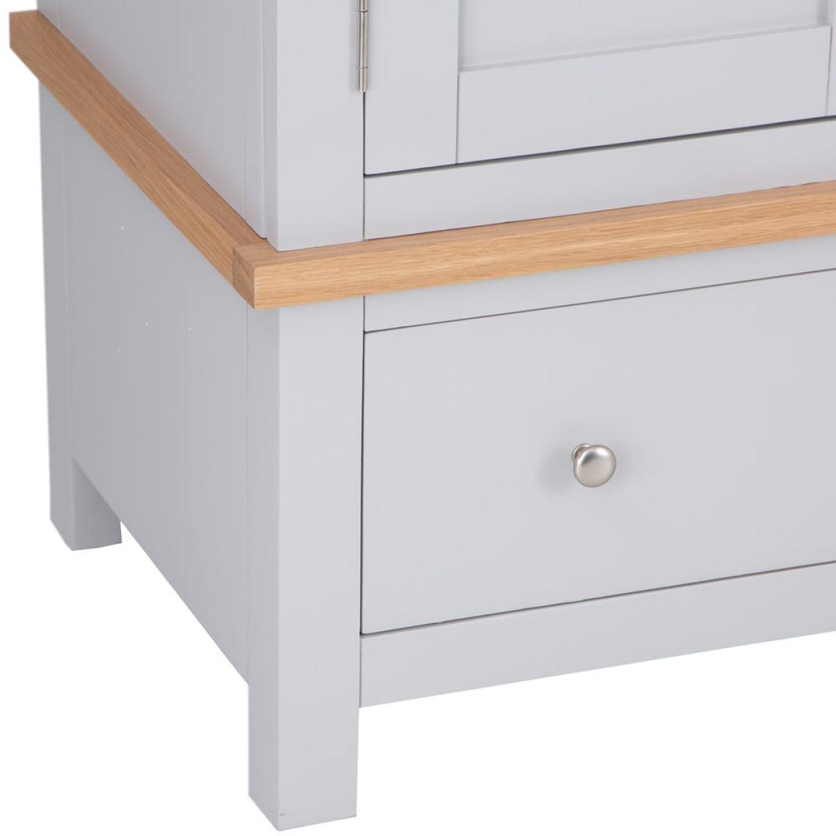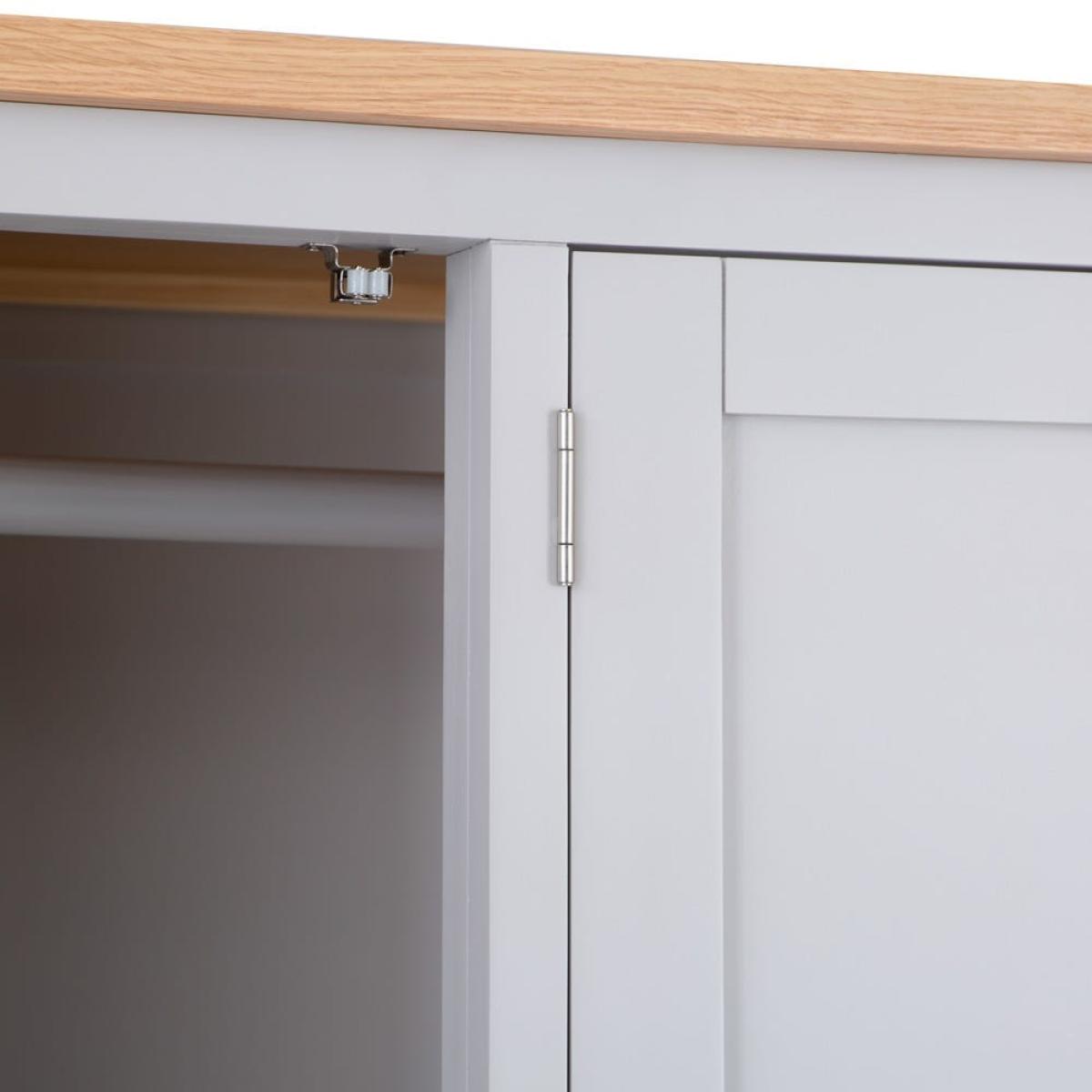 You shall go to the ball with this elegant Salisbury grey painted oak 3-door wardrobe. This statement piece is worthy of any Cinderella, and has more than enough space for Prince Charmings too. It has 130cm of hanging width to keep shirts, suits – and yes, ballgowns – crisp and crease-free. A pair of drawers is ideal for bags, belts and other accessories. The sophisticated pearl-grey hue brings understated luxury to any style of bedroom, and the natural oak top and trim provide a contrasting rustic touch. Our signature chrome handles add discreet shine. Now where did we put our glass slippers …?.