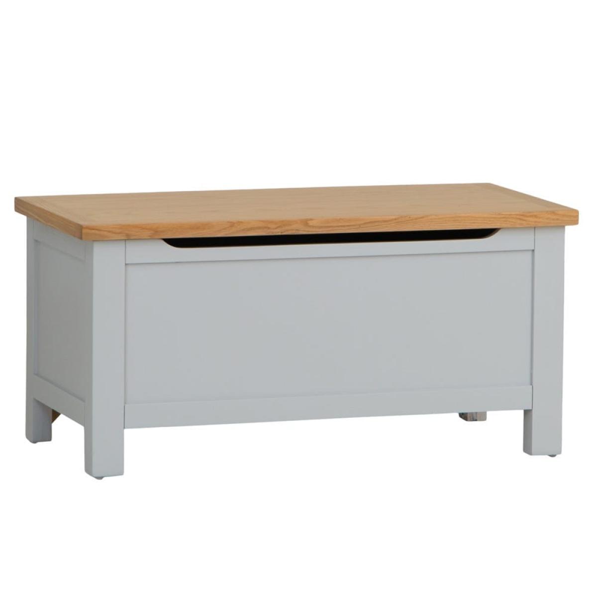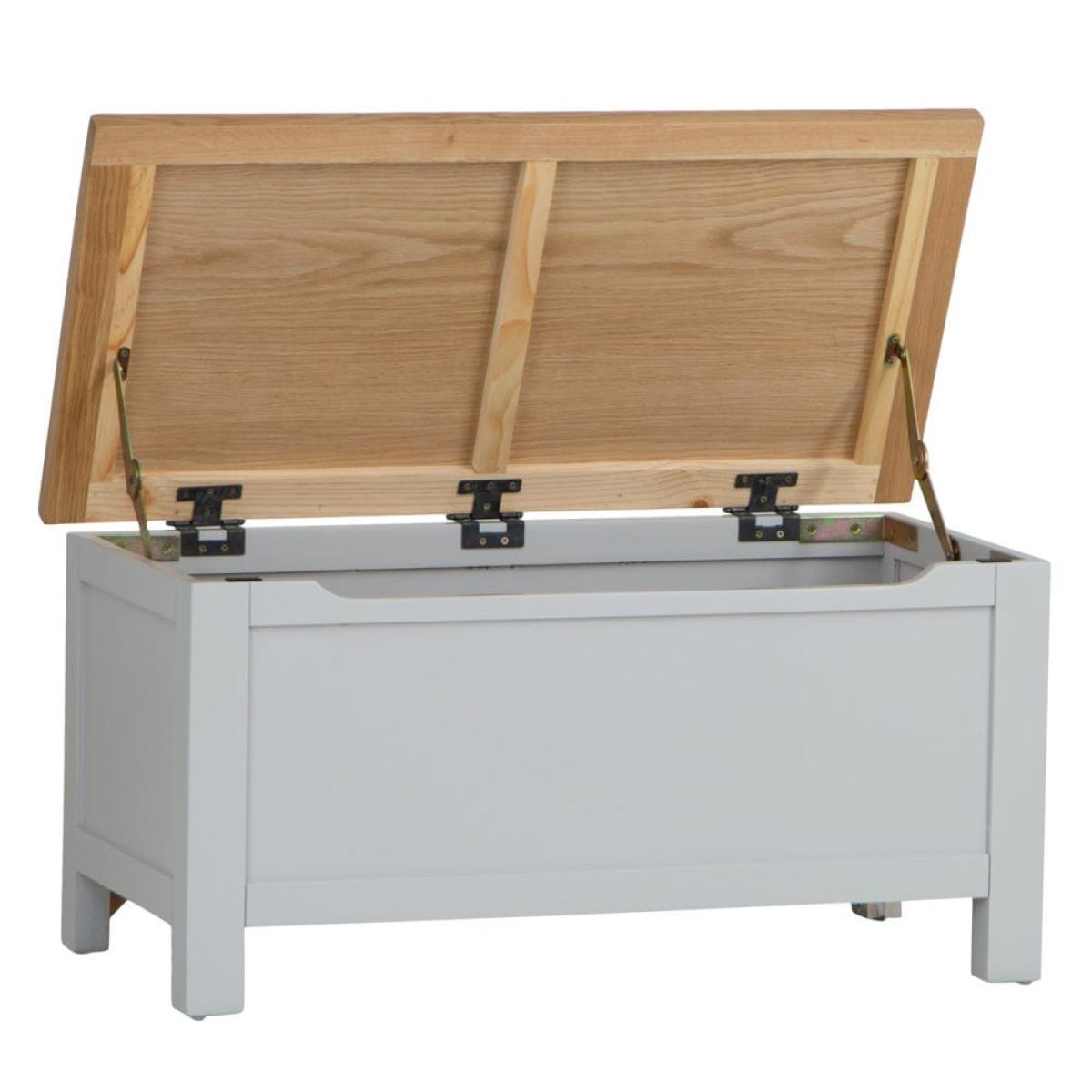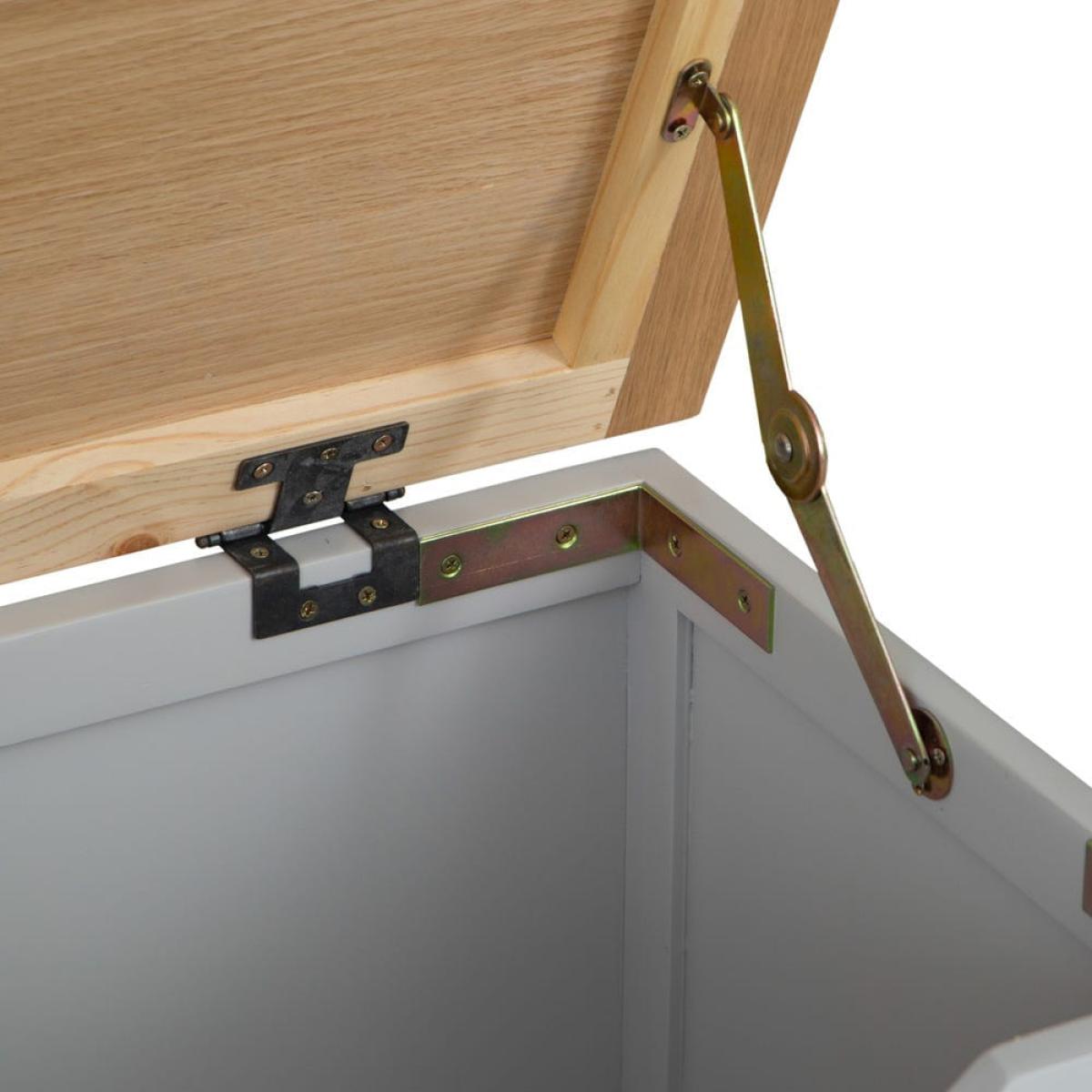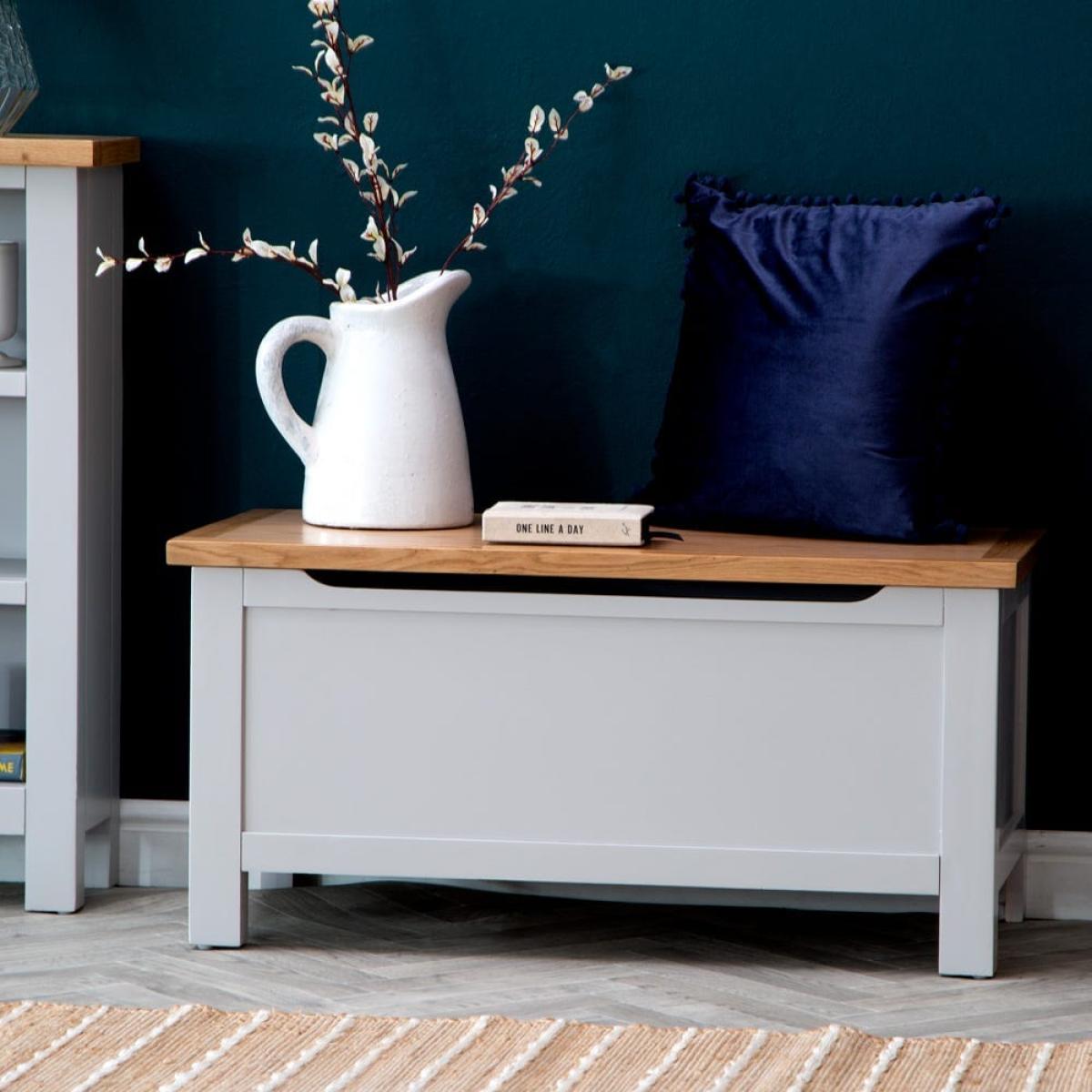 This Salisbury grey painted oak blanket box fits neatly at the foot of a double bed for spare quilts and cushions – and provides a useful perch for you, too. The timeless pale grey finish suits both simple spaces and elaborate decor, and the golden oak lid adds a rustic touch. A folding stay hinge makes it easy to rummage around for whatever you need. You can also keep this versatile item in your living room to store kids’ toys and boardgames. This blanket box comes ready assembled, so you can get straight down to filling it up.