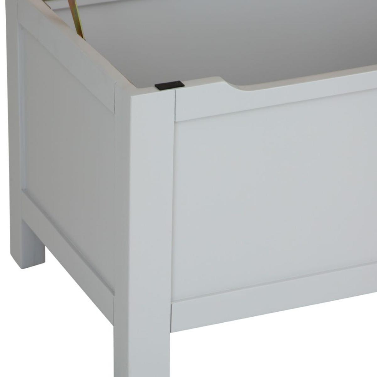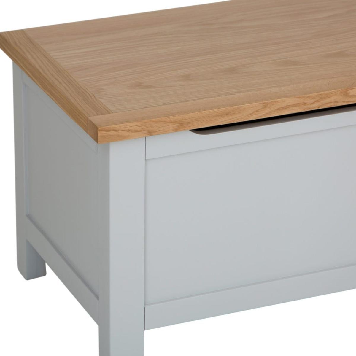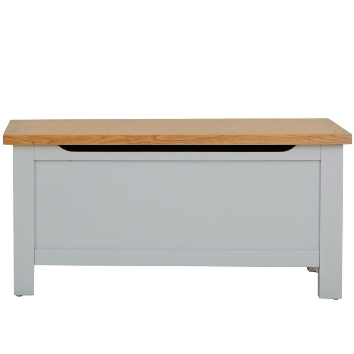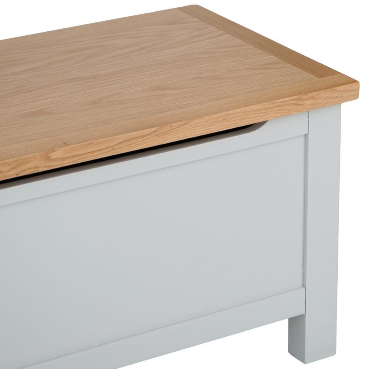 This Salisbury grey painted oak blanket box fits neatly at the foot of a double bed for spare quilts and cushions – and provides a useful perch for you, too. The timeless pale grey finish suits both simple spaces and elaborate decor, and the golden oak lid adds a rustic touch. A folding stay hinge makes it easy to rummage around for whatever you need. You can also keep this versatile item in your living room to store kids’ toys and boardgames. This blanket box comes ready assembled, so you can get straight down to filling it up.