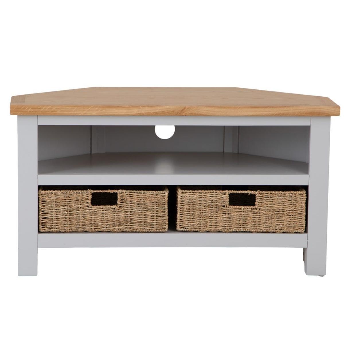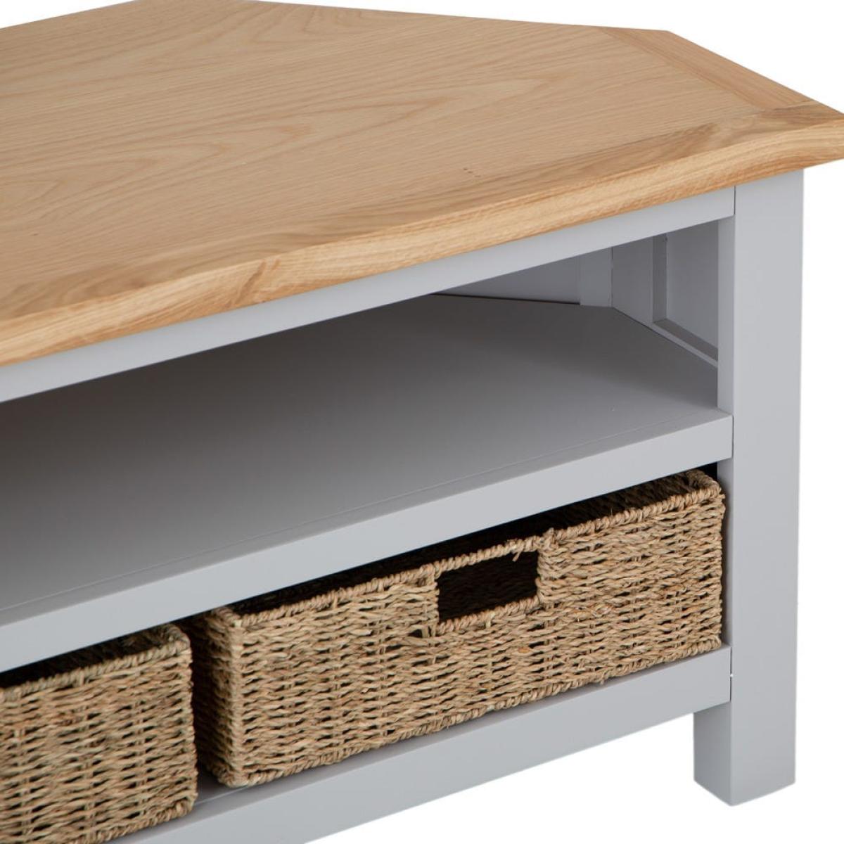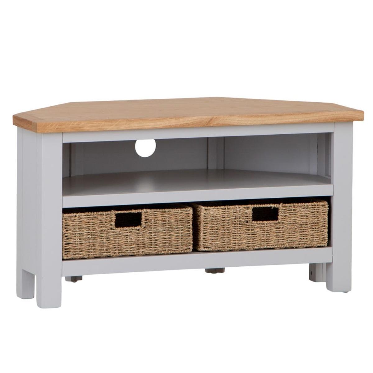 Enhance family movie nights with our Salisbury grey painted oak corner TV unit with wicker baskets. The top is D-shaped to sit unobtrusively in the corner of your living room, and at 90cm wide, it accommodates mid-sized TVs with room for some decorative touches too. Our elegant pale grey is a classic neutral that fits seamlessly into any space. Seagrass wicker baskets add a natural feel, and you can pull them out to rifle through their contents for that ever-elusive remote. The shelf is custom-designed for your DVD or Blu-ray player with a hole to keep wires tidy too.