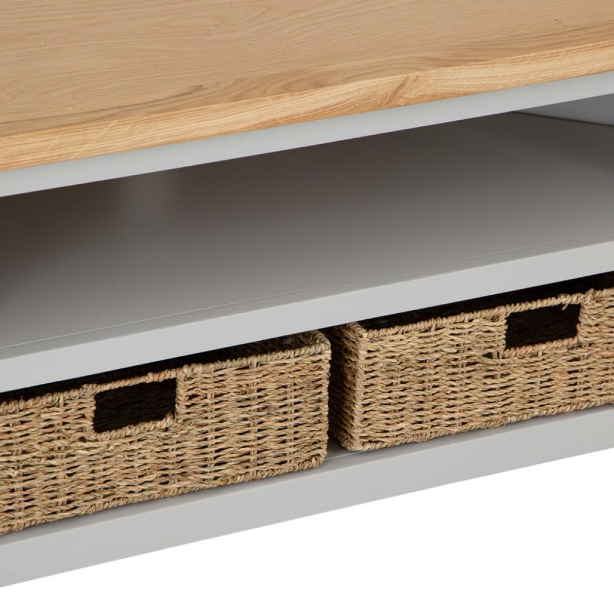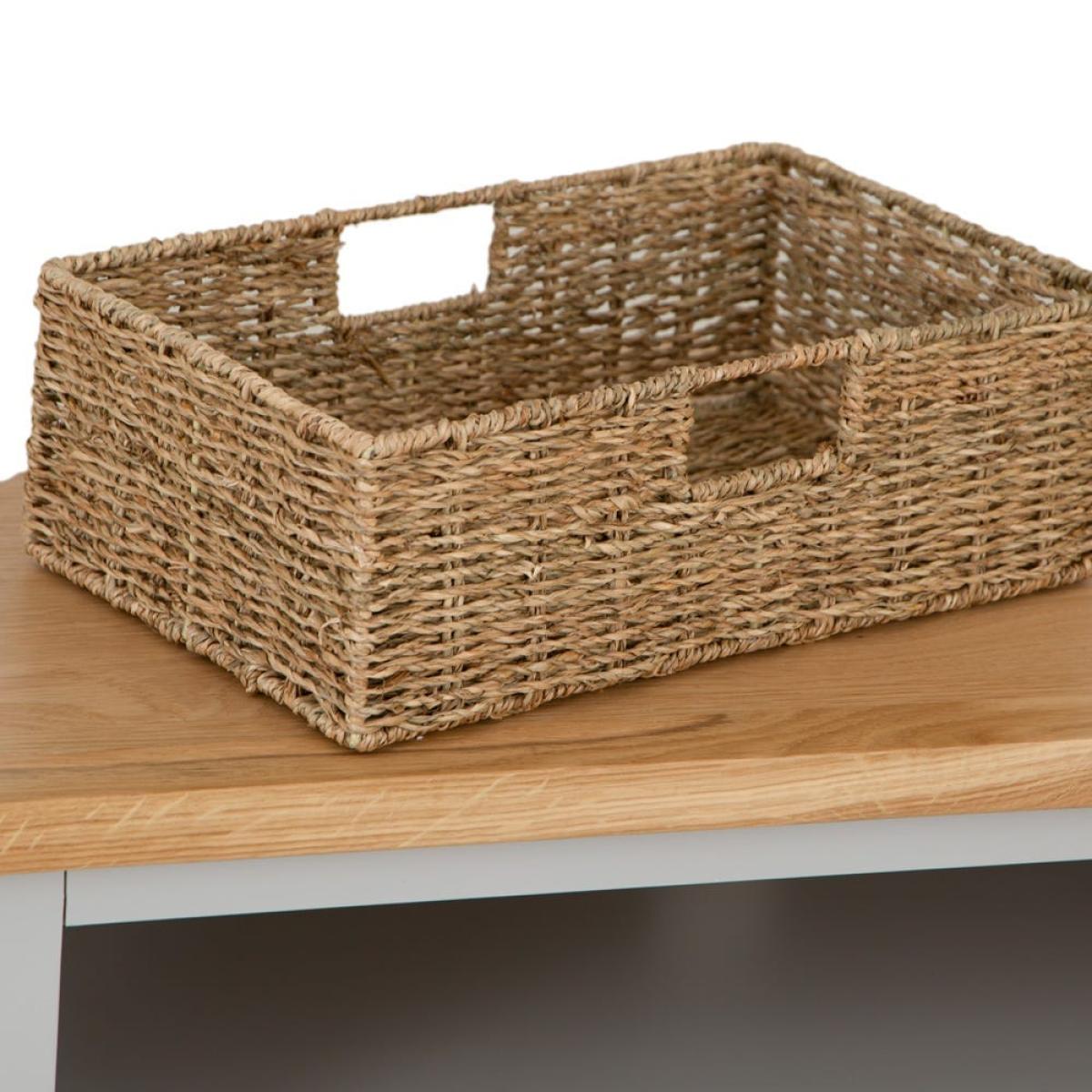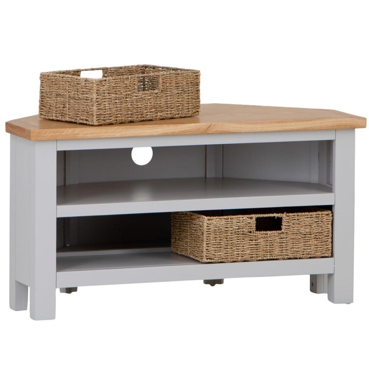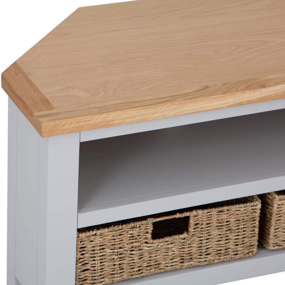 Enhance family movie nights with our Salisbury grey painted oak corner TV unit with wicker baskets. The top is D-shaped to sit unobtrusively in the corner of your living room, and at 90cm wide, it accommodates mid-sized TVs with room for some decorative touches too. Our elegant pale grey is a classic neutral that fits seamlessly into any space. Seagrass wicker baskets add a natural feel, and you can pull them out to rifle through their contents for that ever-elusive remote. The shelf is custom-designed for your DVD or Blu-ray player with a hole to keep wires tidy too.