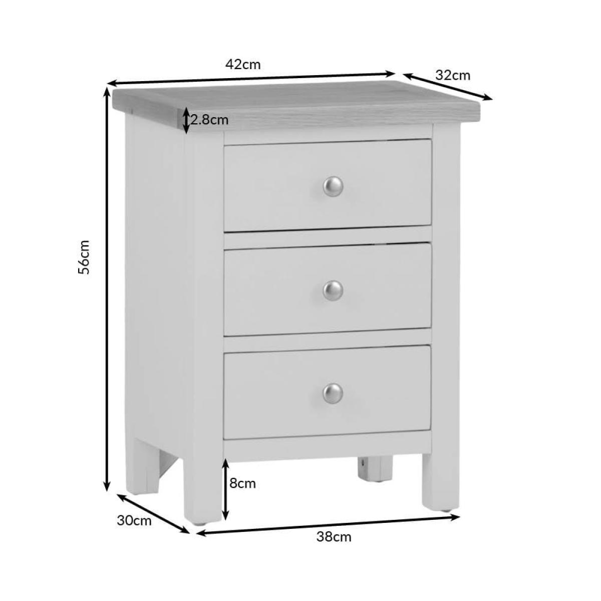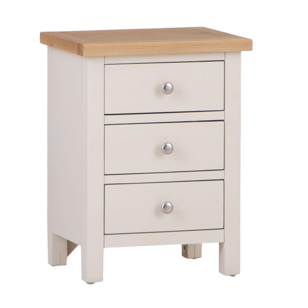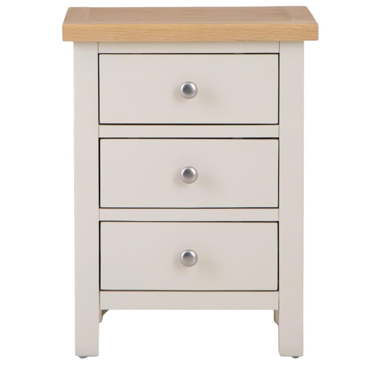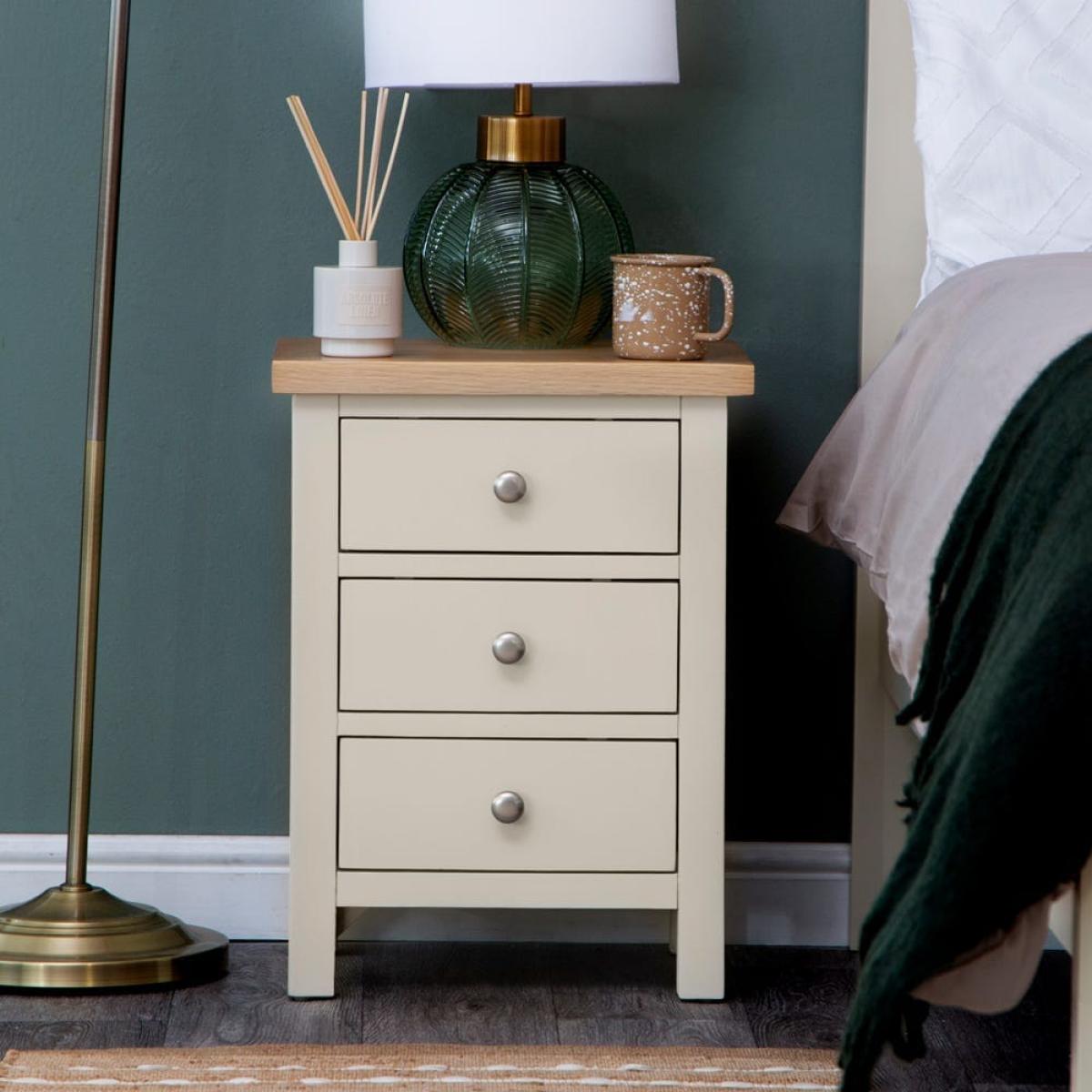 Curl up in bed with a good book next to our Salisbury ivory painted oak 3-drawer bedside table. The natural oak top is the perfect size for a reading lamp and your bedtime essentials – whether you’re an earplugs aficionado or an eye-mask devotee. There are three drawers for tablets and phones so you can preserve your no-screen zone, too. The warm ivory hue brings a calming feel into your bedroom to enhance your bedtime routine, and stylish chrome knob handles add discreet opulence. This item requires no assembly, so you can simply set it up and snuggle down.