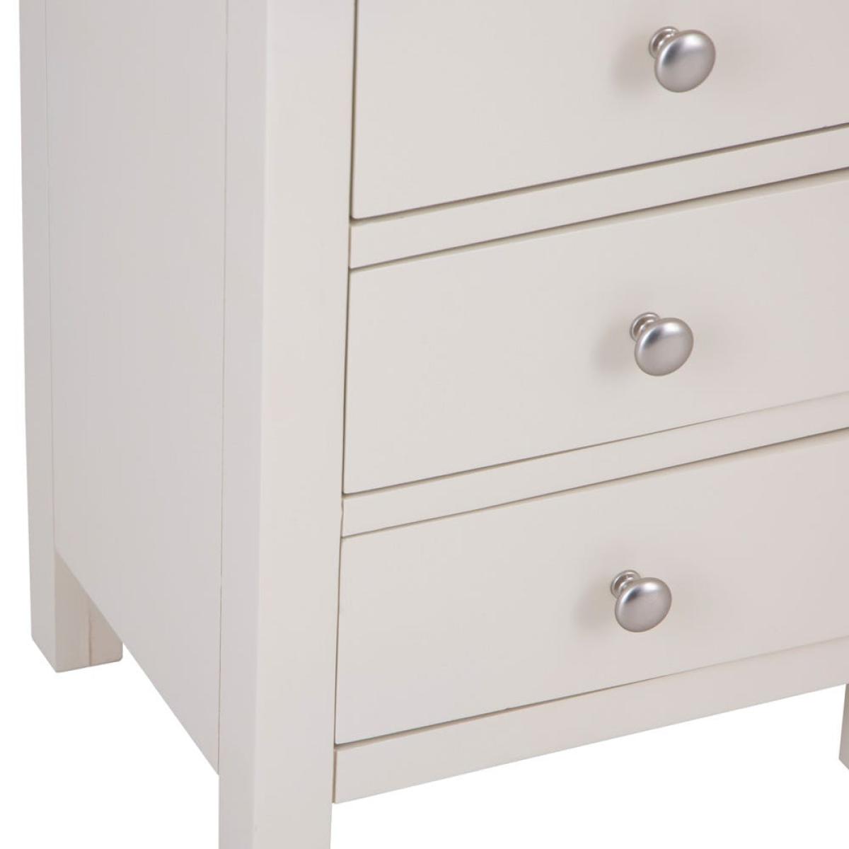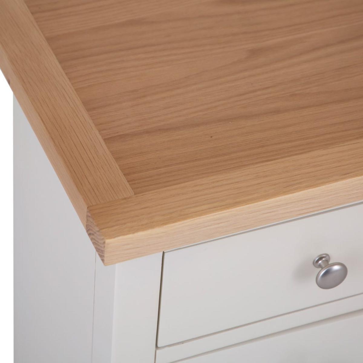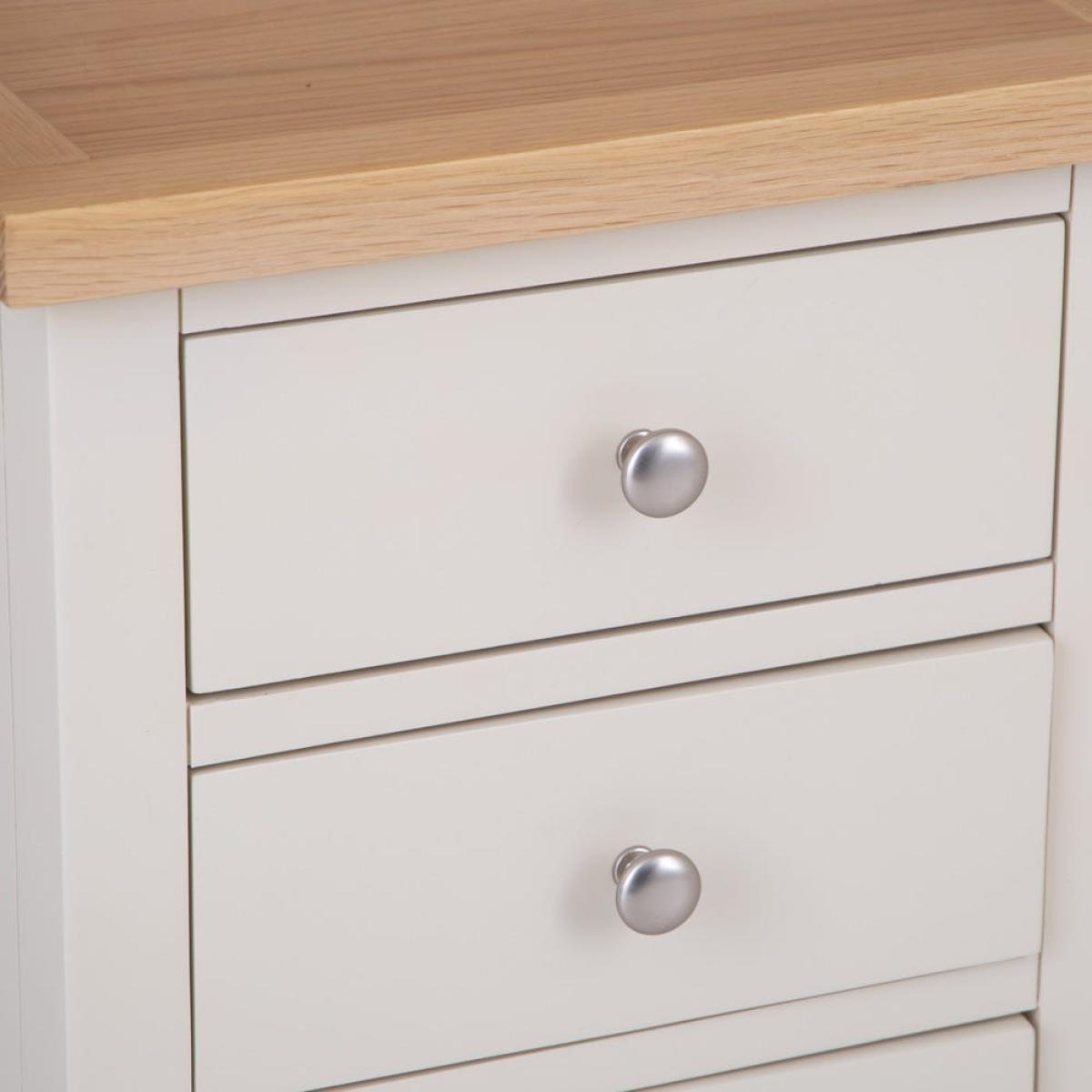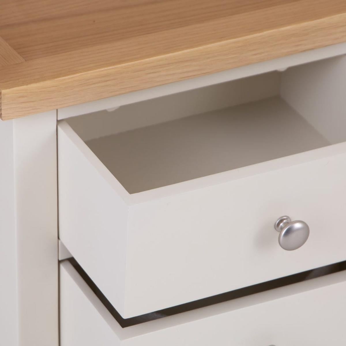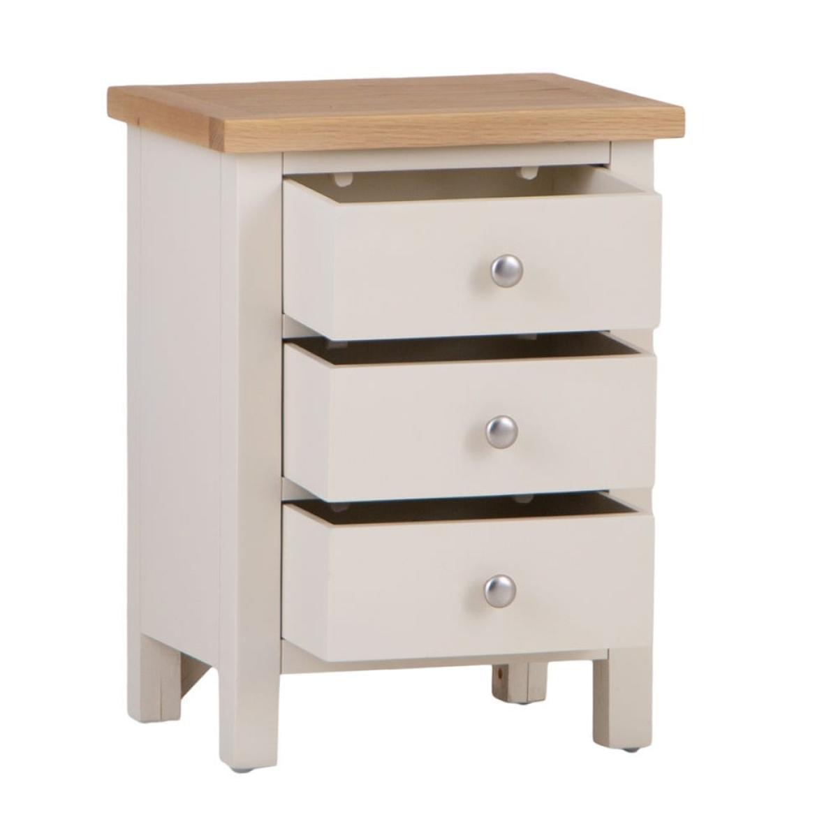 Curl up in bed with a good book next to our Salisbury ivory painted oak 3-drawer bedside table. The natural oak top is the perfect size for a reading lamp and your bedtime essentials – whether you’re an earplugs aficionado or an eye-mask devotee. There are three drawers for tablets and phones so you can preserve your no-screen zone, too. The warm ivory hue brings a calming feel into your bedroom to enhance your bedtime routine, and stylish chrome knob handles add discreet opulence. This item requires no assembly, so you can simply set it up and snuggle down.
