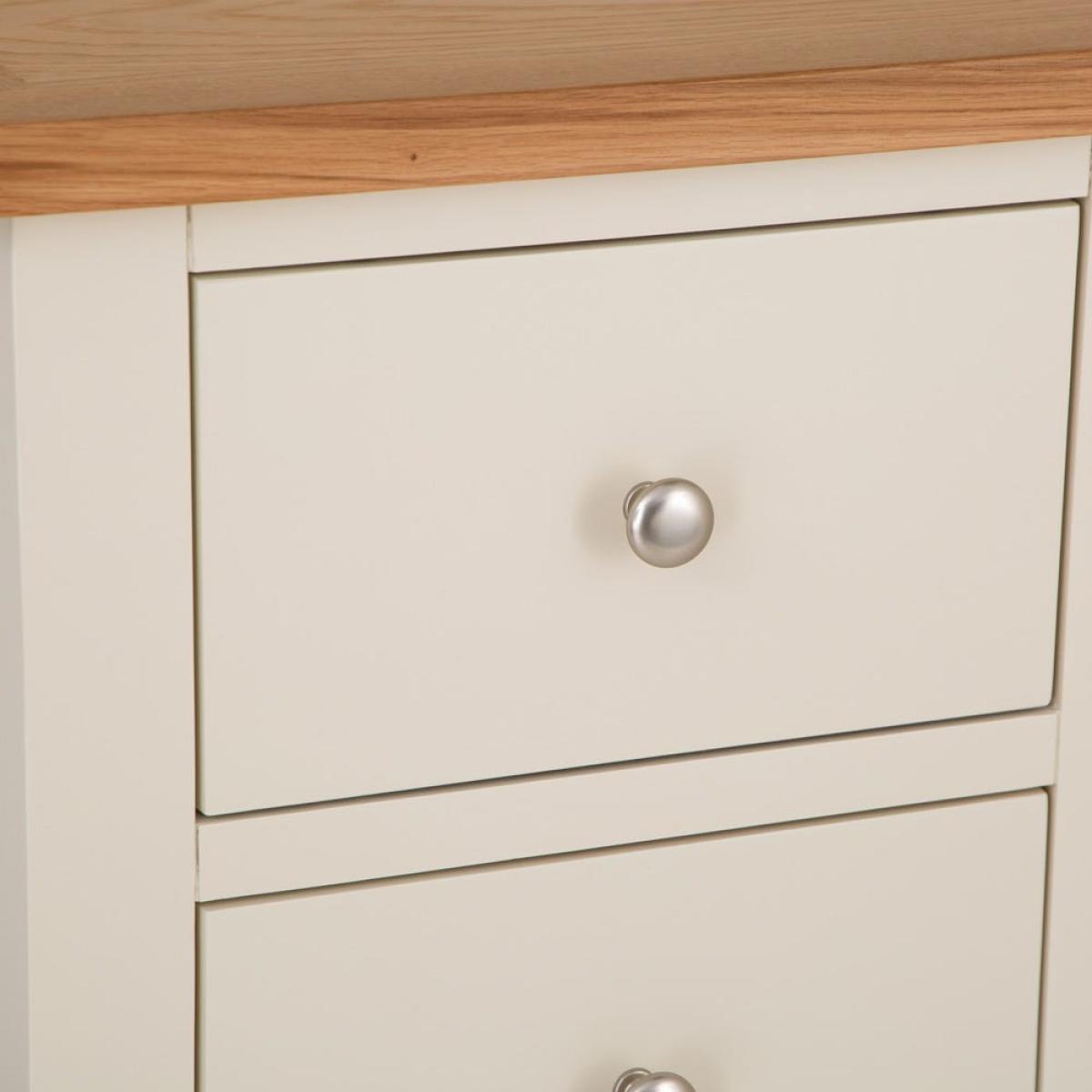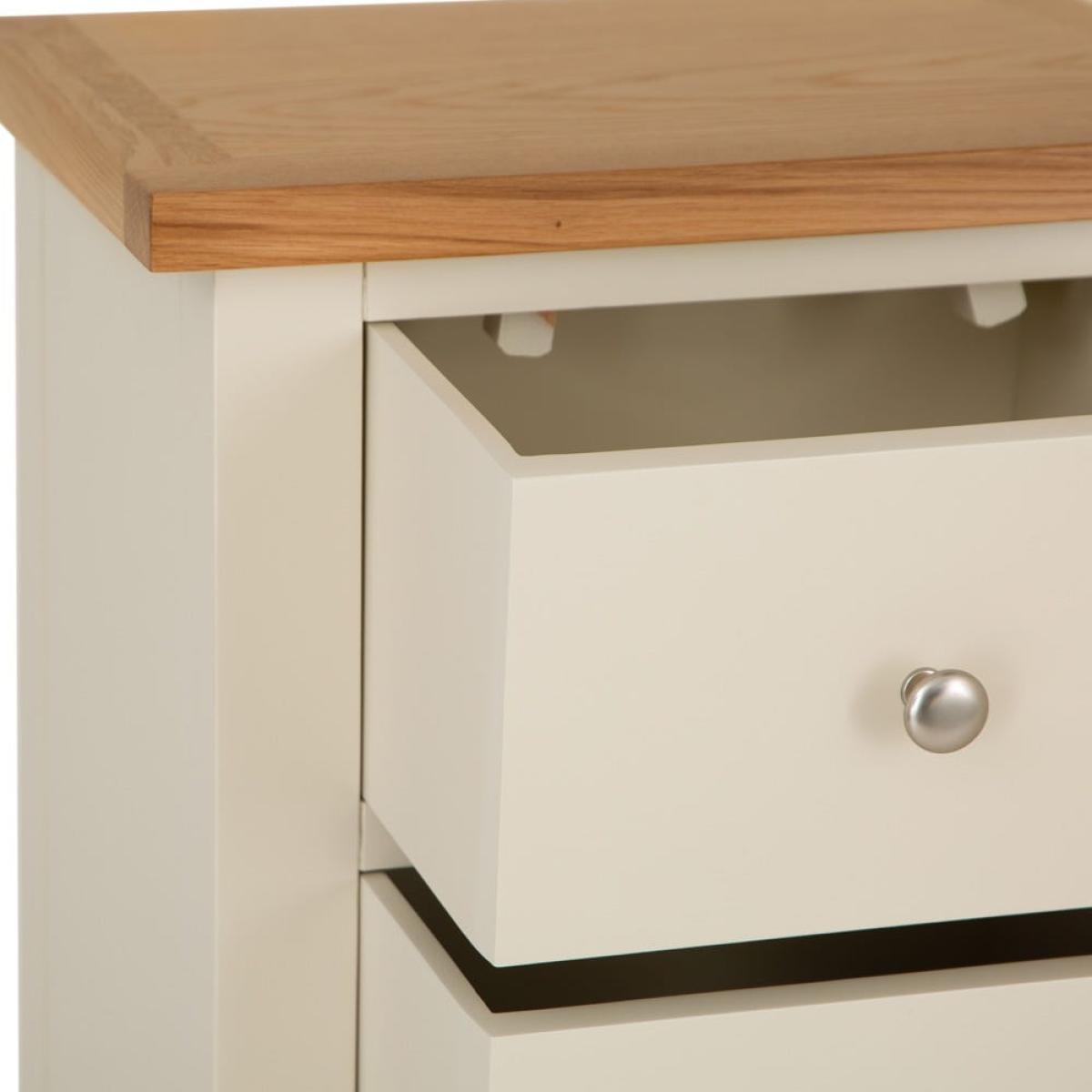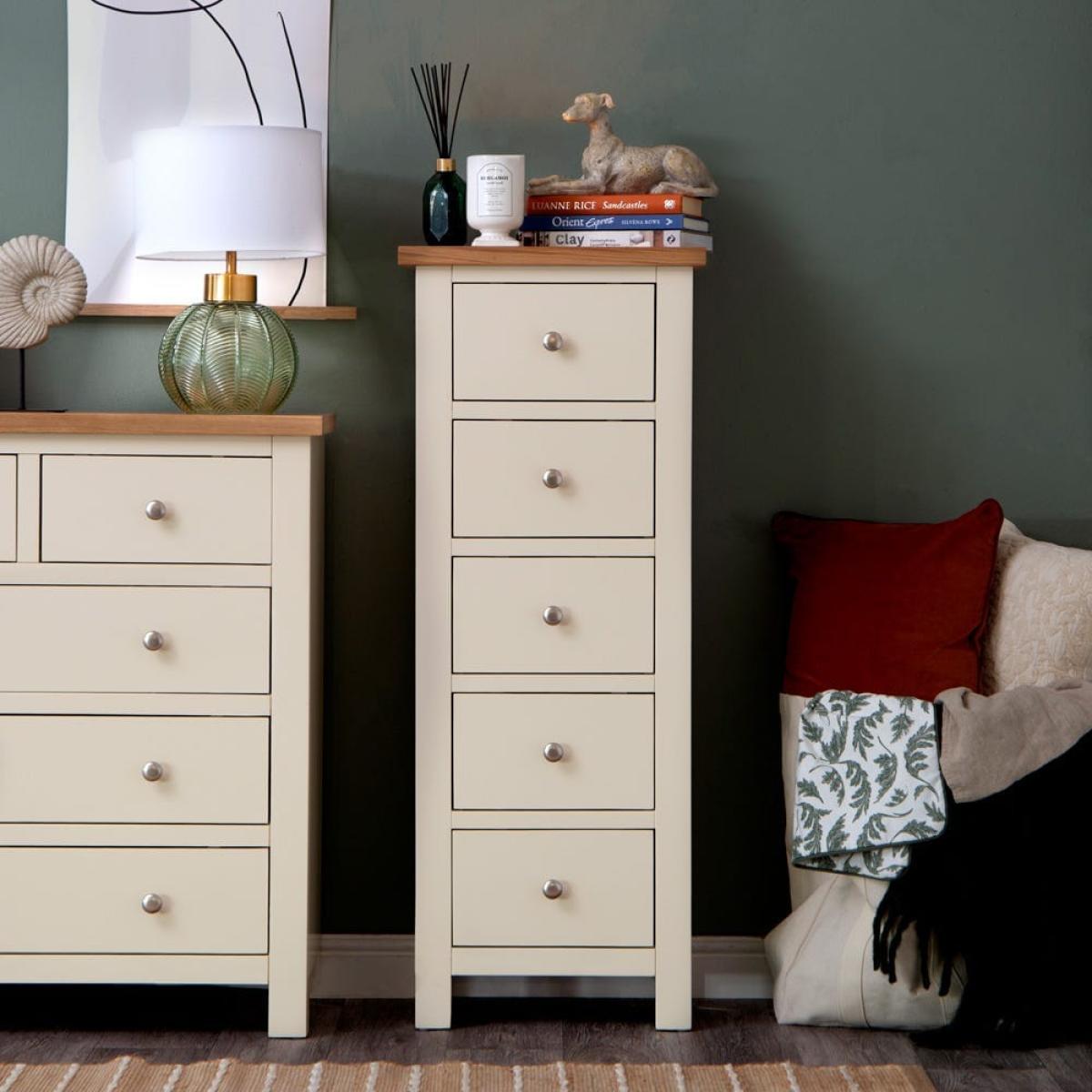 I love this tallboy’s clean, fresh look thanks to the soft ivory painted finish paired with the natural oak top - it strikes a lovely balance between classic and relaxed contemporary styles. It’s versatile enough to work well in both traditional settings, like shabby chic or coastal interiors, as well as more modern schemes that embrace light, neutral palettes. Practical styling tips include adding a few decorative bowls or trays on top to keep everyday essentials handy, and using colourful or patterned storage boxes in the drawers to keep organised without sacrificing style. It’s a great piece for bedrooms, hallways, or even as an accent in living spaces, providing both storage and visual interest without overwhelming the room.