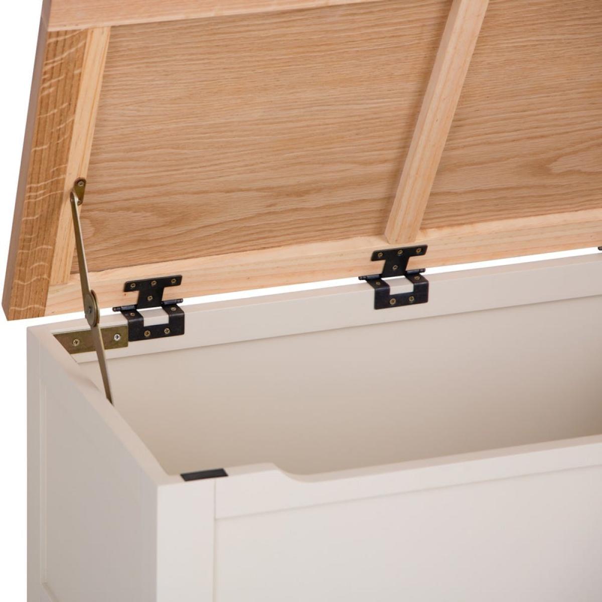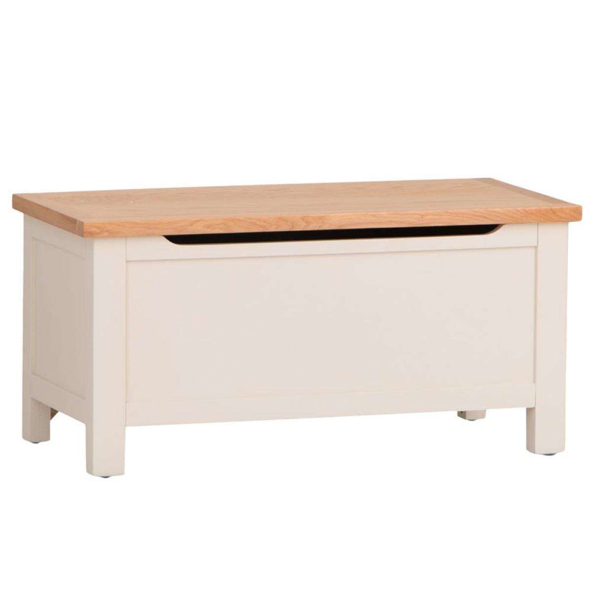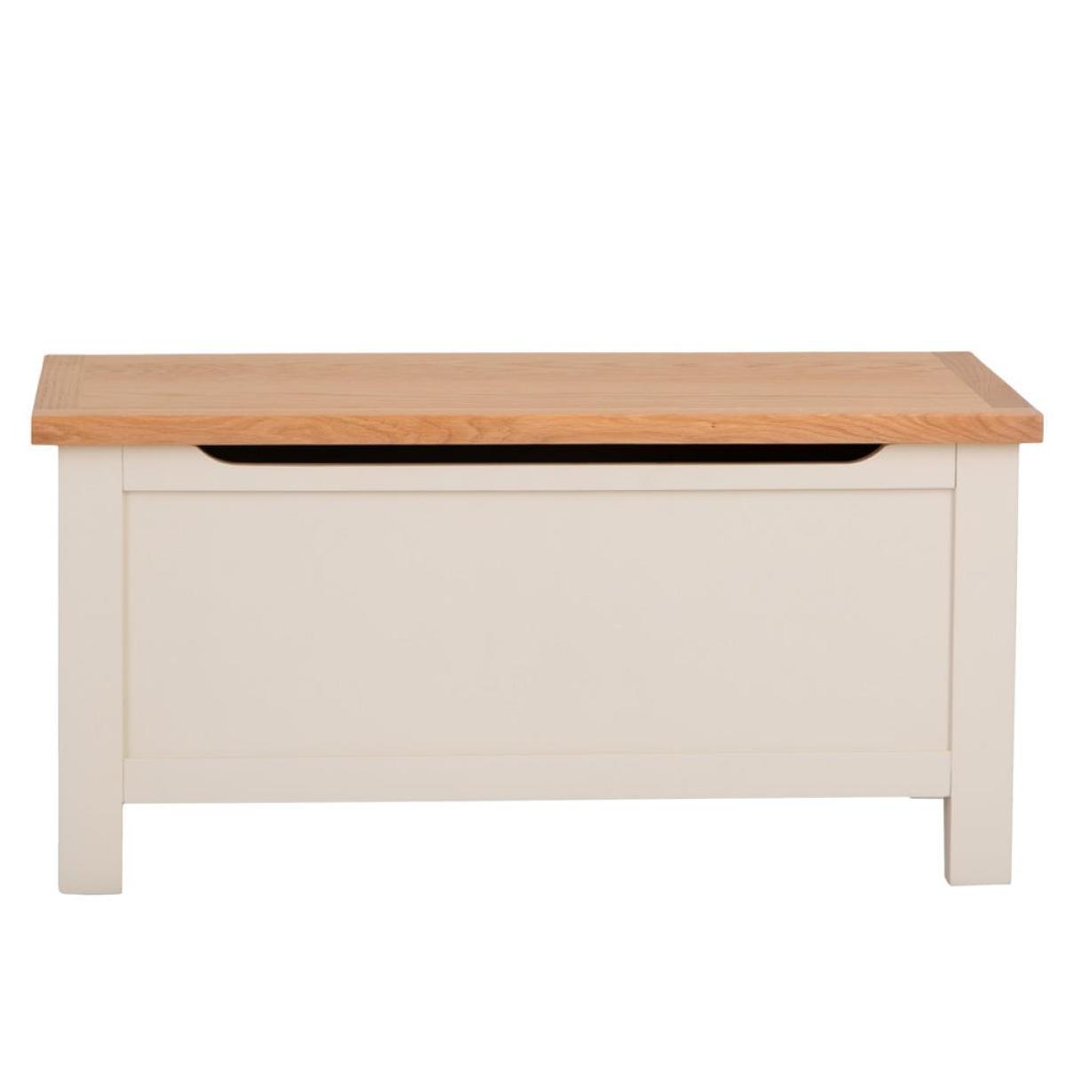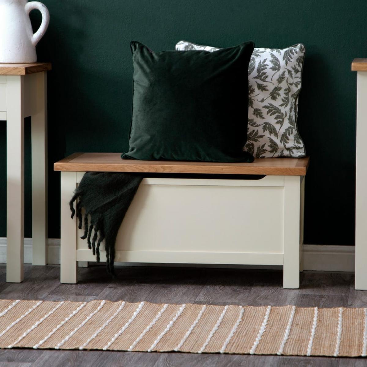 Keep spare throws, quilts and cushions neatly stowed away in this elegant Salisbury ivory painted oak blanket box. It’s the perfect size to sit neatly at the foot of a double bed, and it makes a handy seat when you’re getting ready too. Our much-loved ivory hue flatters any style of bedroom, and the natural oak top provides a complementary pared-back charm. A stay hinge keeps the lid open when you need to rummage around for elusive sports kit. You could also use this box in a hallway for wellies and outdoor games, or in a kid’s bedroom for stuffed animals and toys.