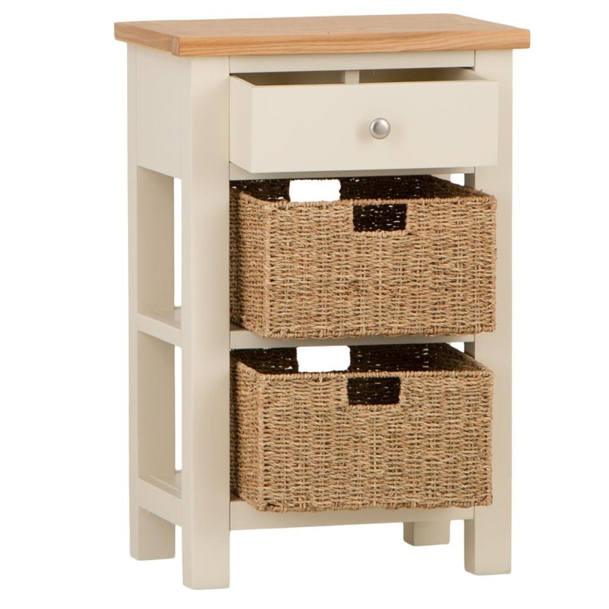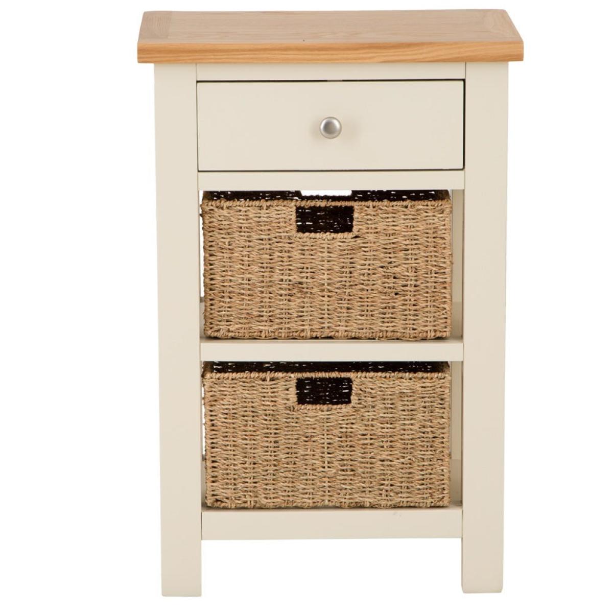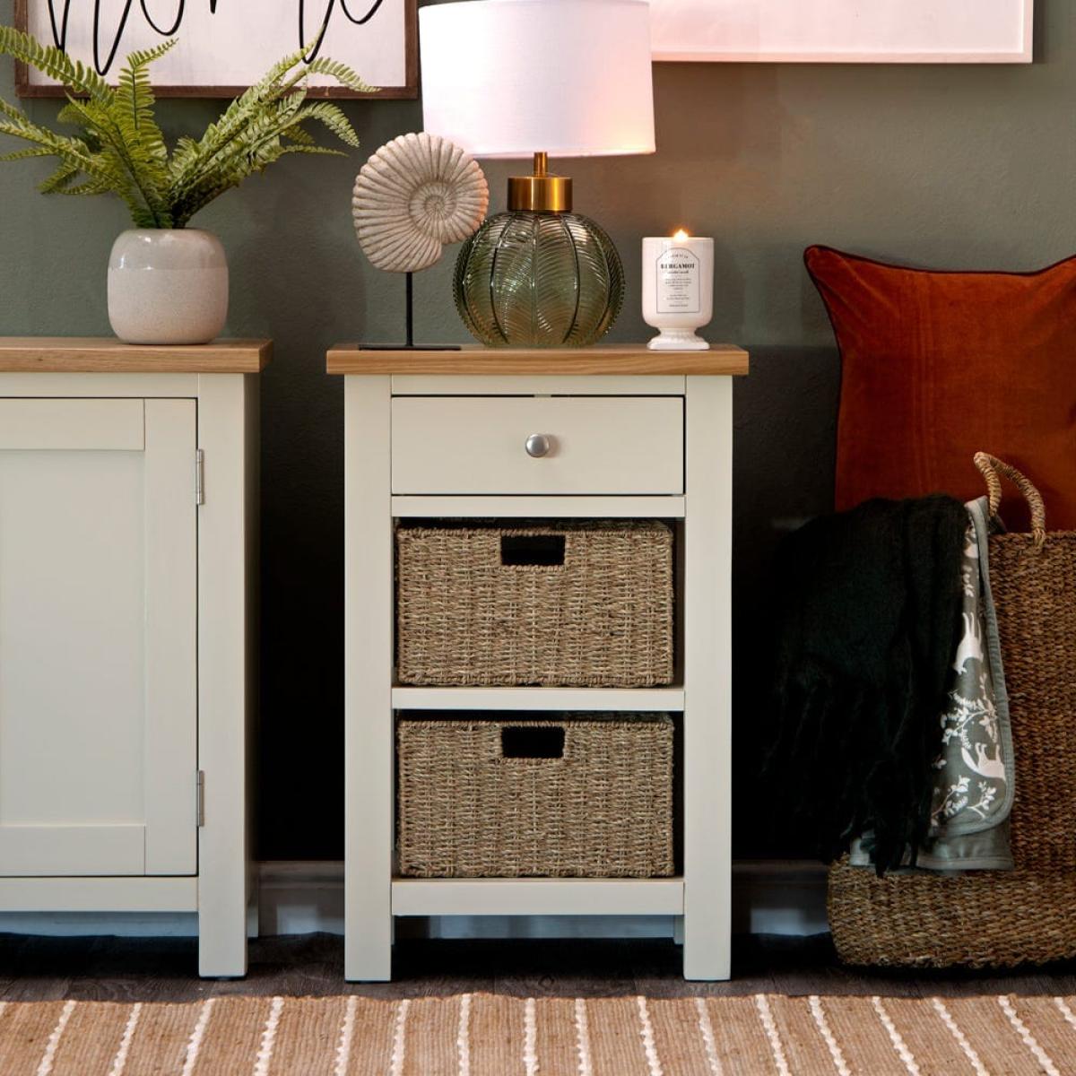 I love this piece because it combines functionality with a warm, classic look. The ivory painted oak finish gives it a versatile, timeless appeal that works well in both traditional and modern interiors. Its compact size makes it ideal for hallways, living rooms, or bedrooms where space is at a premium, while the wicker baskets provide practical storage options for everyday items like mail, keys, or small accessories. To style it effectively, consider pairing it with neutral or pastel tones to highlight the natural warmth of the wood, and add a few decorative accents such as fresh flowers or decorative vases on top to keep the look inviting and lived-in. Overall, this is a practical, stylish addition that can help keep clutter out of sight without compromising on aesthetic.