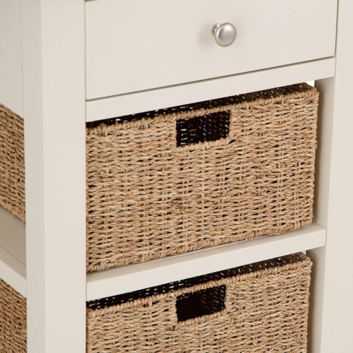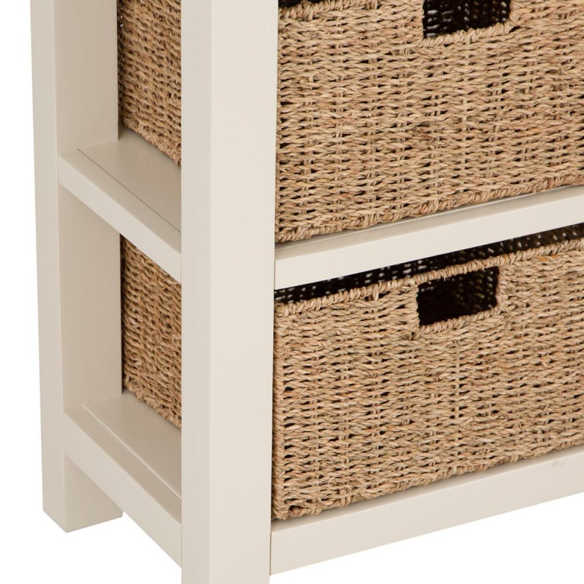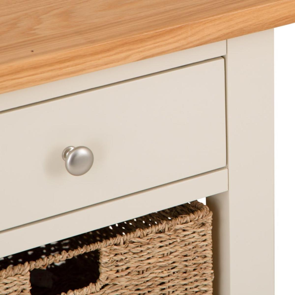 I love this piece because it combines functionality with a warm, classic look. The ivory painted oak finish gives it a versatile, timeless appeal that works well in both traditional and modern interiors. Its compact size makes it ideal for hallways, living rooms, or bedrooms where space is at a premium, while the wicker baskets provide practical storage options for everyday items like mail, keys, or small accessories. To style it effectively, consider pairing it with neutral or pastel tones to highlight the natural warmth of the wood, and add a few decorative accents such as fresh flowers or decorative vases on top to keep the look inviting and lived-in. Overall, this is a practical, stylish addition that can help keep clutter out of sight without compromising on aesthetic.