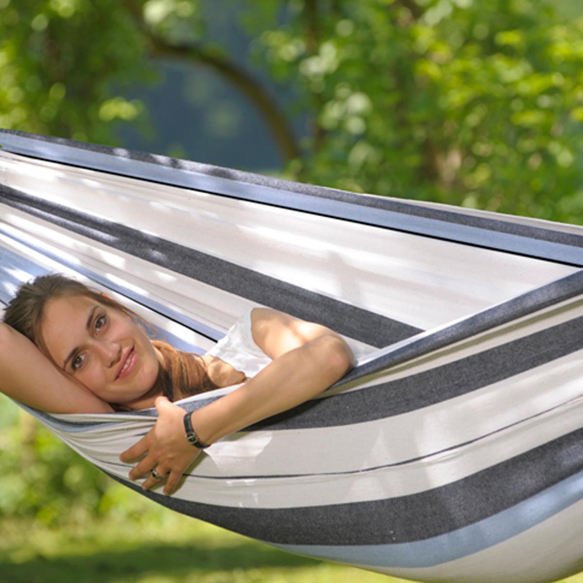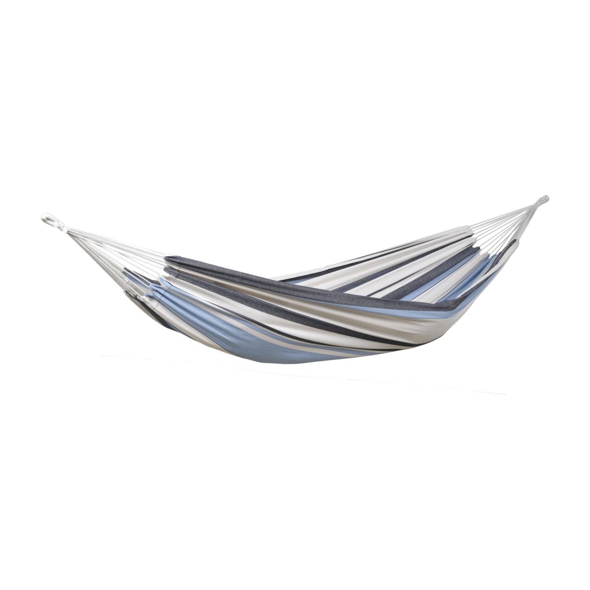 The Salsa Hammock is in beautiful shades of blue and white, which evokes memories of the sea, and instantly helps you to feel relaxed and content. The Salsa Hammock is made from Ell. Tex, a tough specialist fabric which is designed to be as soft as pure cotton, yet extremely strong, long-lasting and also weatherproof. Perfect for the British Summer.