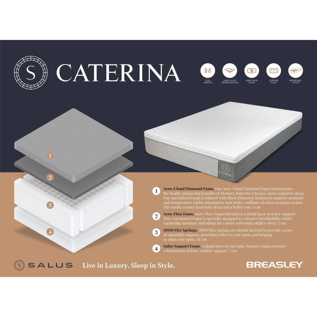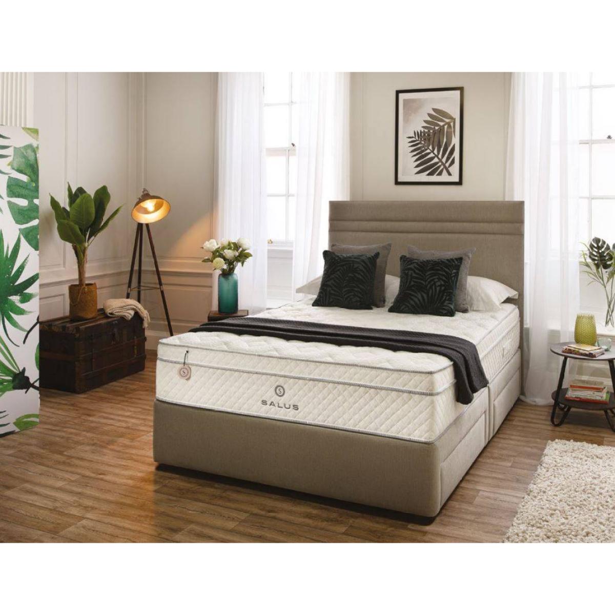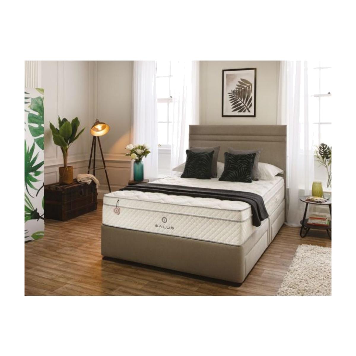 The Caterina by Salus is a mattress made to give you an enhanced sleep with not just support, but also luxury. It features 3000 Flex Pocket Springs, Aero-Cloud Diamond Foam and a 2cm layer of Aero-Flow Foam which Salus distinctively designed to give you a refreshing and more energising sleep. Please note that this includes the Salus Caterina Mattress and the Salus Platform Top Divan Base with your choice of storage option. The headboard pictured is not included but is available to purchase separately and you can browse our available Salus headboards here. The image shows the Divan Base with the 4 Drawer Option. Mattress Features 3000 Flex Springs - Double layered to provide a core of adaptable support, providing relief to your joints and helping to align your spine. Aero-Cloud Diamond Foam - Salus' Aero-Cloud Diamond Foam incorporates the health-enhancing benefits of Memory foam for a deeper, more complete sleep. The specialised Foam is infused with Black Diamond, helping to regulate moisture and temperature whilst adapting to your body's millions of micro pressure points. The result: a more luxurious sleep and a better you. Aero-Flow Foam - Introduces a plush layer of active support. This customised Foam is specially designed to enhance breathability whilst regulating moisture and odour for a more refreshing nights sleep. Salus Core Foam - 3cm layer of Salus Core Foam which provides an enhanced support to the core of your mattress. Salus Support Foam - A plush 4cm layer of Foam provides a foundation of firm, reliable support. Removable Cover - The mattress cover is removable and can be cleaned to ensure a fresh surface and a healthy night's sleep. Head to toe and edge to edge support - The foam encased edge support system ensures a maximized sleep surface all the way to the edge of your mattress. Stretch Quilted Cover - Soft to the touch and the use of fabric that stretches in all directions allows a person's body to sink into the bed and to be supported by the spring system. Easy Care - No need to turn, but regular rotation from head to toe will extend the mattresses life span. Product Details: Mattress and Divan Base available in Double, King and Super King sizes Platform Top Divan Base with the following Storage Options - No Storage, 2 Drawers, 2+2 Drawers and 4 Drawers Divan Base feet come as Chrome Glides as standard Mattress Depth - 28cm Mattress Tensions - Soft to Medium Mattress comes Boxed for easy storage 10 Year Guarantee Made in the UK Please note, we advise to unroll this mattress within 1 month of purchase to ensure it expands to its full flat size and the foam recovers to its intended comfort.
