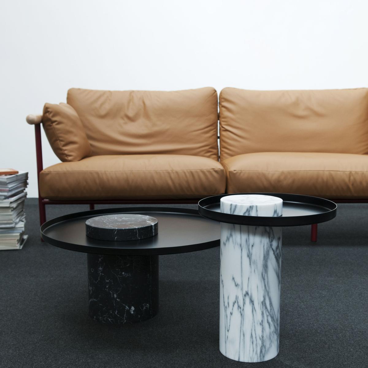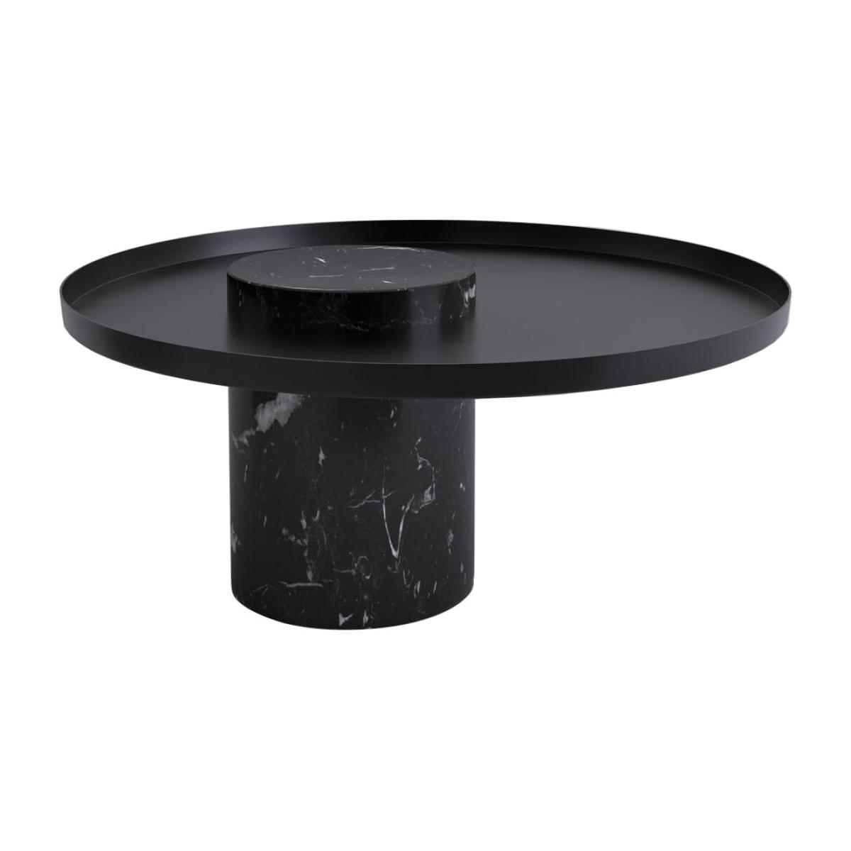 An incredible mix of styles and materials for this collection of refined yet modern coffee tables. These tables feature a sophisticated, sculptural construction that explores the notion of balance. They feature a slim, balancing Metal Tray perched atop an imposing Marble Column. The off-center top gives a sense of precarious balance that is only apparent. In reality, the table is perfectly stable thanks to the solid marble Base that acts as a counterweight. The massive lines of the Marble Column and its classic style are counterbalanced by the visual lightness of the Tray.