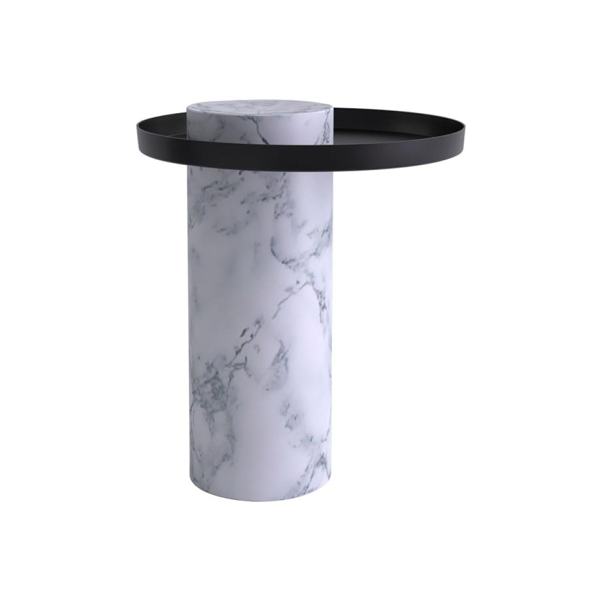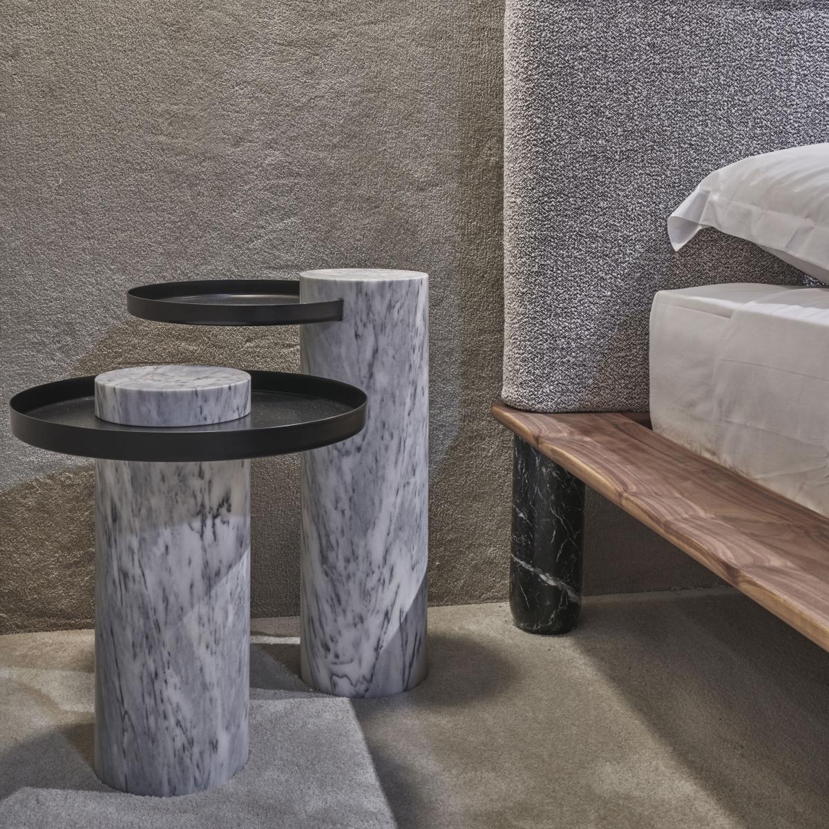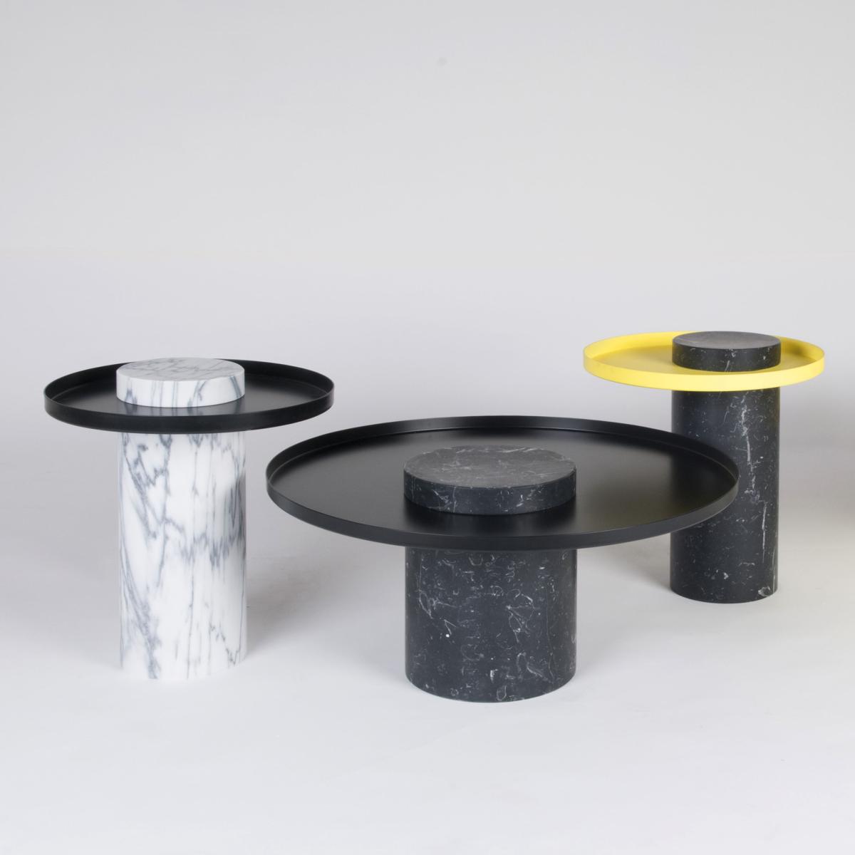An incredible mix of styles and materials for this collection of refined yet modern coffee tables. These tables feature a sophisticated, sculptural construction that explores the notion of balance. They feature a slim, balancing Metal Tray perched atop an imposing Marble Column. The off-center top gives a sense of precarious balance that is only apparent. In reality, the table is perfectly stable thanks to the solid marble Base that acts as a counterweight. The massive lines of the Marble Column and its classic style are counterbalanced by the visual lightness of the Tray.